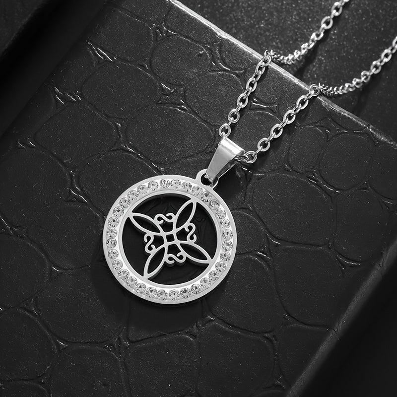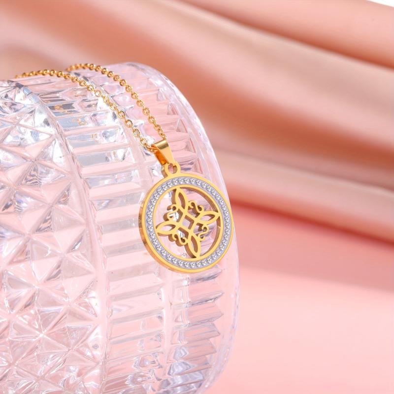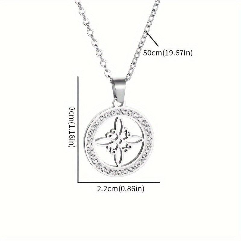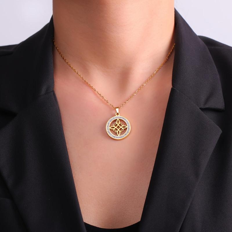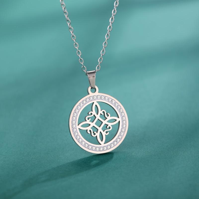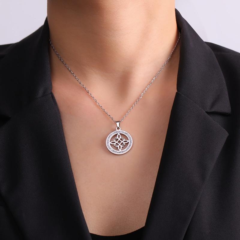 This stainless steel necklace features a witch knot round pendant with synthetic cubic zirconia accents, making it versatile for daily and party wear all season long.