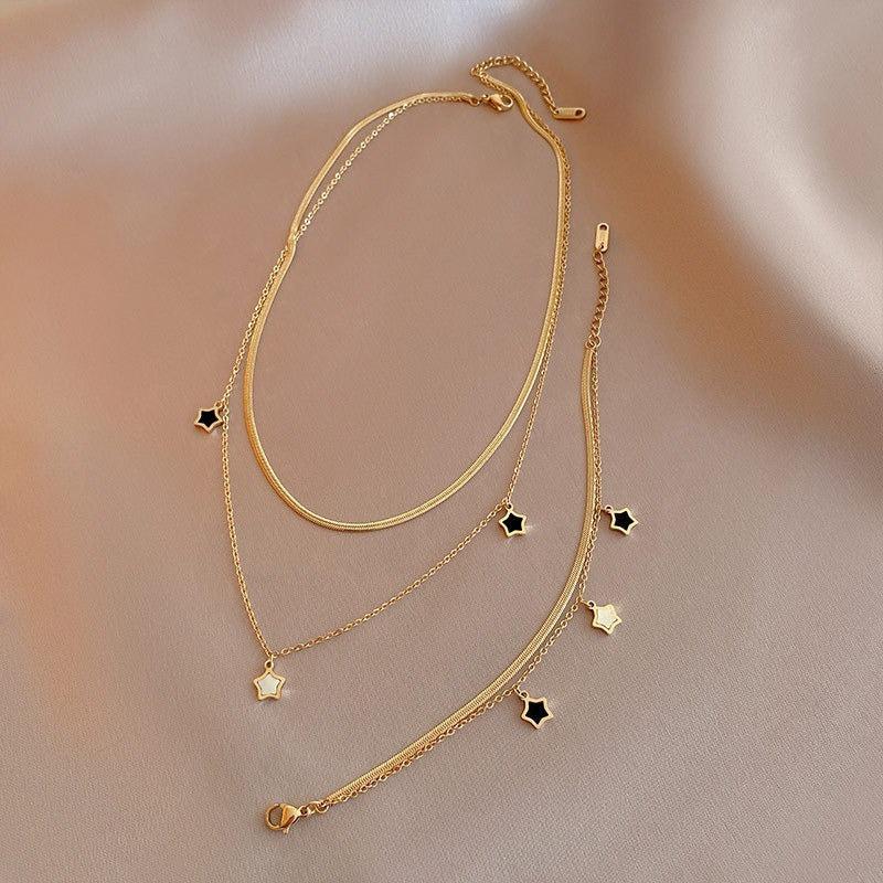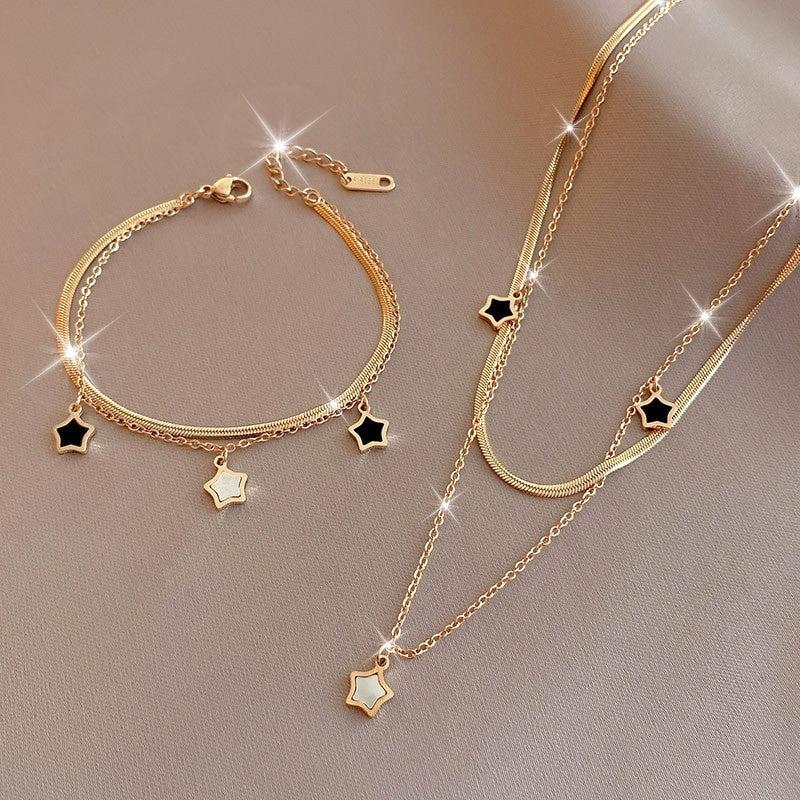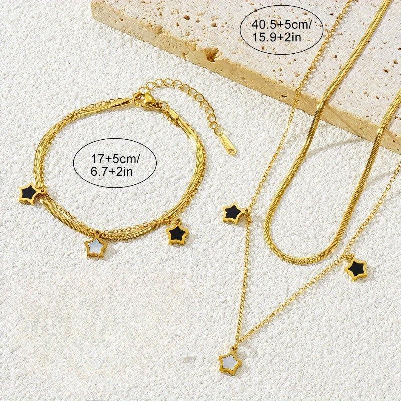 Elevate your look with this stunning stainless steel star necklace and bracelet set. Perfect for banquets, ceremonies, parties, vacations, or as a thoughtful gift. This high-end, hypoallergenic set features a minimalist French design.