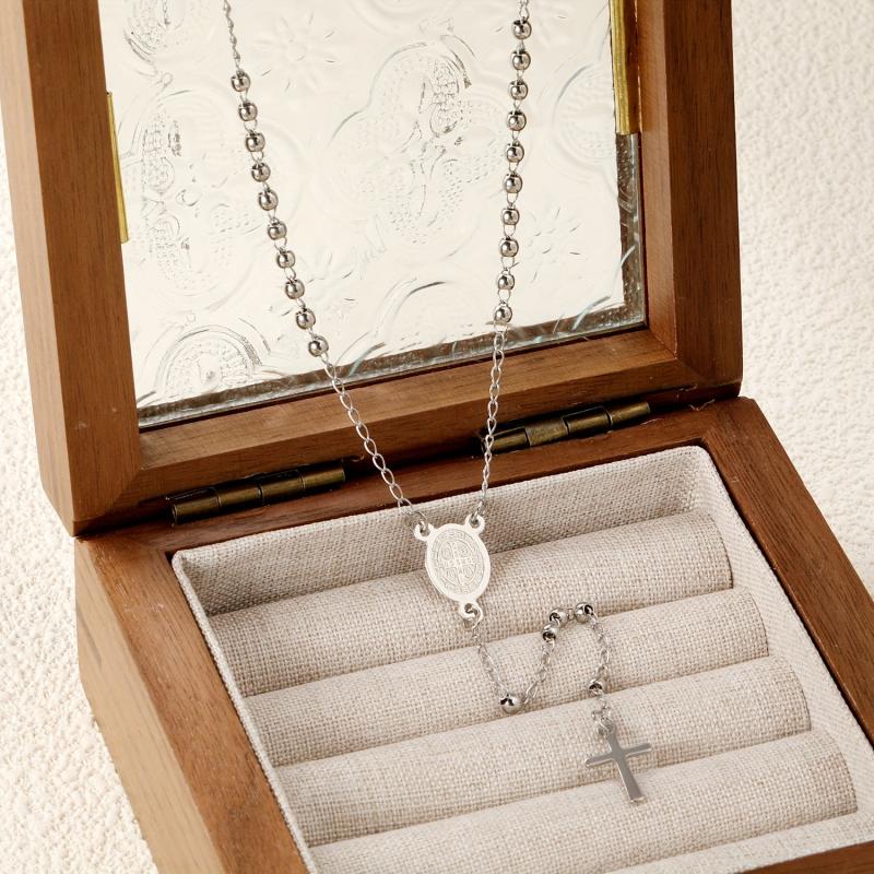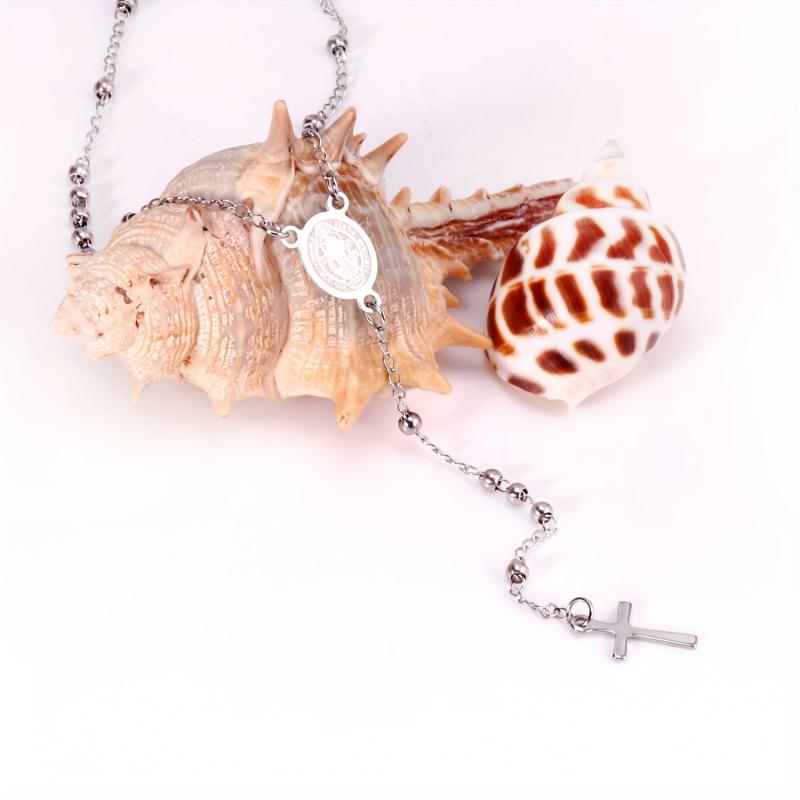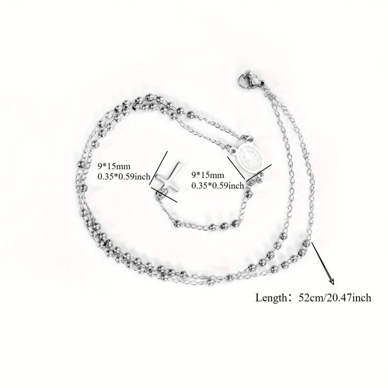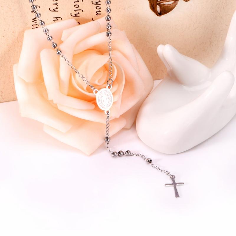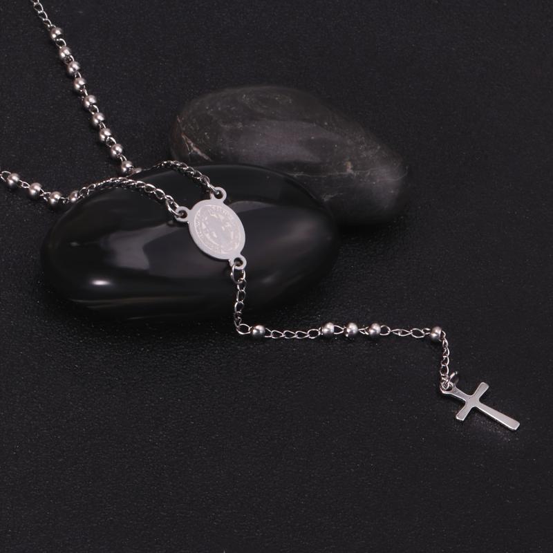 Elegant stainless steel necklace featuring a Virgin Mary cross pendant and round beads. Ideal for casual wear, festive celebrations, ceremonies, and important events.