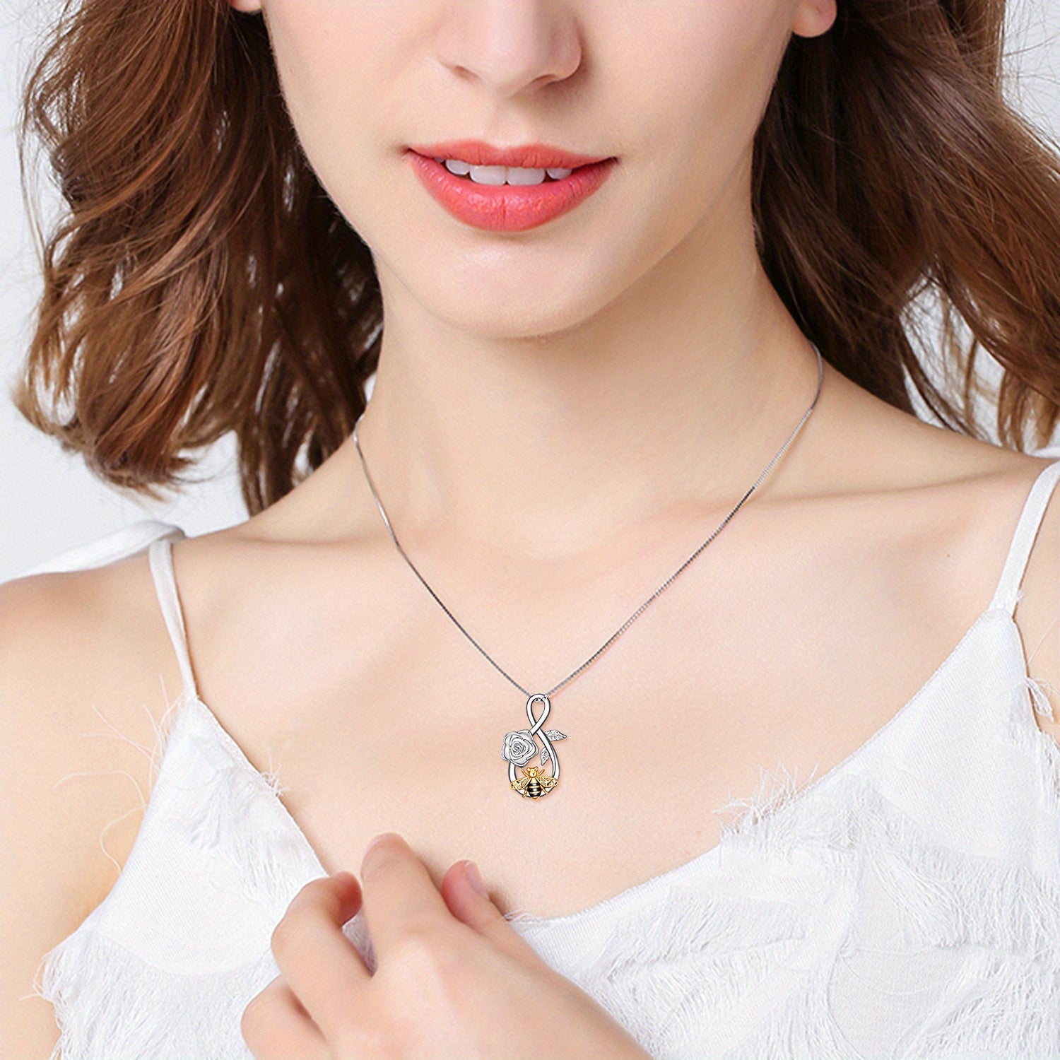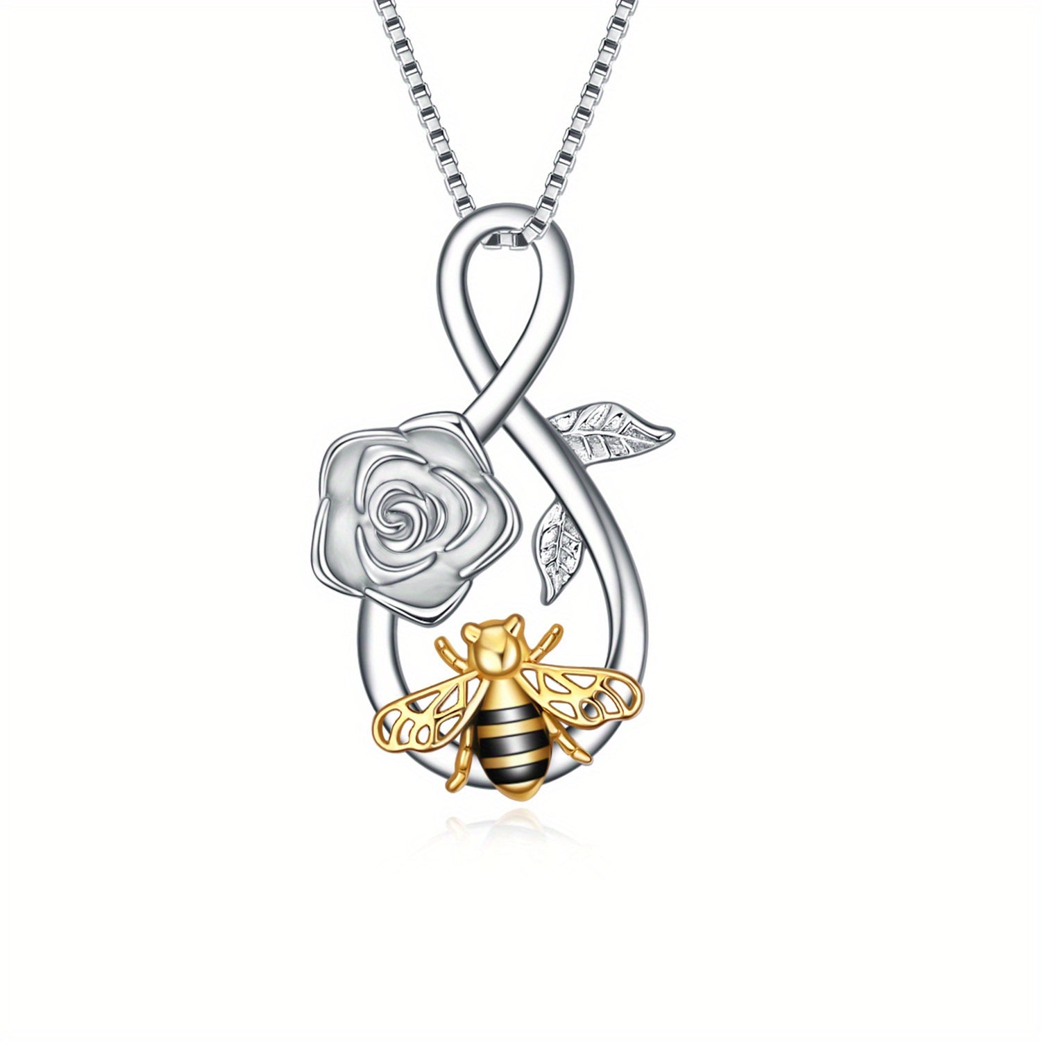 Sterling Silver Bee Pendant Necklace with Rose Flower for Women