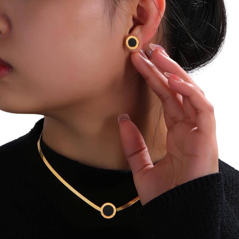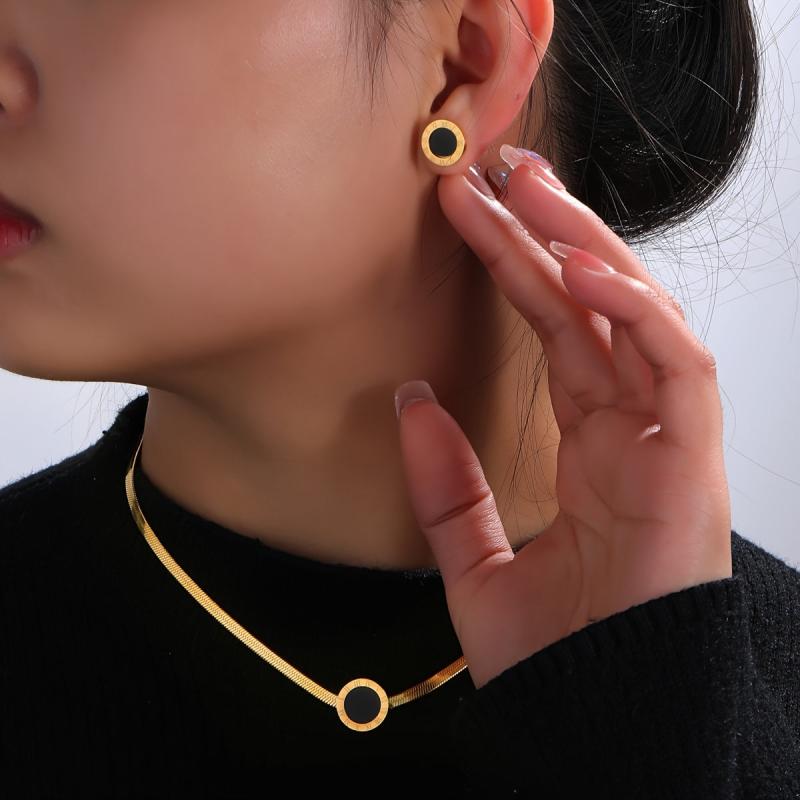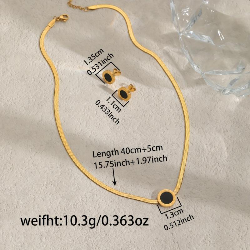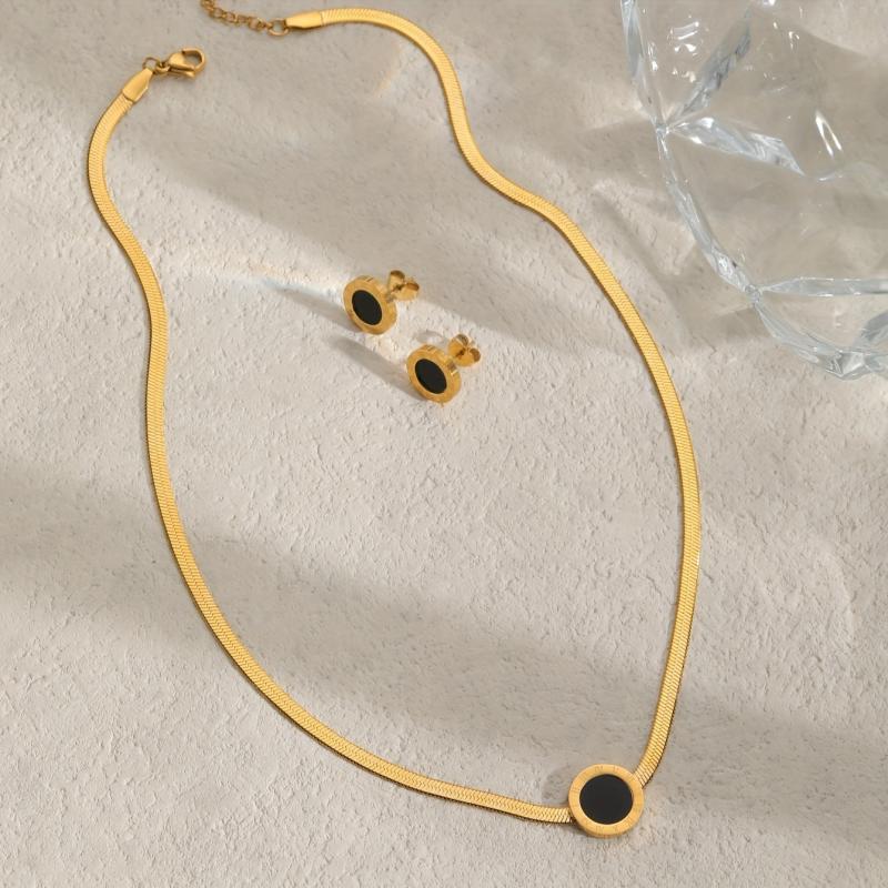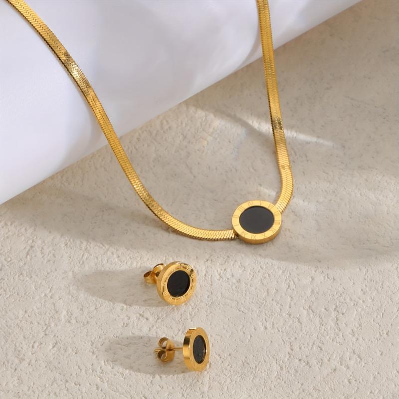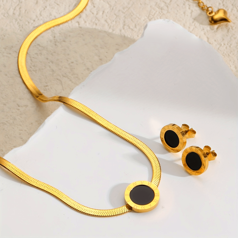 Elegant three-piece jewelry featuring stainless steel pendant necklace and earrings with Roman numeral design. Ideal for women to accessorize on vacations.