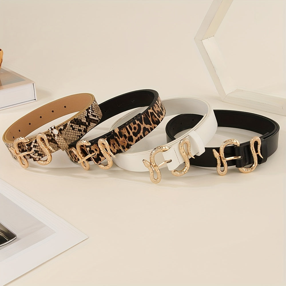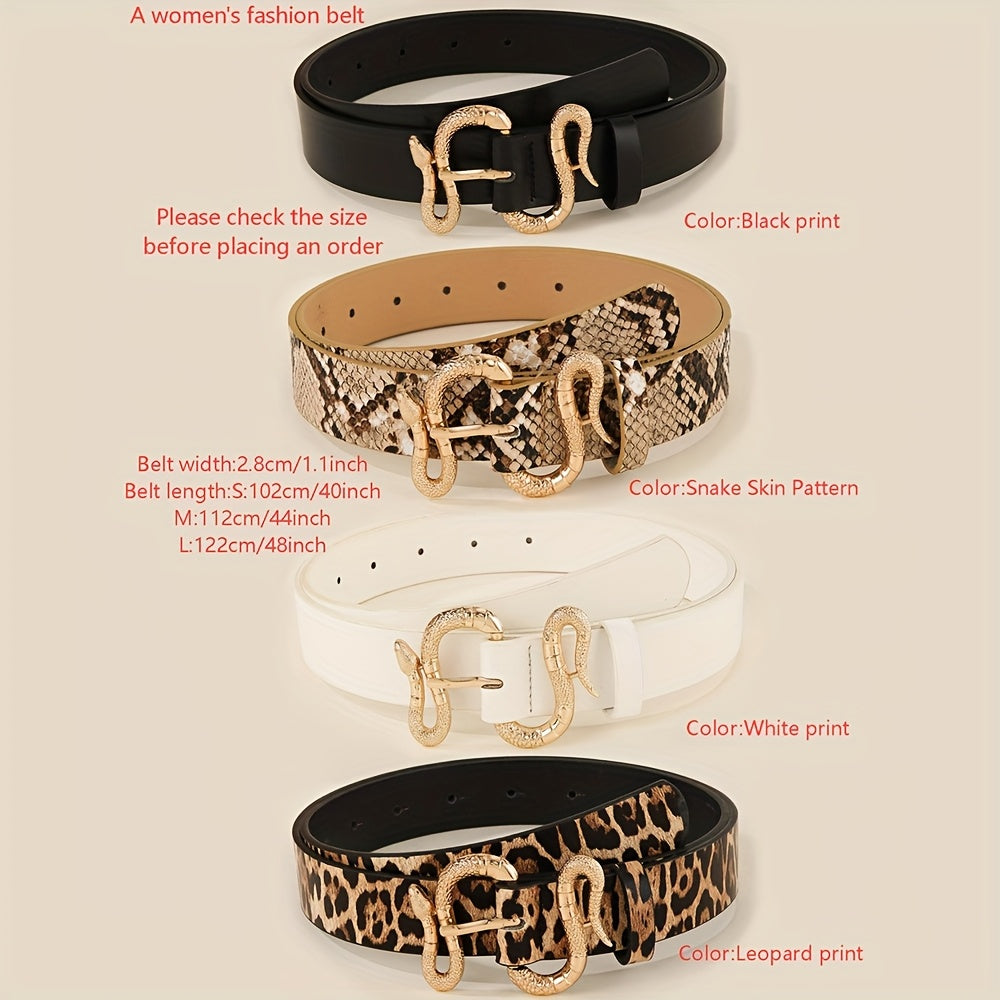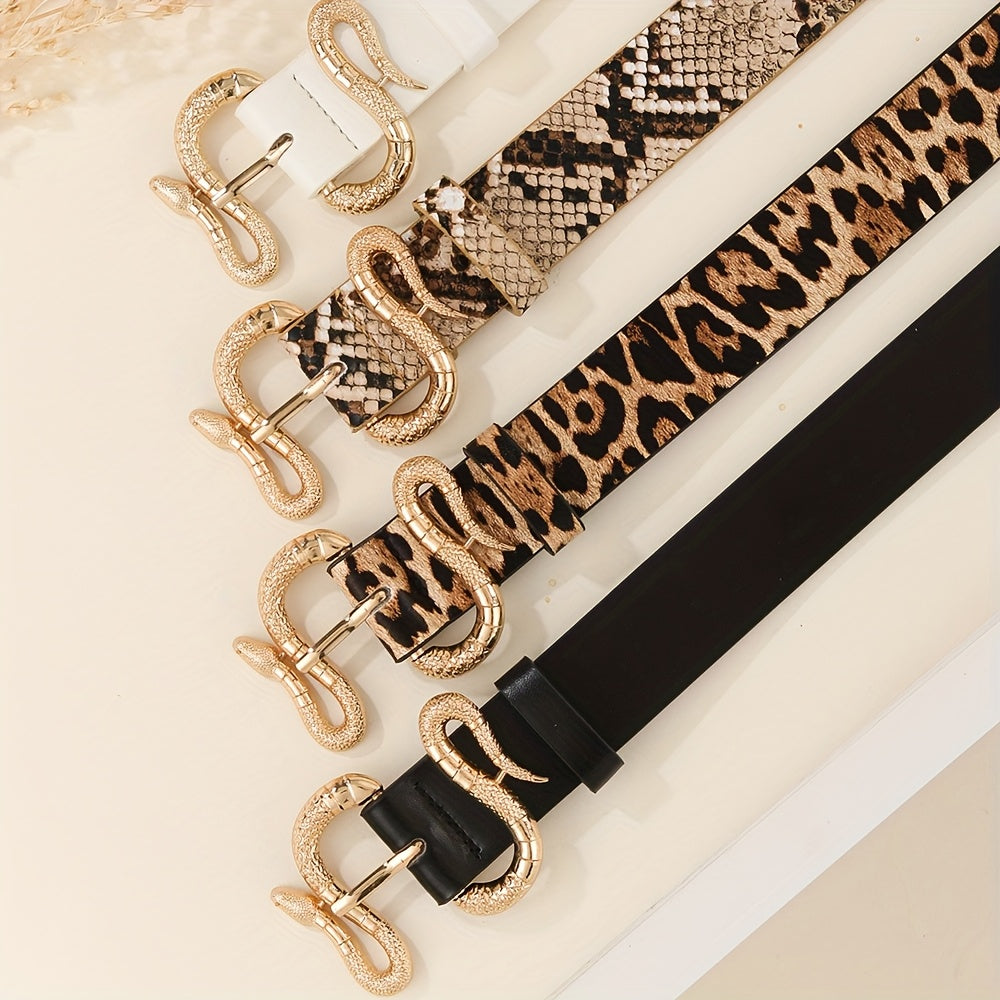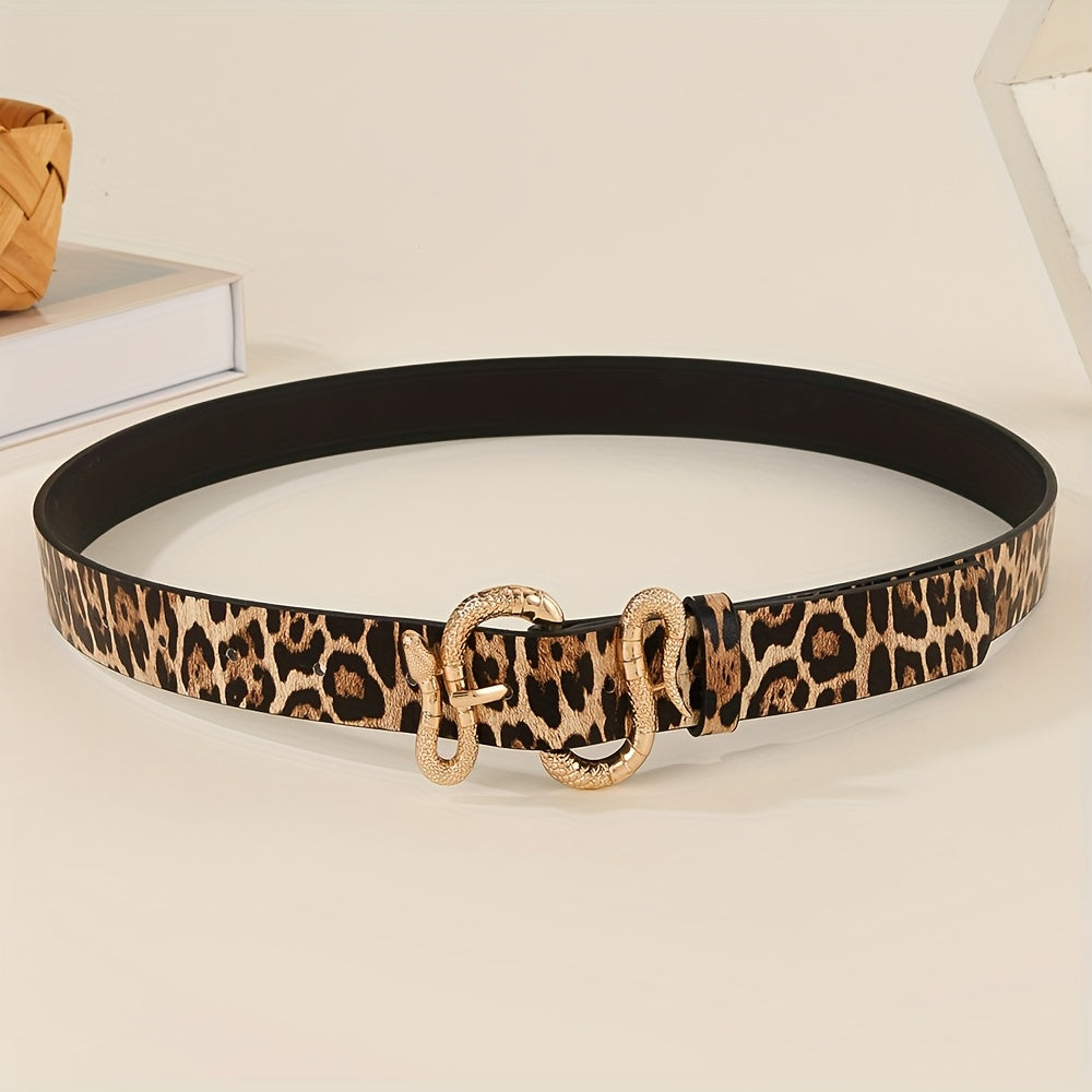 Add a touch of wild style to your outfit with this trendy belt featuring a snake buckle, leopard print design, and golden toned metal accents. Perfect for casual wear, beach outings, and festivals.