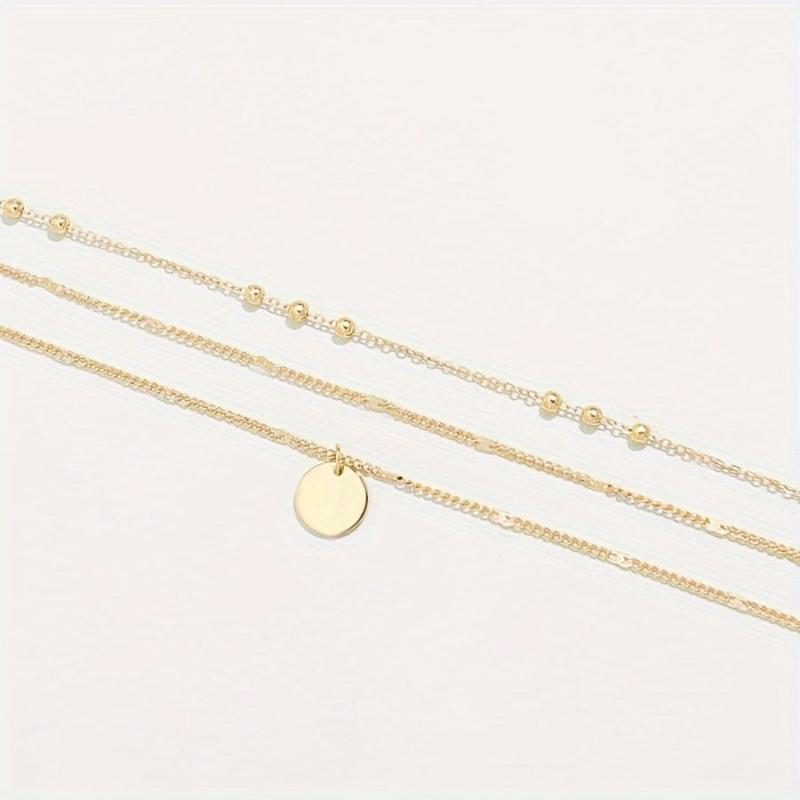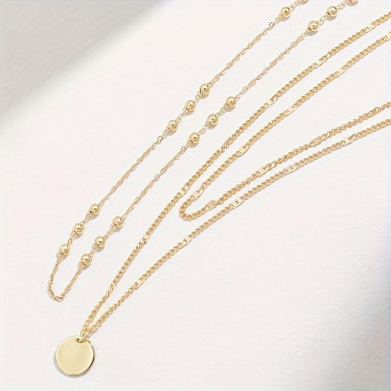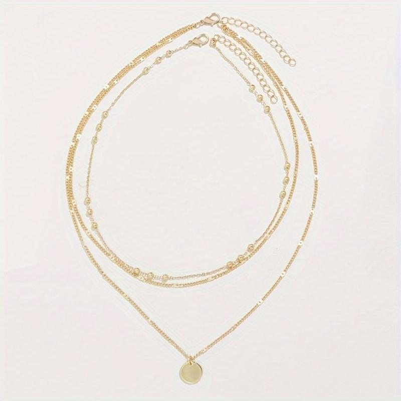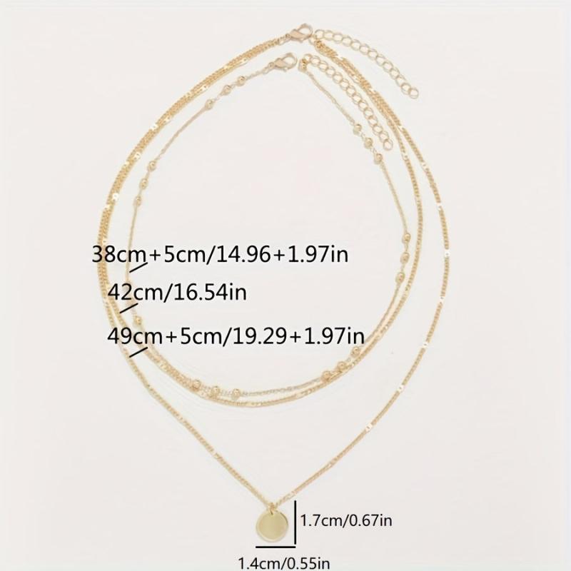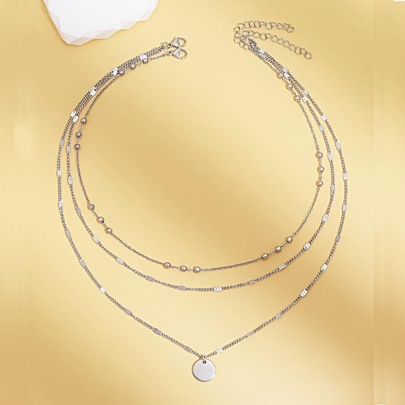 This versatile piece features a three-layer necklace set with a chic design. It includes a statement disc pendant and a clavicle chain. Perfect for adding a stylish touch to your outfit.