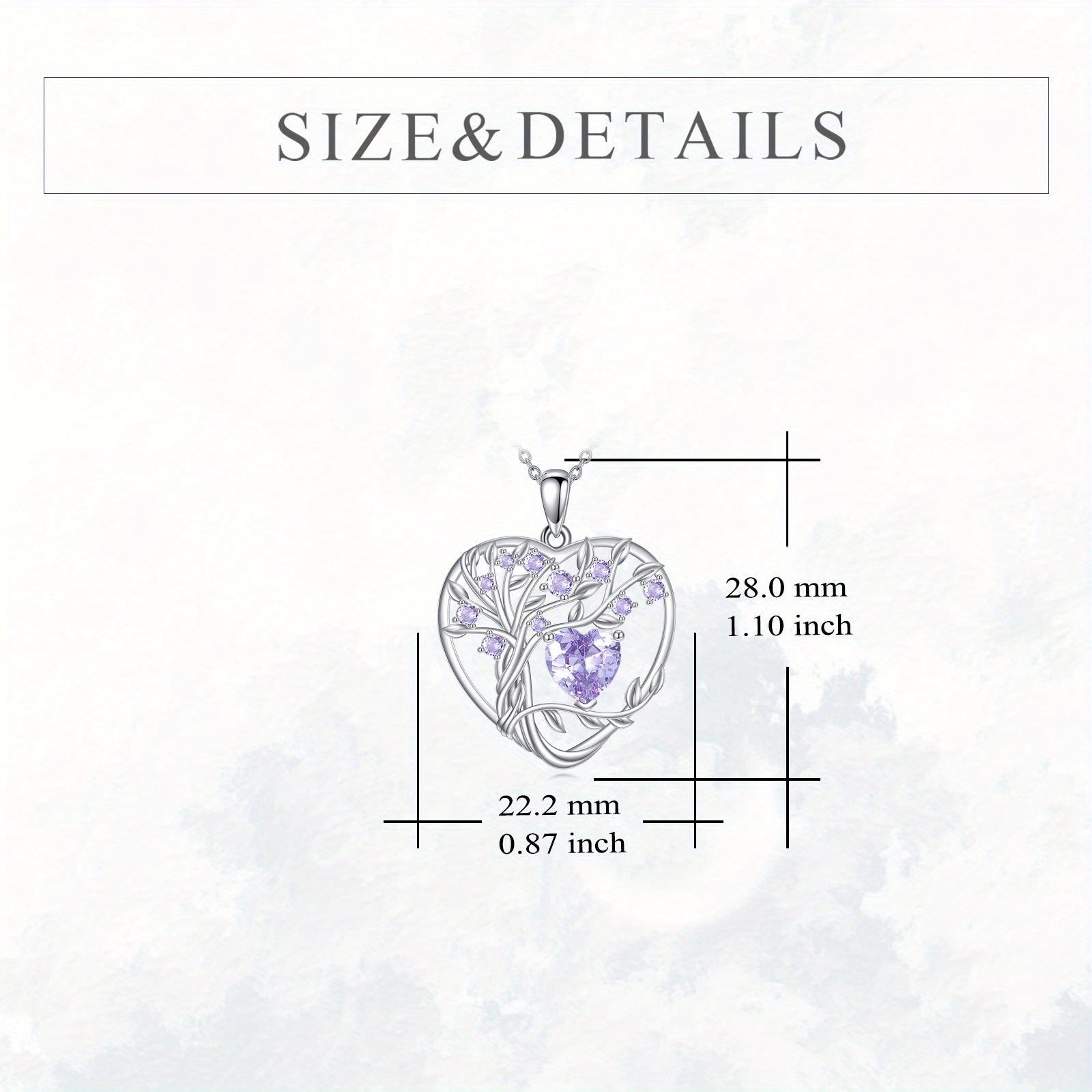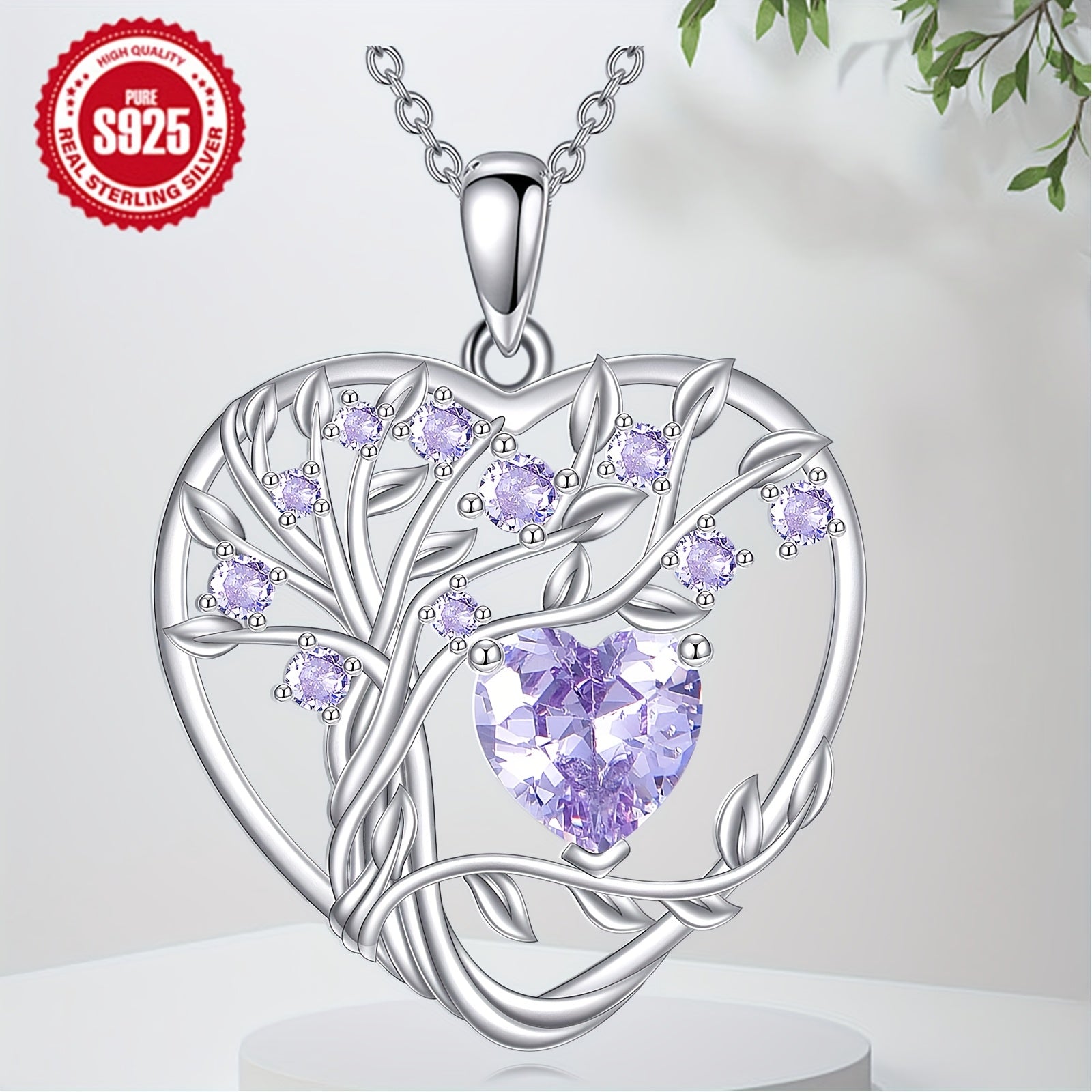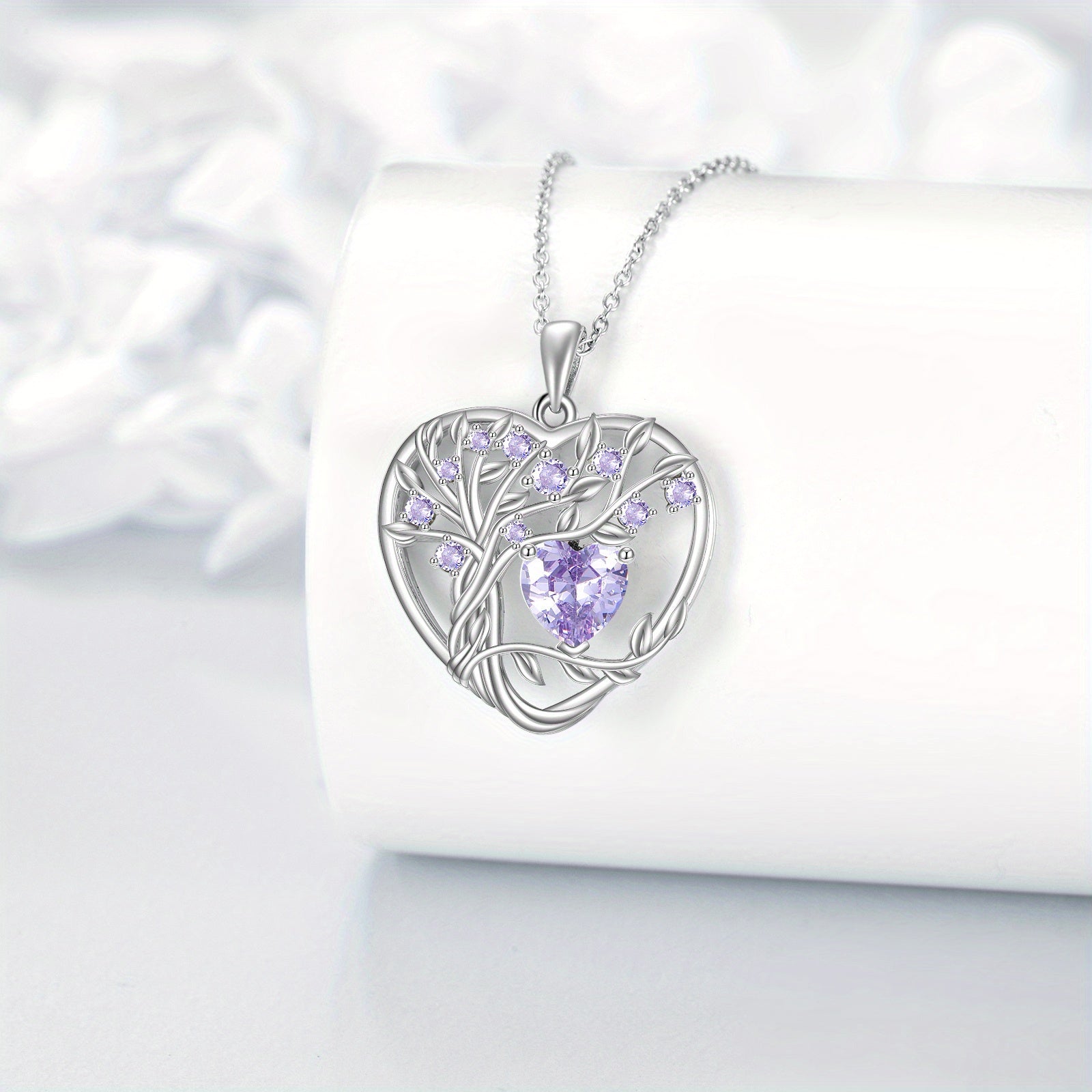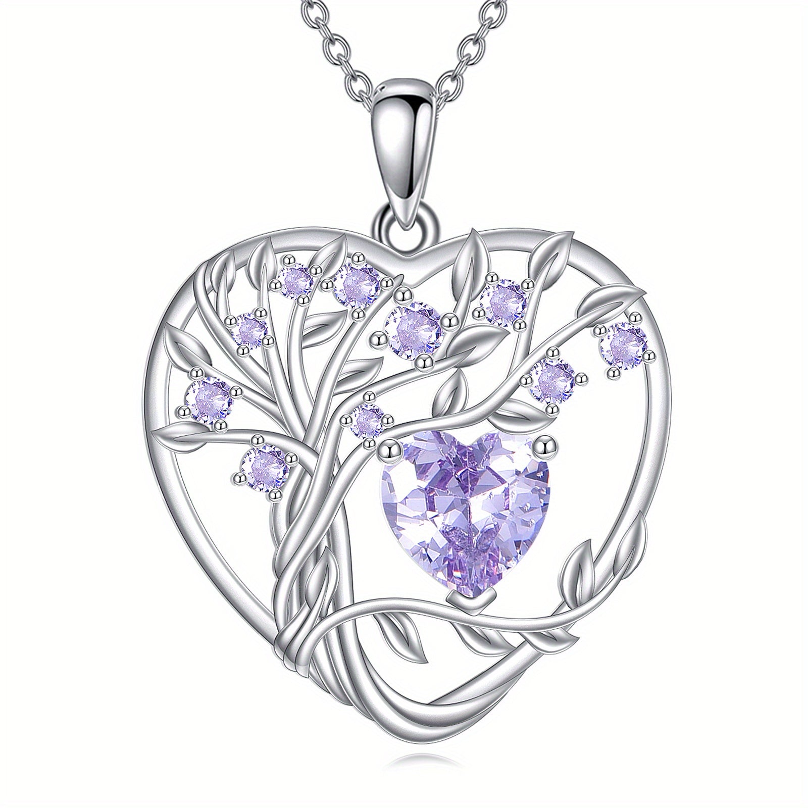 A beautiful Tree of Life necklace made of sterling silver with a birthstone pendant in a heart design. Perfect anniversary or birthday gift for women. June light purple birthstone for Christmas.
