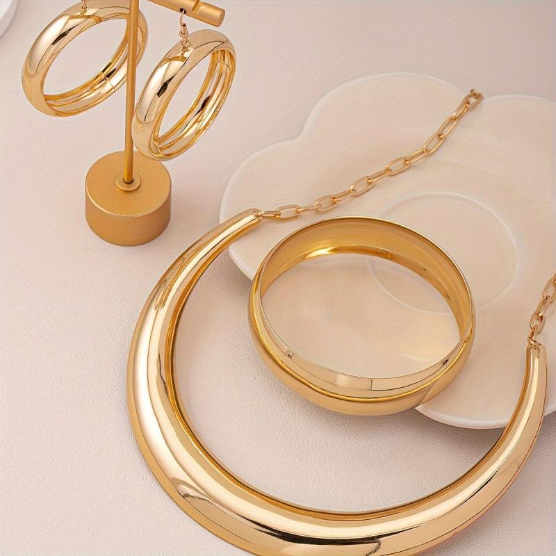 Elevate your style with this stylish jewelry set perfect for daily wear or parties. The set includes a statement necklace, bracelet, and hoop earrings.
