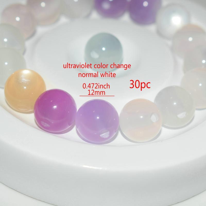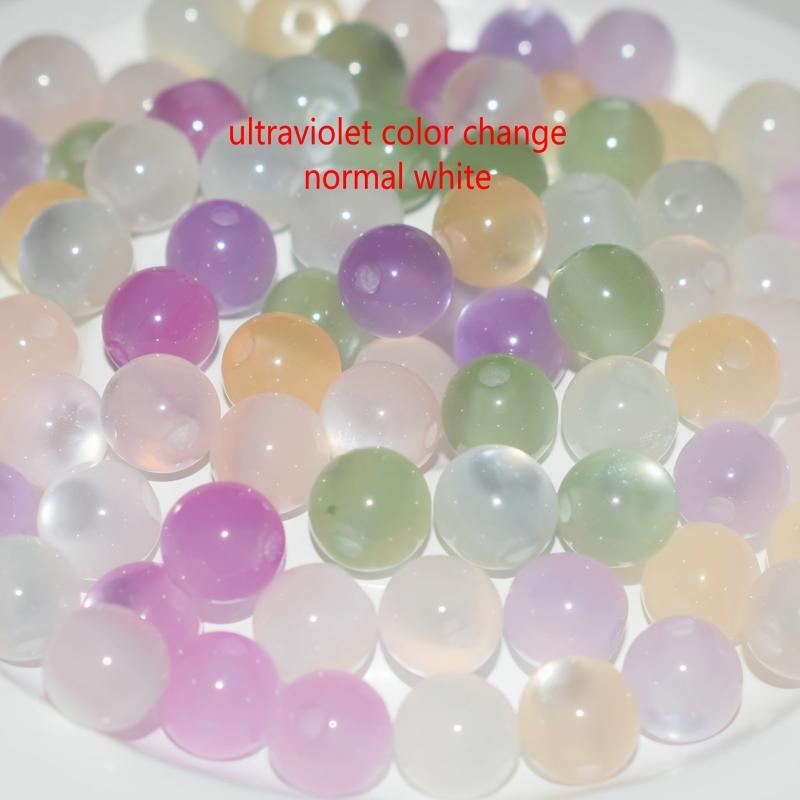 This set includes 50 pieces of 8mm beads, 40 pieces of 10mm beads, and 30 pieces of 12mm beads that appear normal indoors but change color under UV light. Ideal for creating unique DIY jewelry pieces.