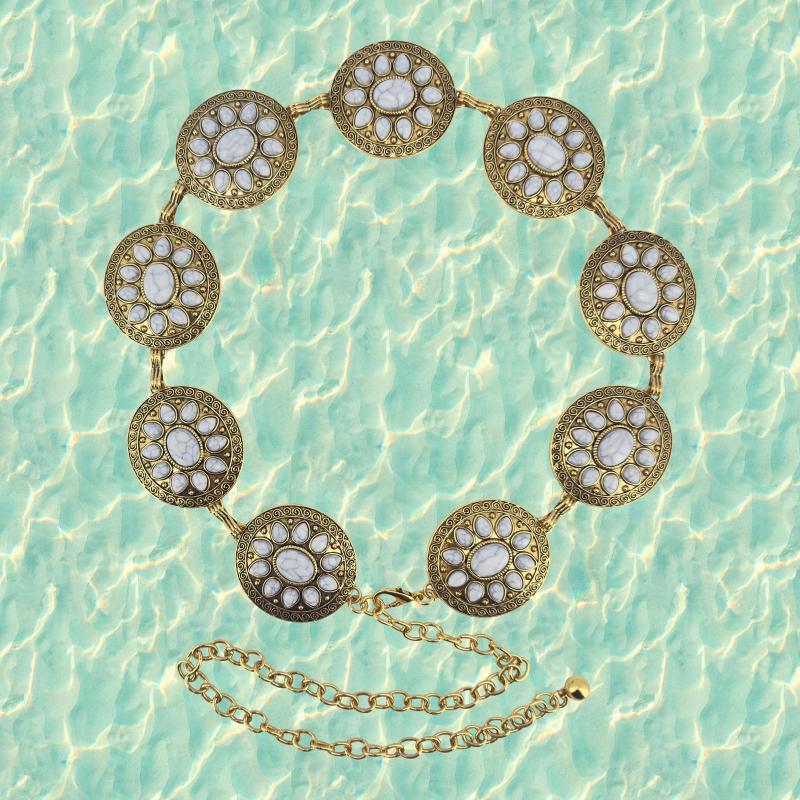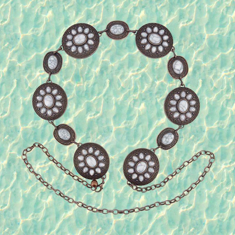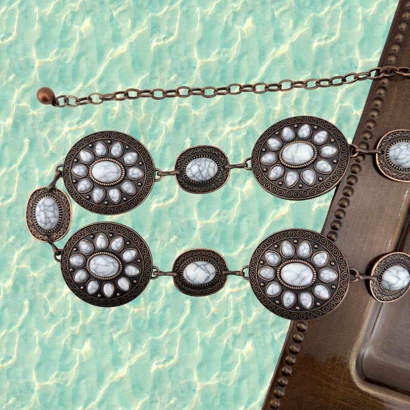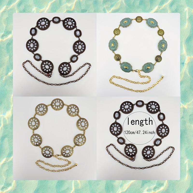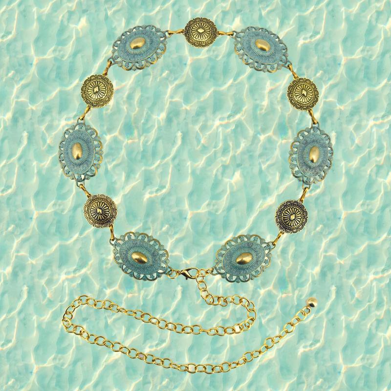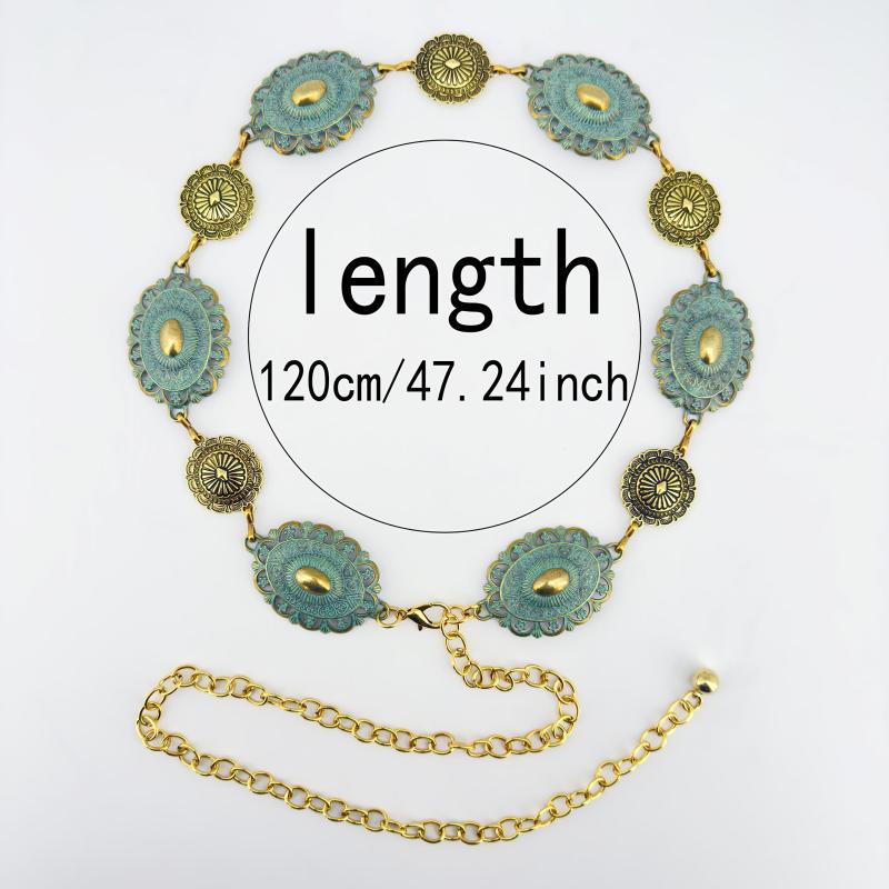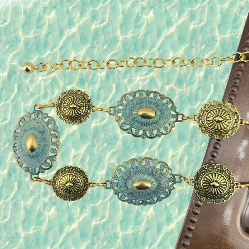 Elevate your casual style with this retro-inspired Western Bohemian belt featuring antique copper, green, and golden finish with inlaid turquoise. Perfect for versatile wear with pants or dresses.