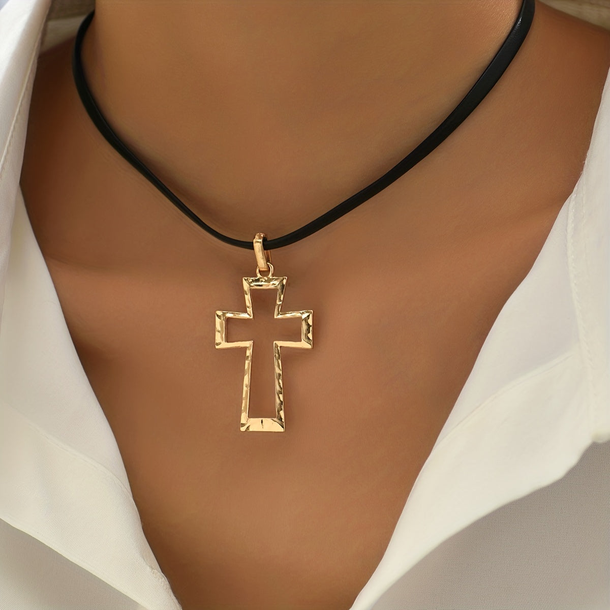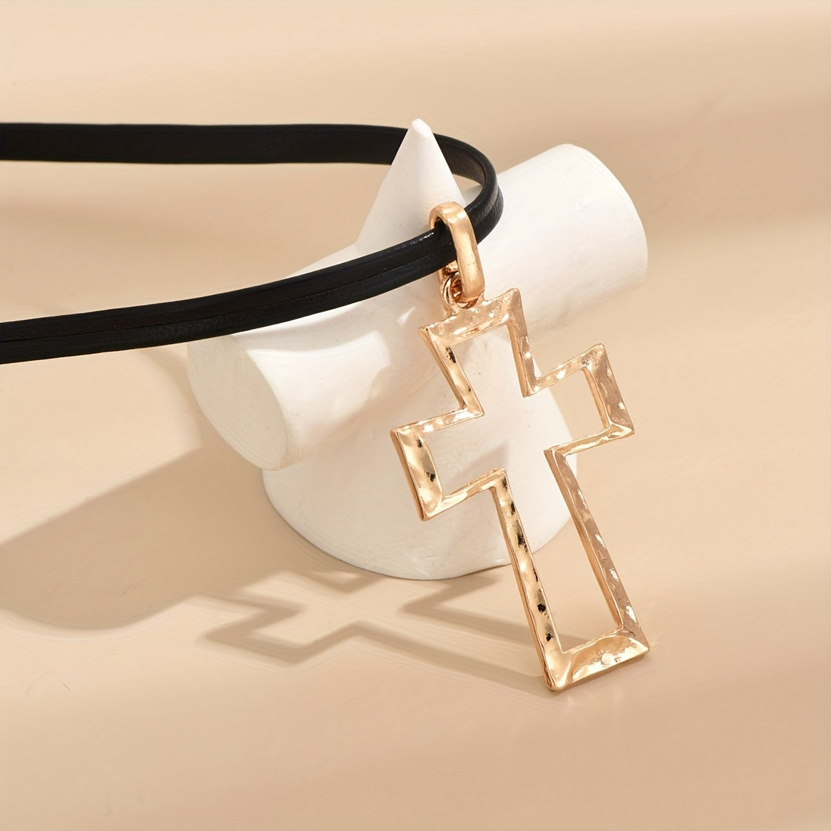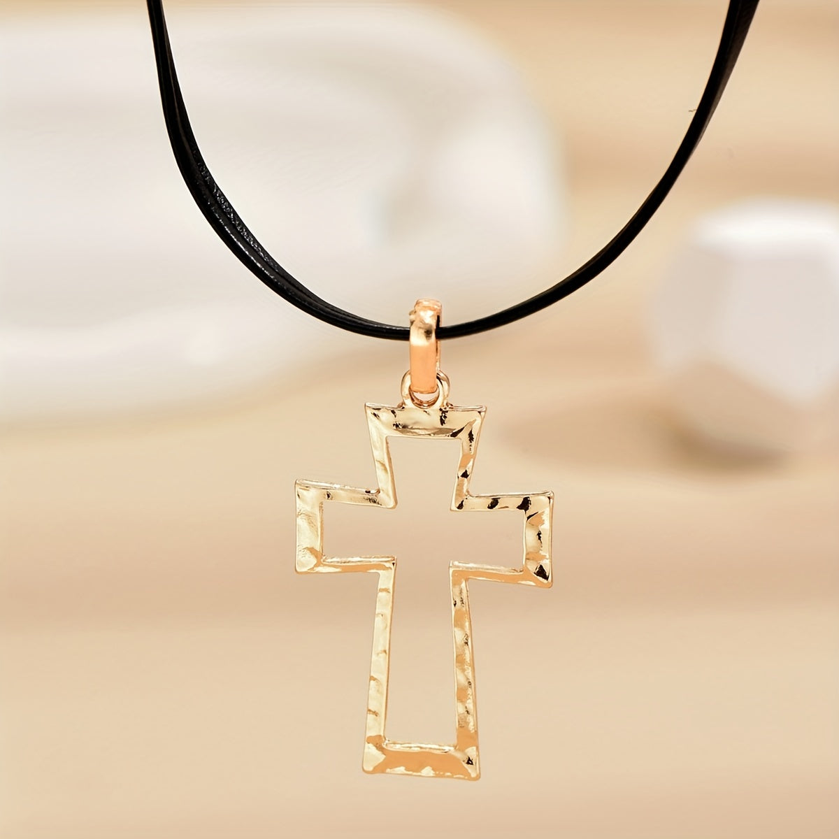 This minimalist cord necklace features a golden cross pendant and has an adjustable elastic fit for comfort. It's versatile for everyday wear and vacation jewelry.