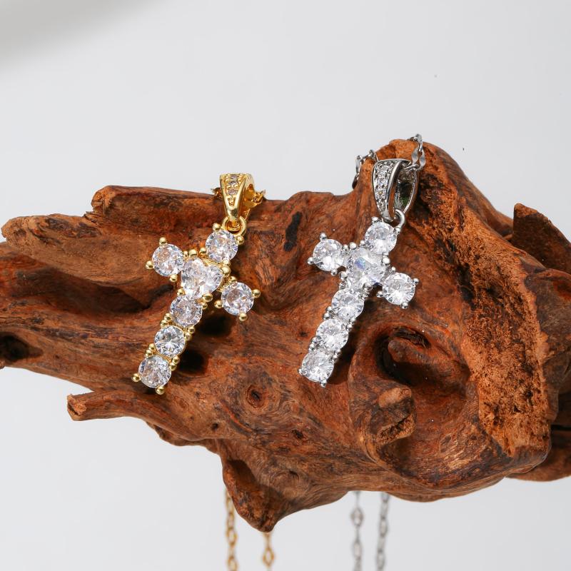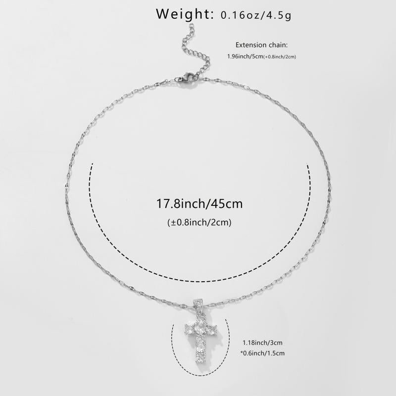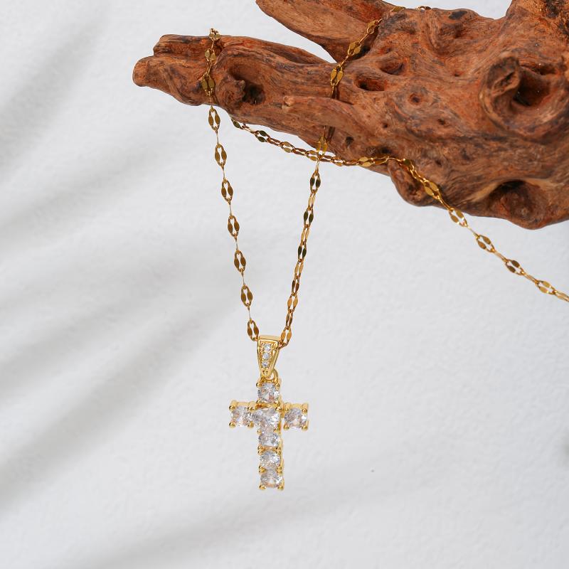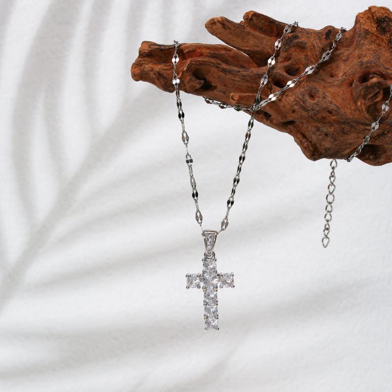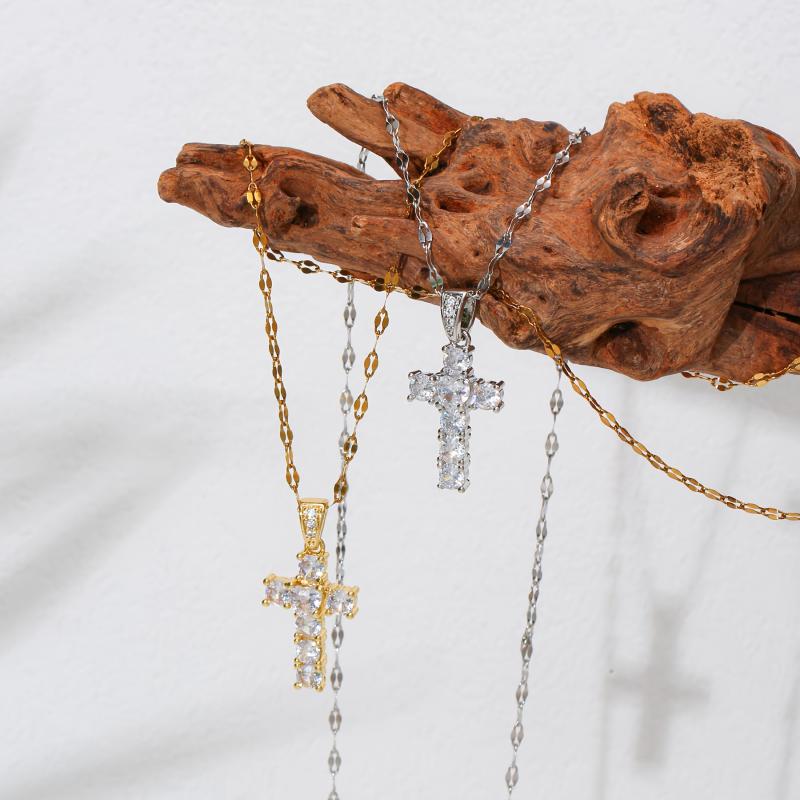 Elegant pendant necklace with synthetic zirconia crosses on hypoallergenic stainless steel material. Perfect for parties and vacations.