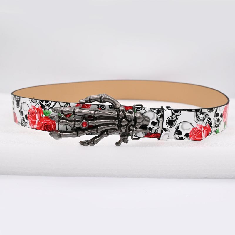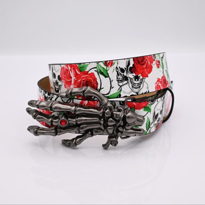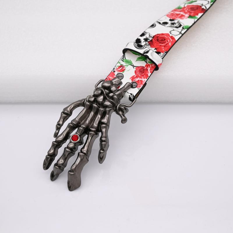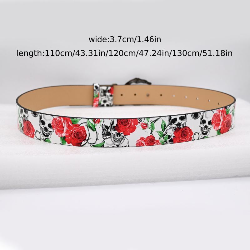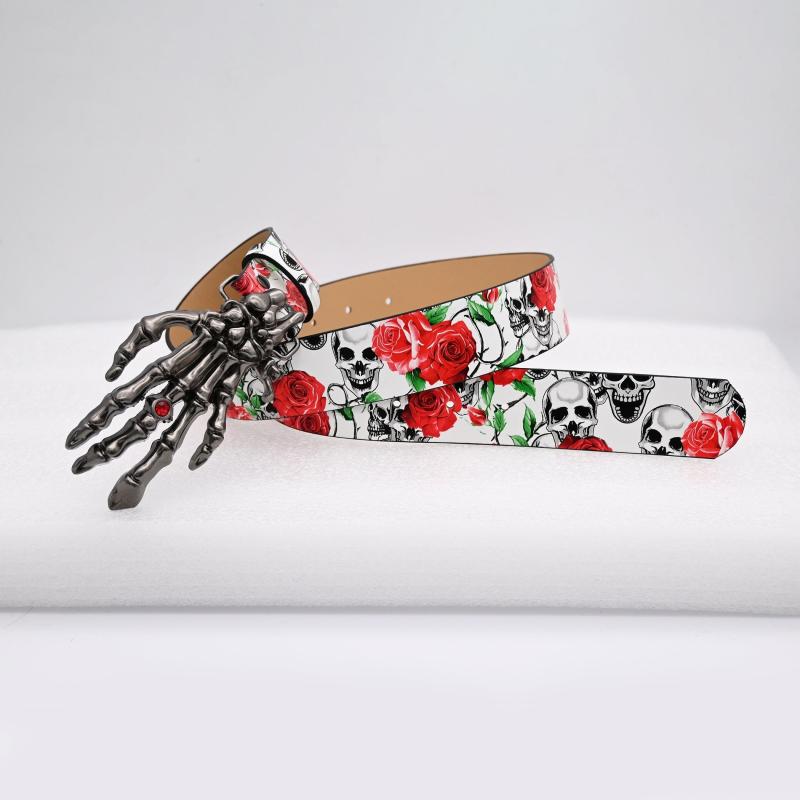 This stylish belt features a unique design with a skeleton hand buckle adorned with red roses and vines, perfect for adding a touch of spooky flair to your casual attire or festive occasion outfits.