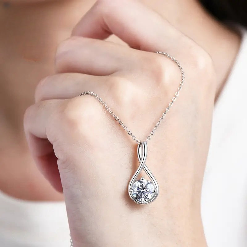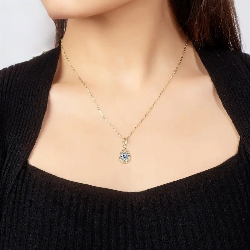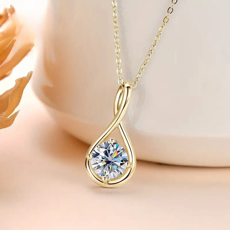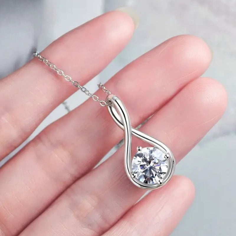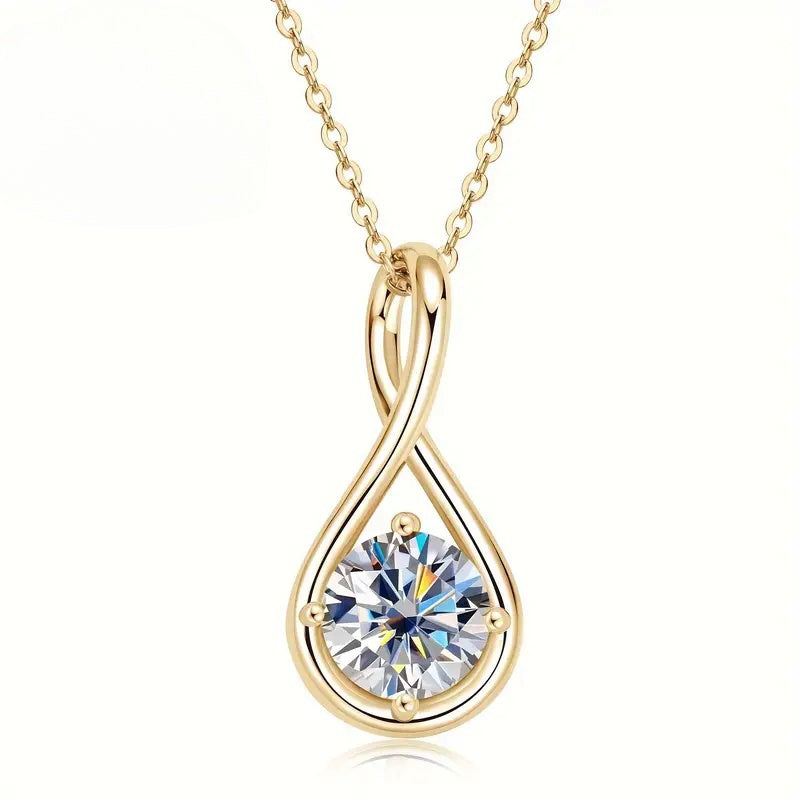 Elegant infinity pendant necklace featuring synthetic zirconia in a golden plated setting. Perfect for both everyday wear and special occasions like parties. Ideal gift for mothers.