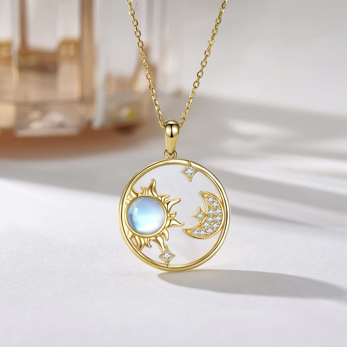 This stylish pendant necklace features a moonstone inlaid shell sun moon star pendant, perfect for daily wear and gift giving. Hypoallergenic and lightweight.
