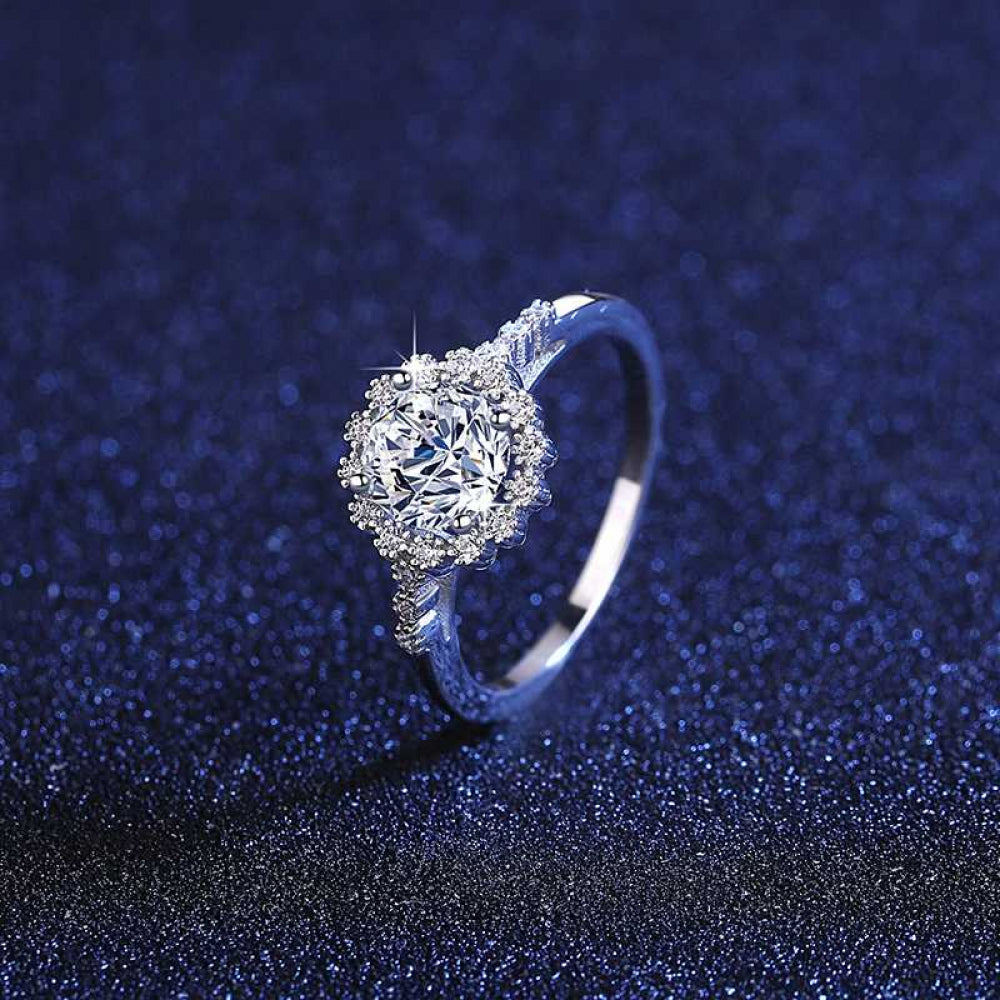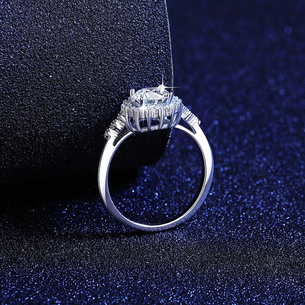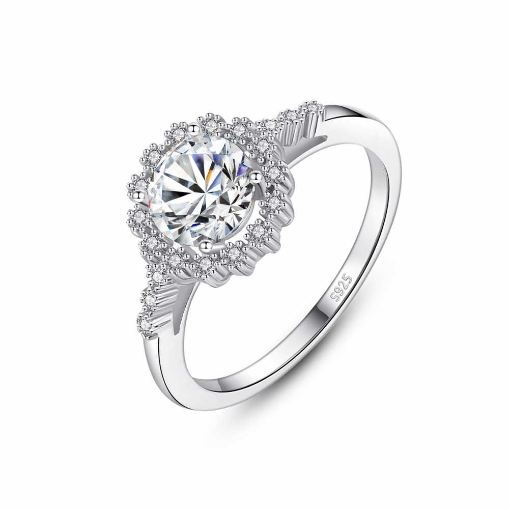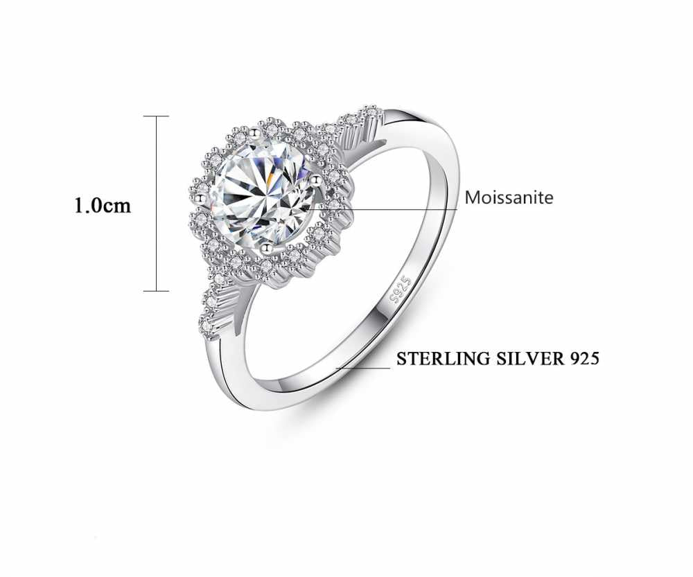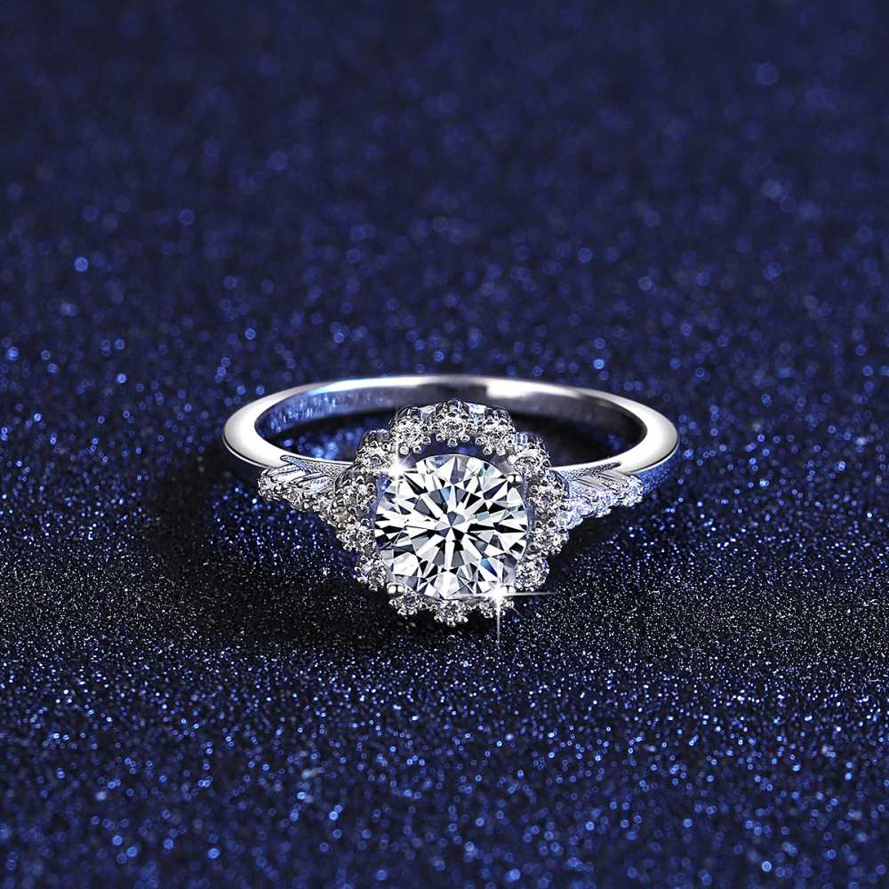 Professez votre amour avec cette bague florale conçue pour rehausser brillamment l'éclat et la brillance. Cette bague est ornée d'une pierre ronde solitaire disposée dans un cadre en moissanite au centre. Un cadre halo de pierres d'accent plus petites entoure ce centre et borde également la tige de la bague.