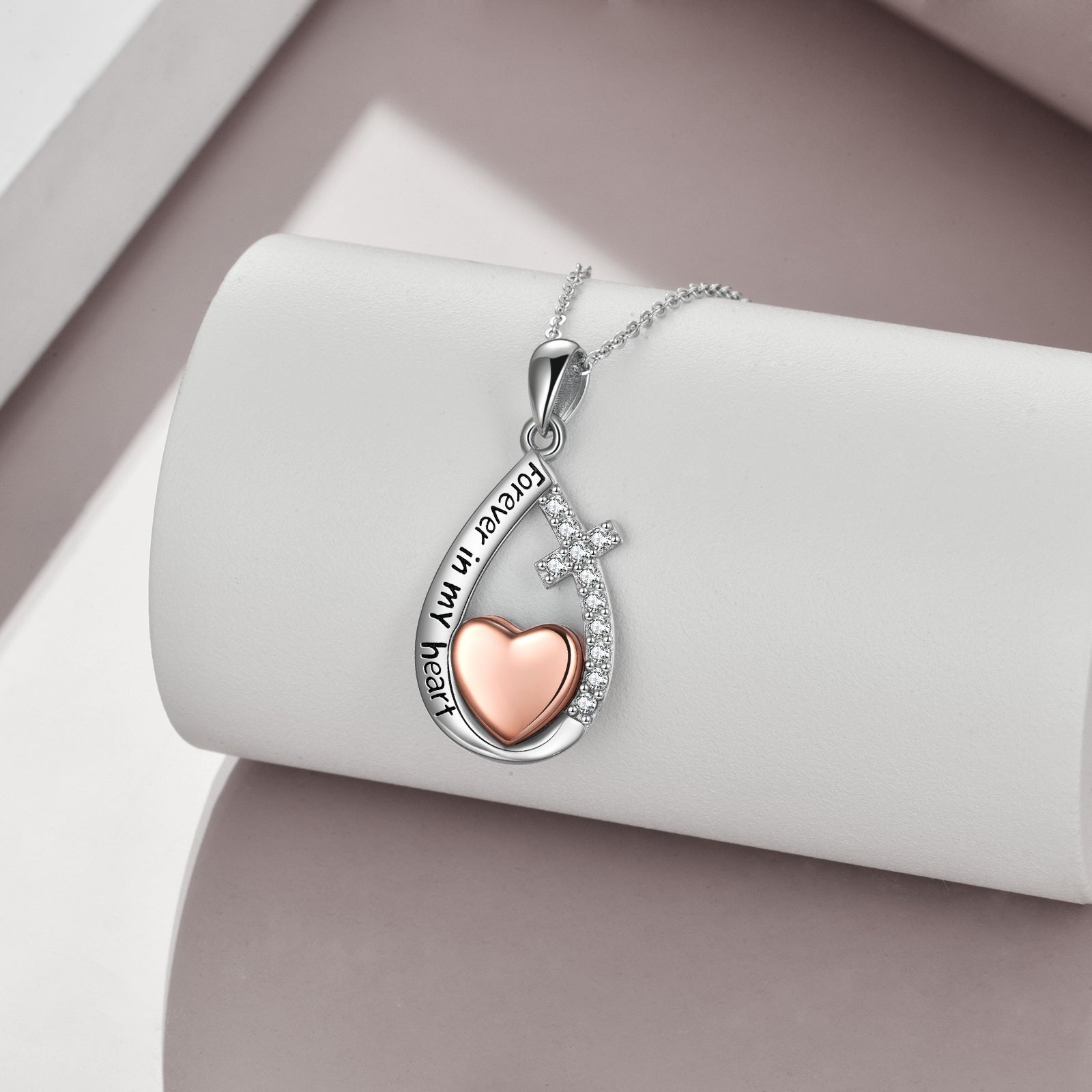 This elegant teardrop urn necklace is made of sterling silver with a rose gold heart design. It is a beautiful way to hold onto the memory of a loved one, with the option to store a small amount of ashes inside. A meaningful gift for mothers.