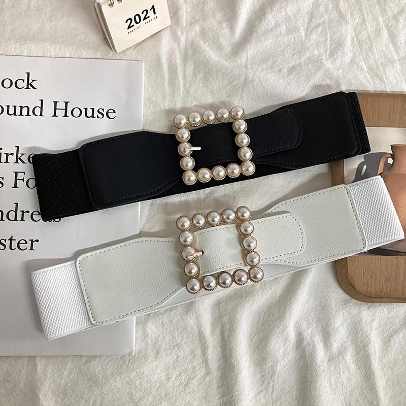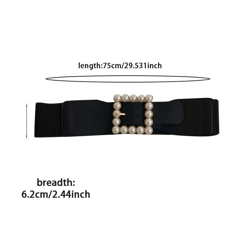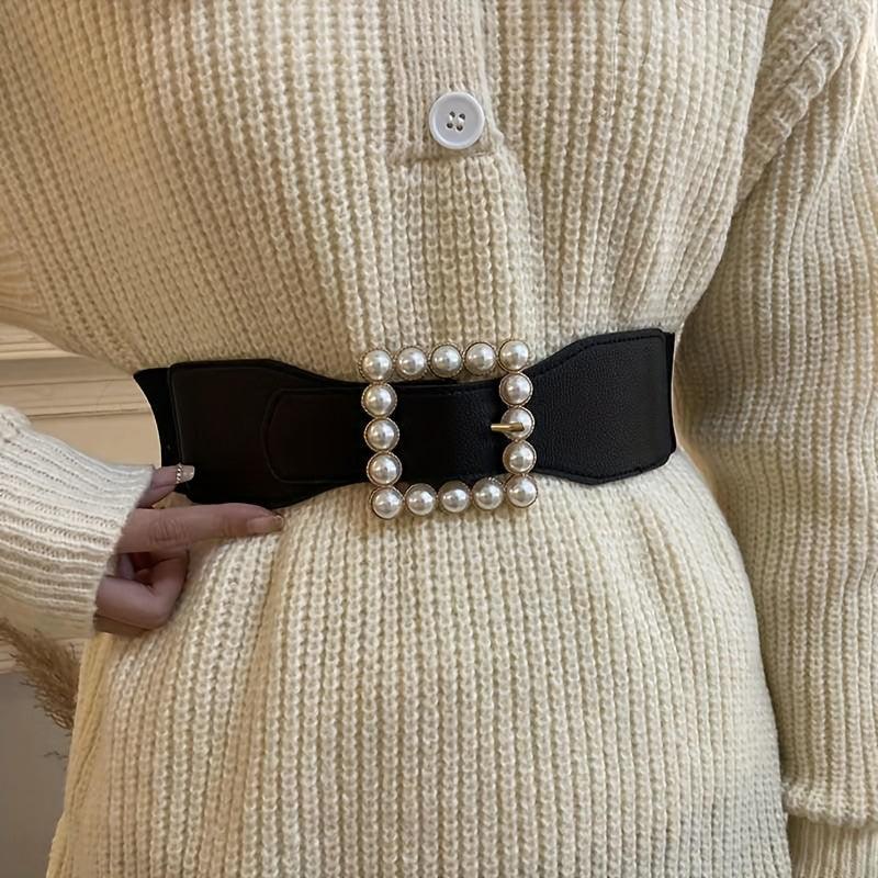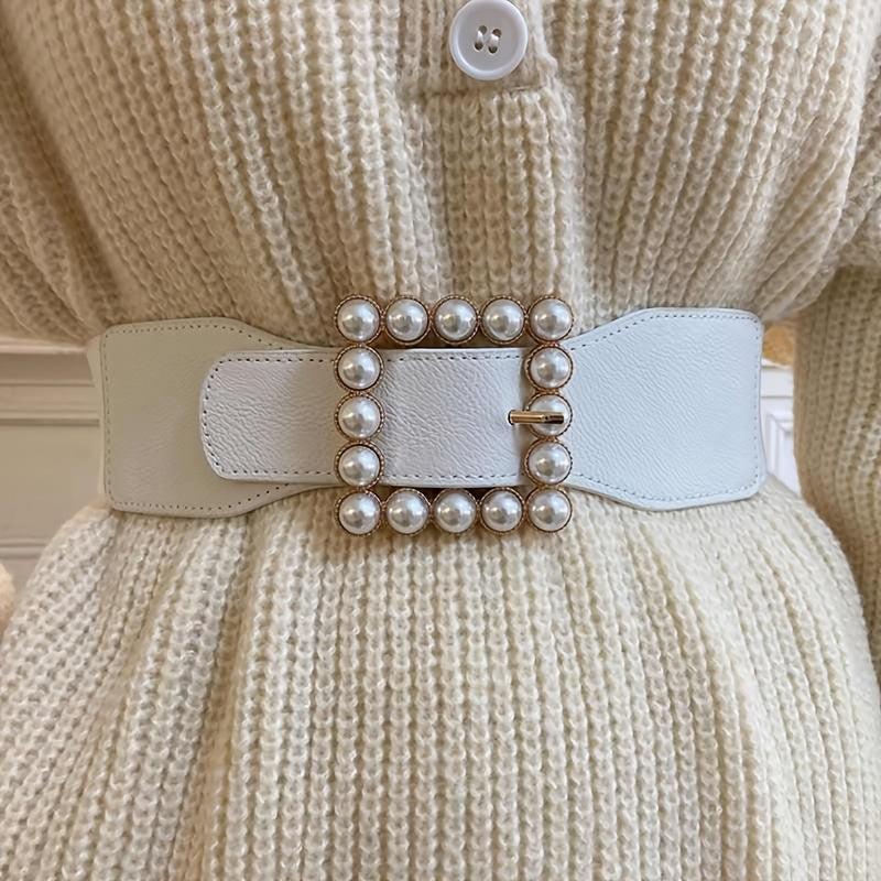 Enhance your outfit with this PU leather wide belt featuring pearl accents. Versatile and stylish, perfect for pairing with sweaters, dresses, or coats for a casual or vintage look. Suitable for all seasons.