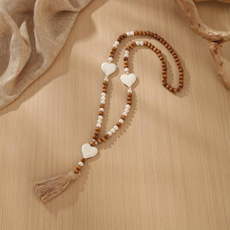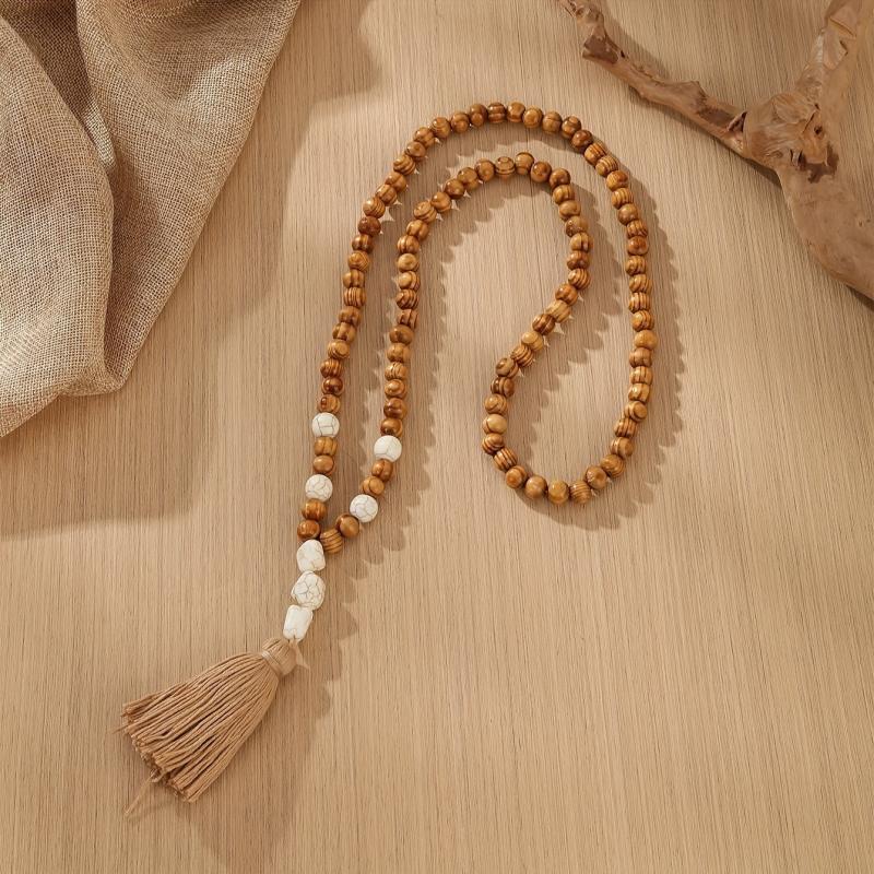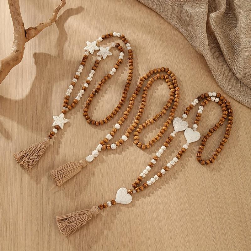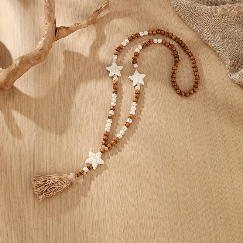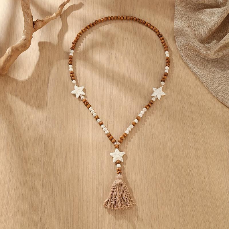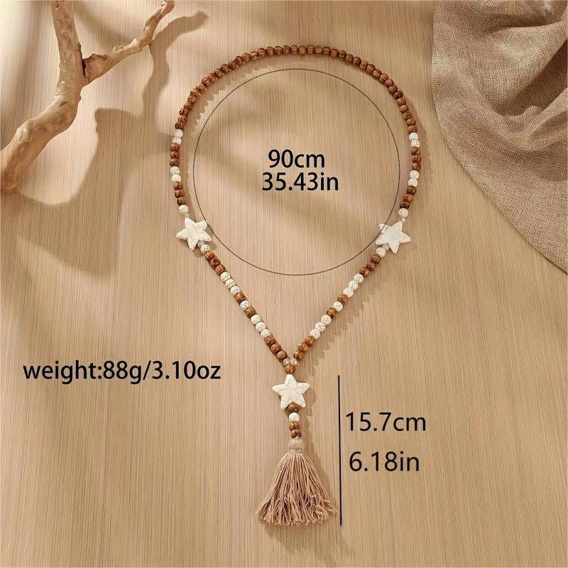 Add a touch of bohemian flair to your outfits with this handwoven wooden bead necklace featuring a star pendant and tassel. Perfect for everyday wear and vacations.
