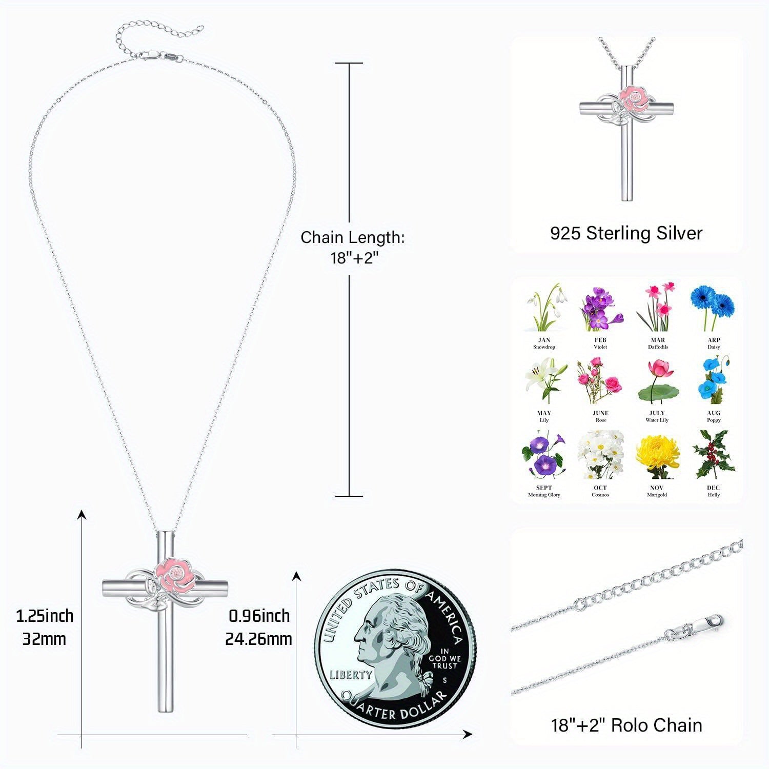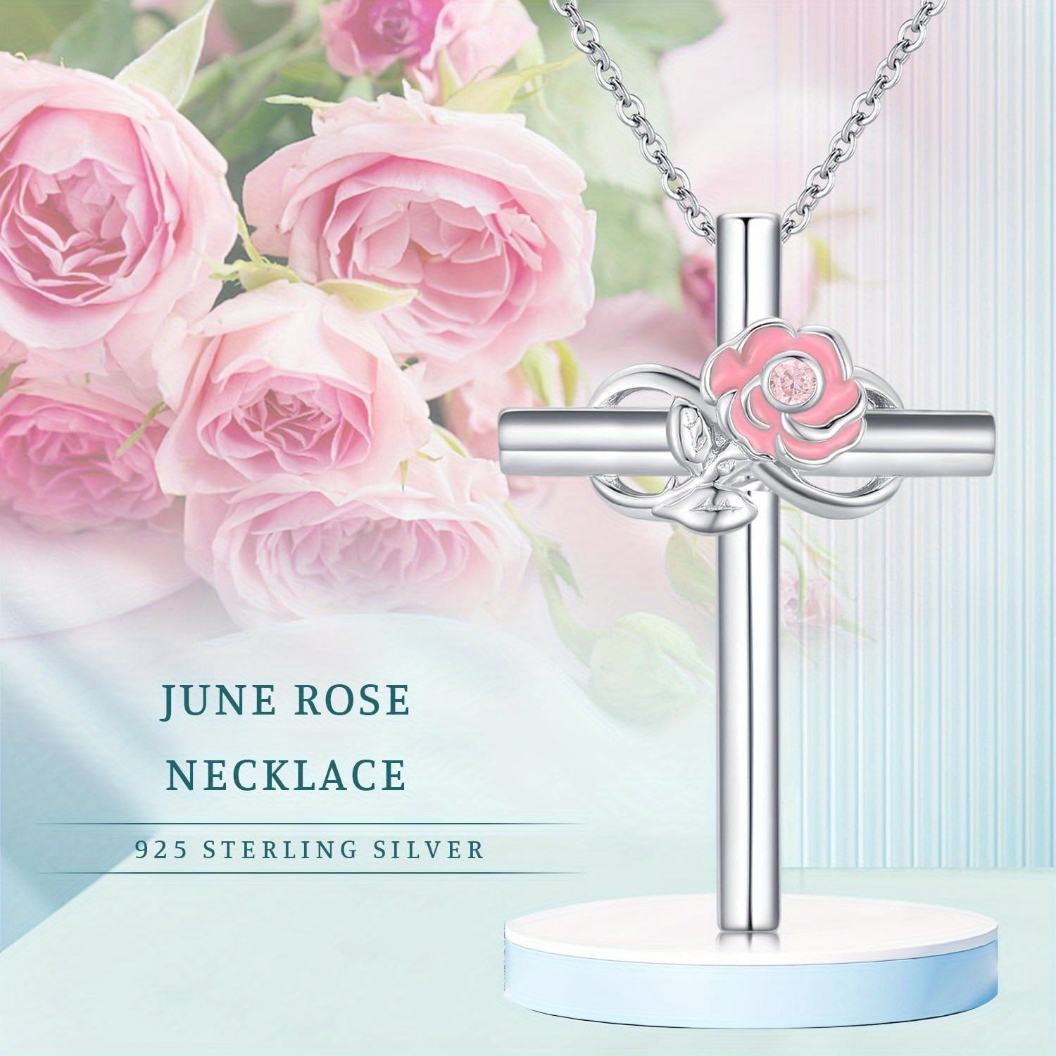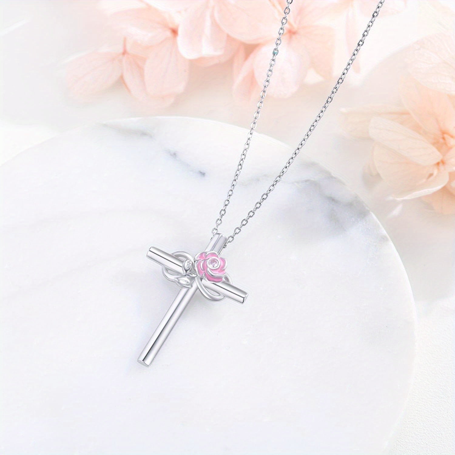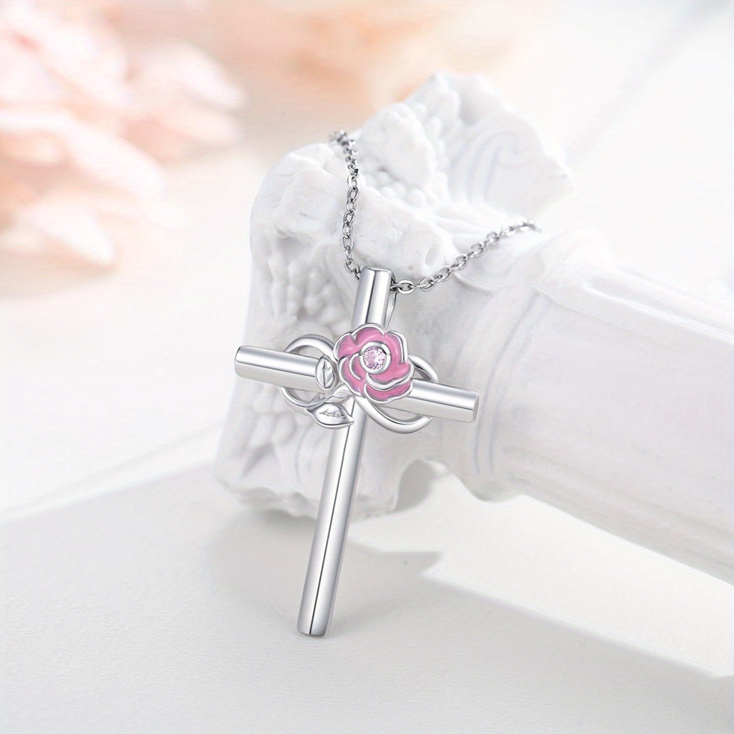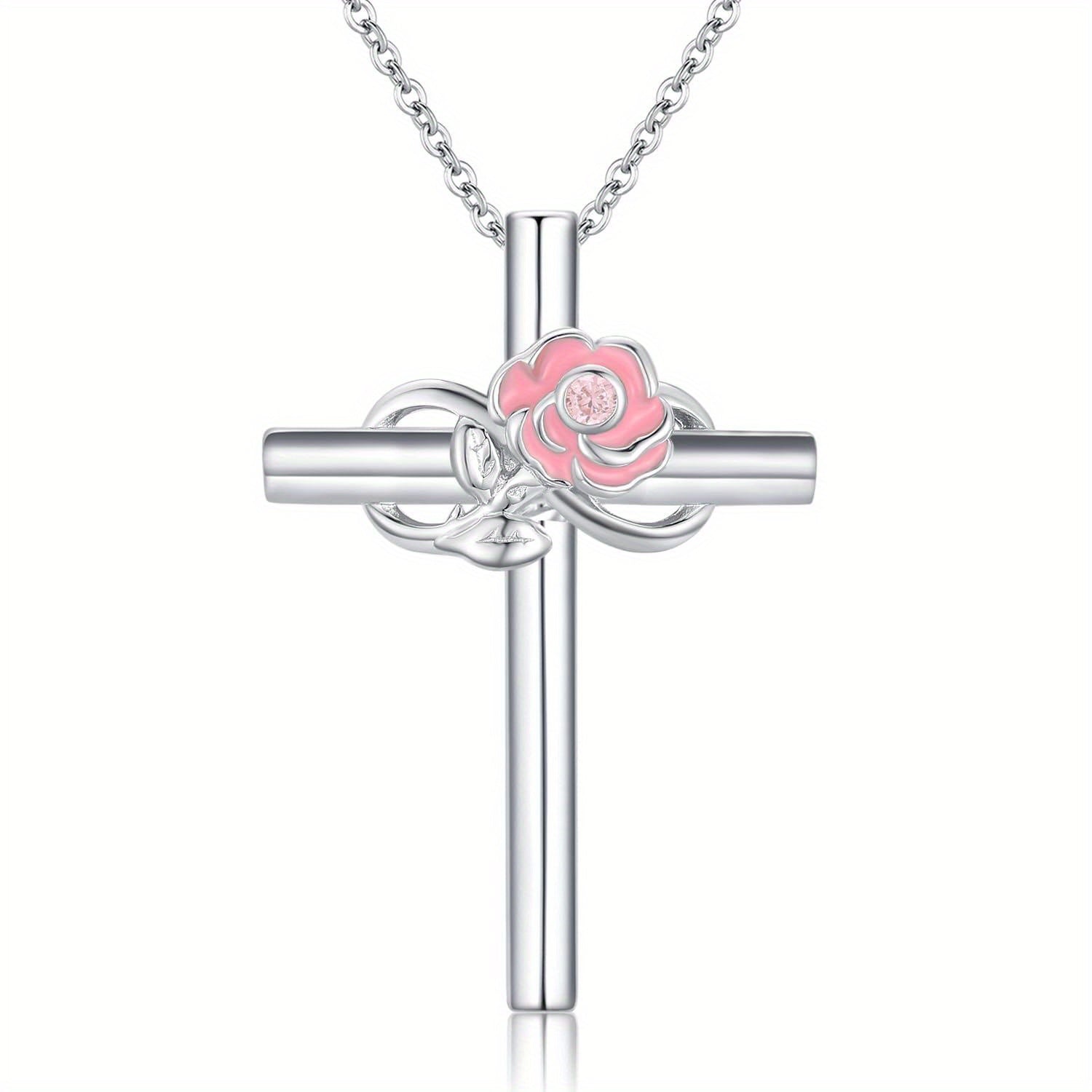 This necklace is a romantic and elegant piece of jewelry featuring a cross and a pink flower. It's a perfect gift for women, girlfriends, wives, or mothers on any occasion.