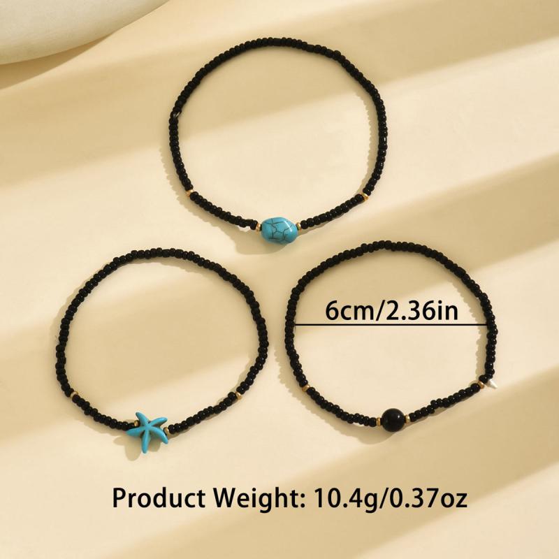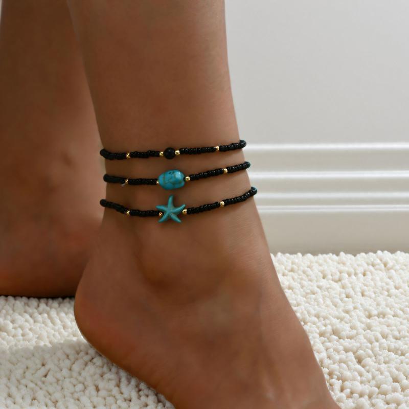 Elevate your summer style with this set of 3 elastic ankle bracelets featuring starfish, turquoise beads, and golden glass beads. Perfect for beach vacations and summer outings.