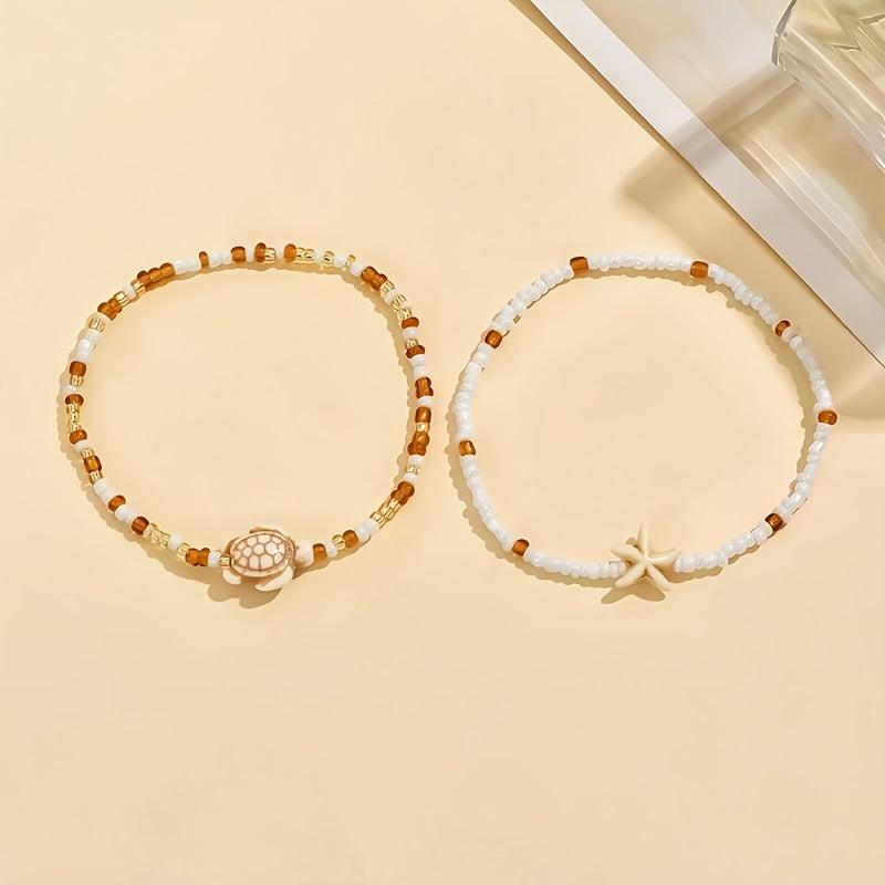 Elevate your beach look with this 2-piece anklet set featuring bohemian beach style with star, turtle, and lapis glass beads. Perfect for summer vacation or as a gift for friends.