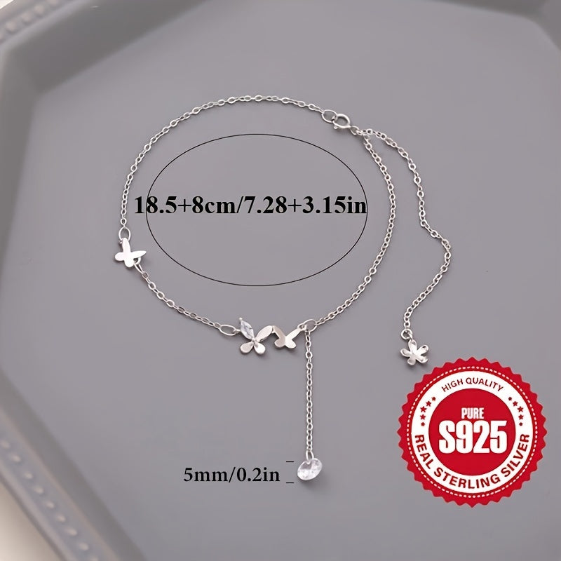 This stunning sterling silver anklet features three butterfly charms with glittering synthetic zirconia stones. It is lightweight, hypoallergenic, and perfect for parties and vacations.