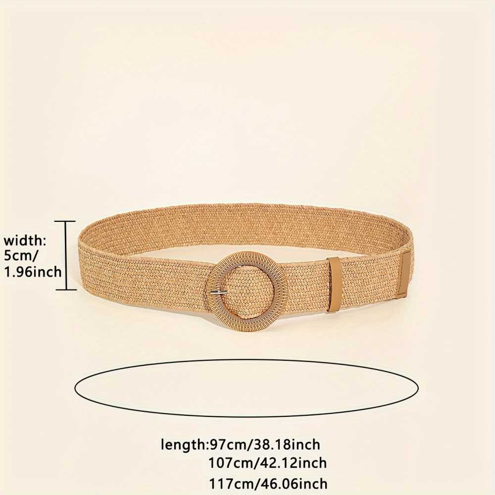 Boho Round Buckle Braided Khaki Elastic Wide Belts for Womenu2019s Casual Dresses