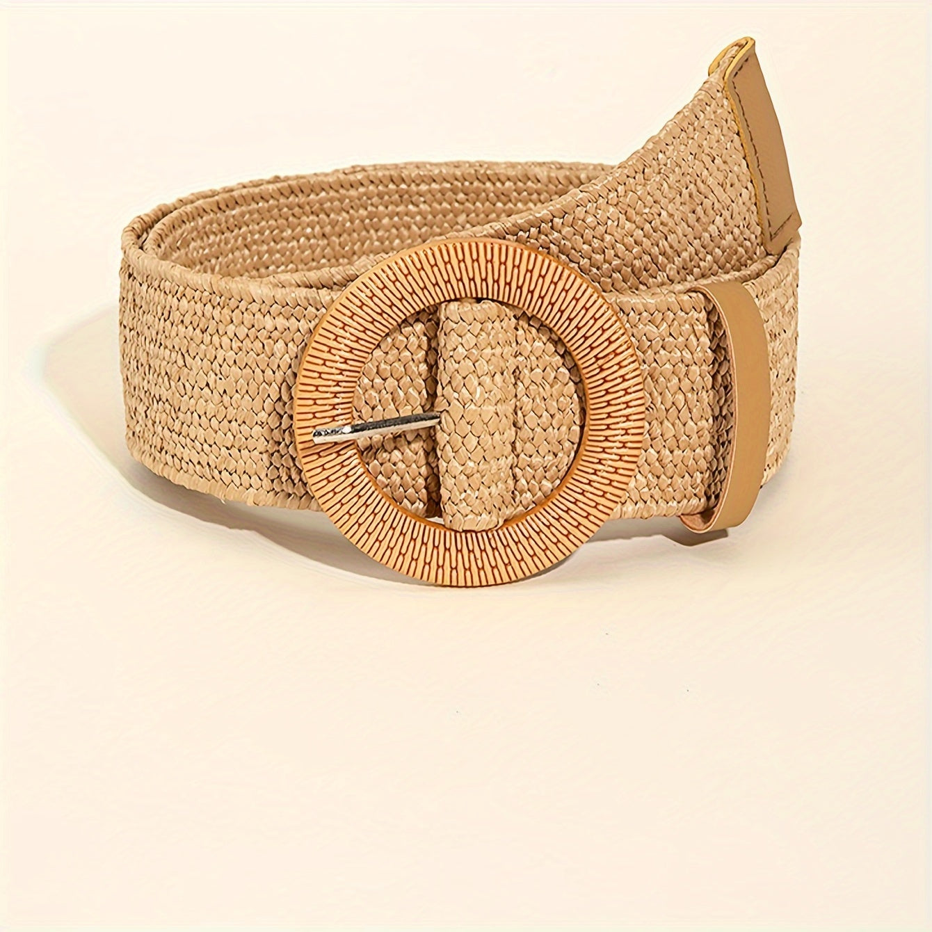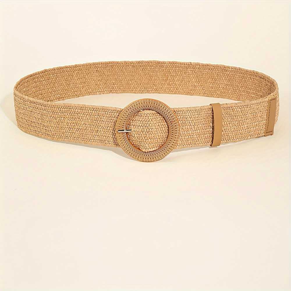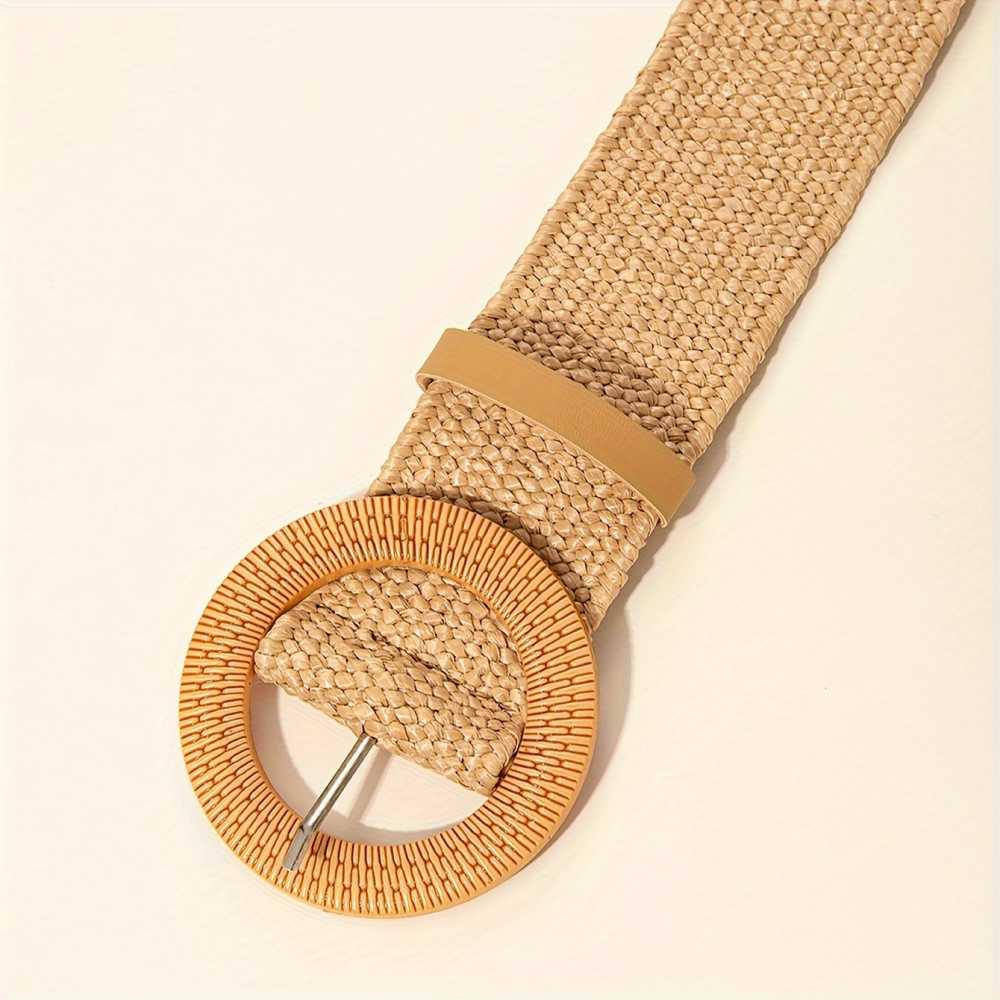 Boho Round Buckle Braided Khaki Elastic Wide Belts for Women’s Casual Dresses
