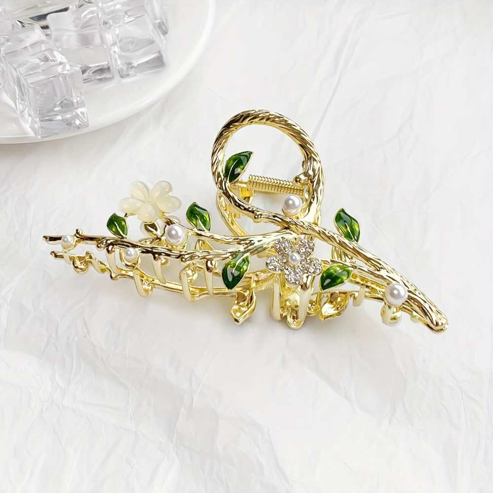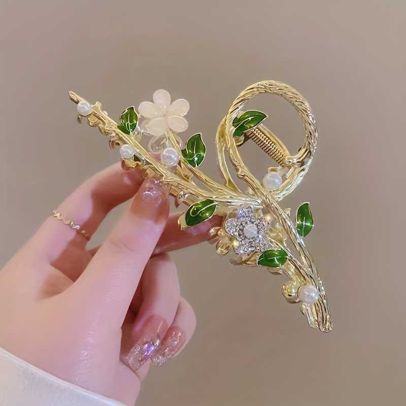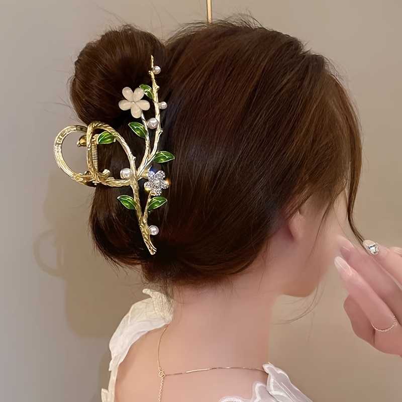 Pince à cheveux florale élégante avec fausses perles et strass décoratifs