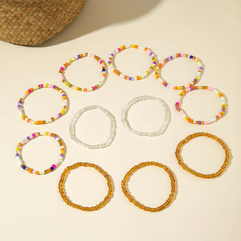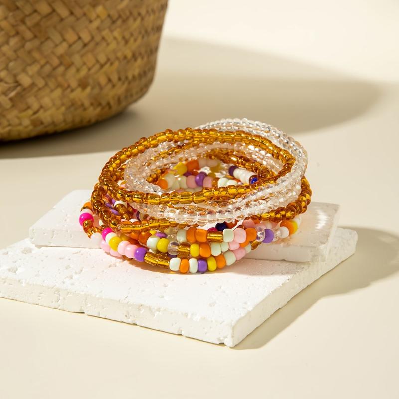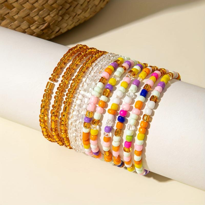 Elevate your style with this 11-piece bohemian beaded bracelet set. Featuring colorful bangles that stretch to fit any wrist size, adding a pop of color and fun to your outfit.