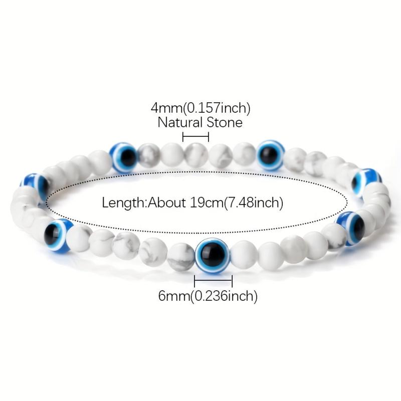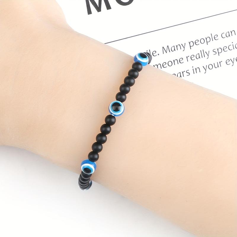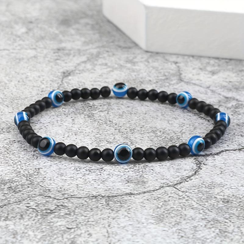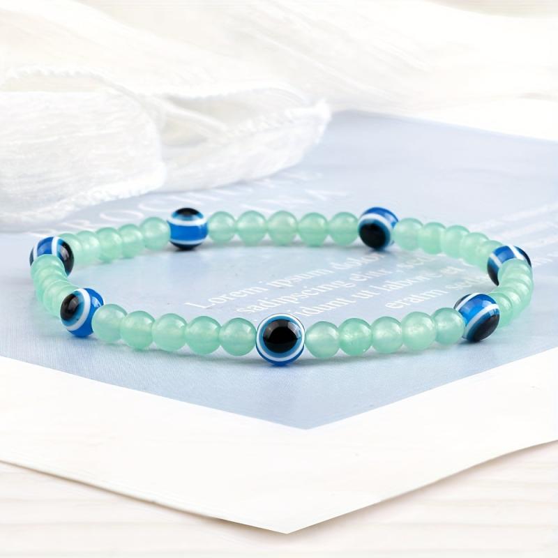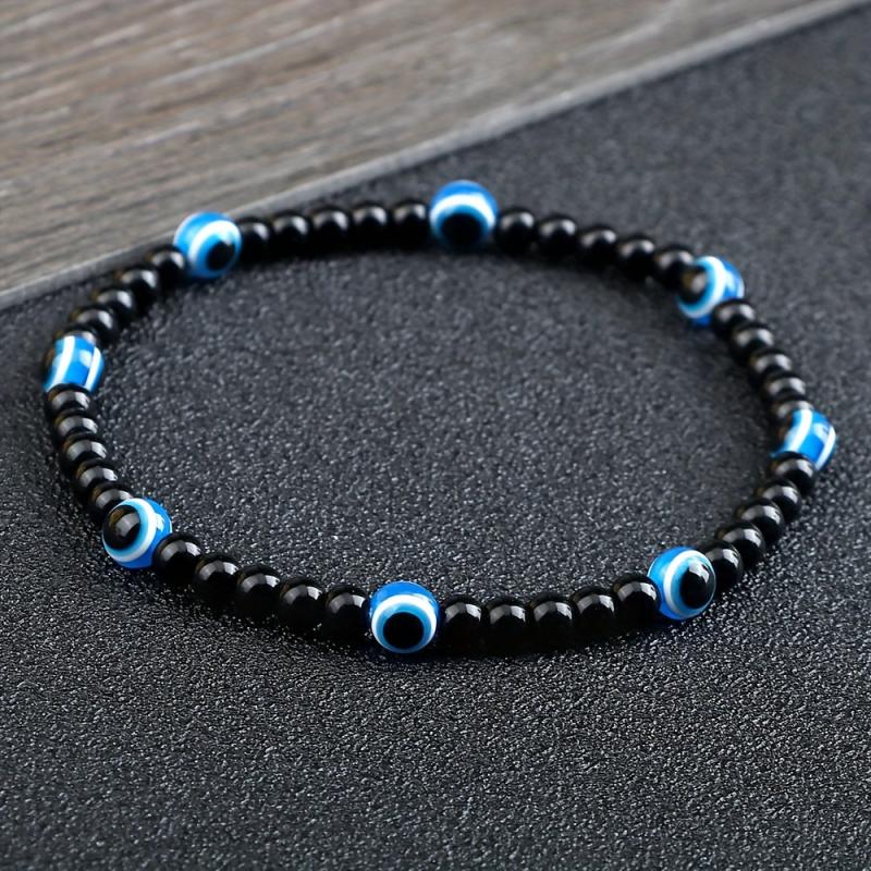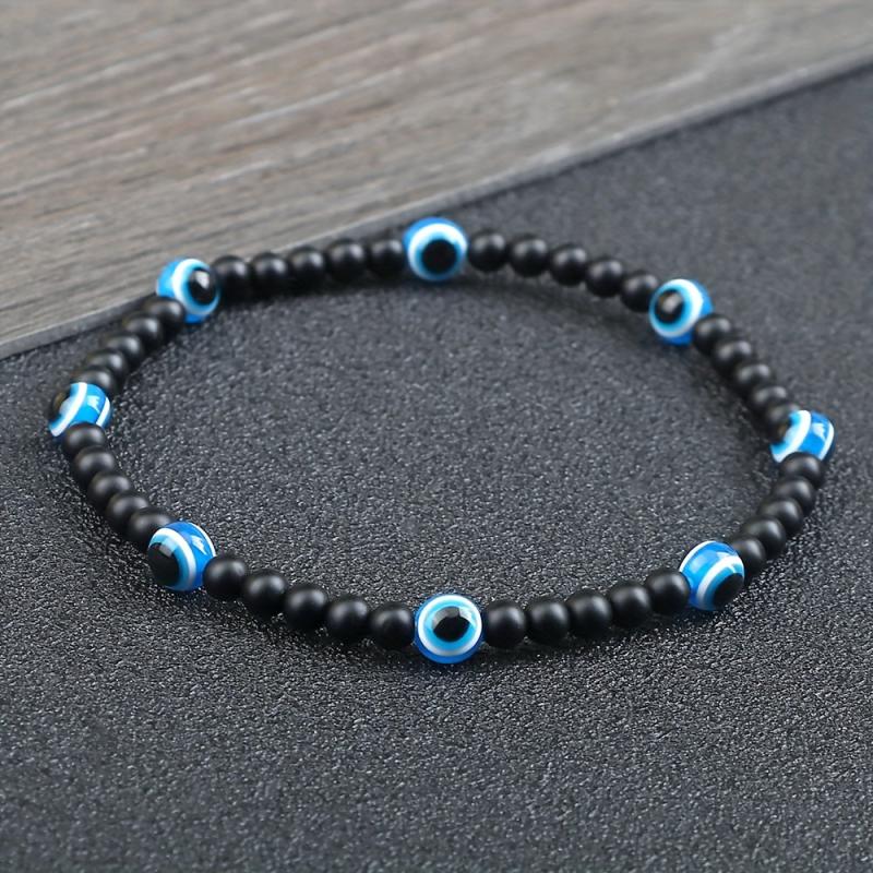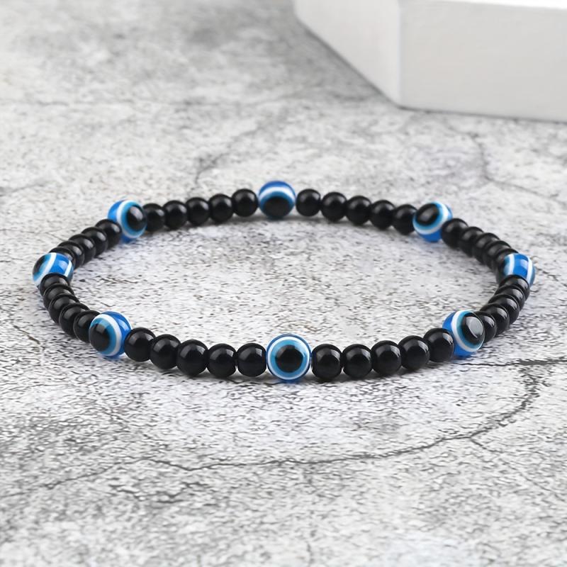 This bracelet features 4mm devil's eye natural stone beads on an elastic band, providing protection and good luck. It is a stylish accessory with spiritual significance.