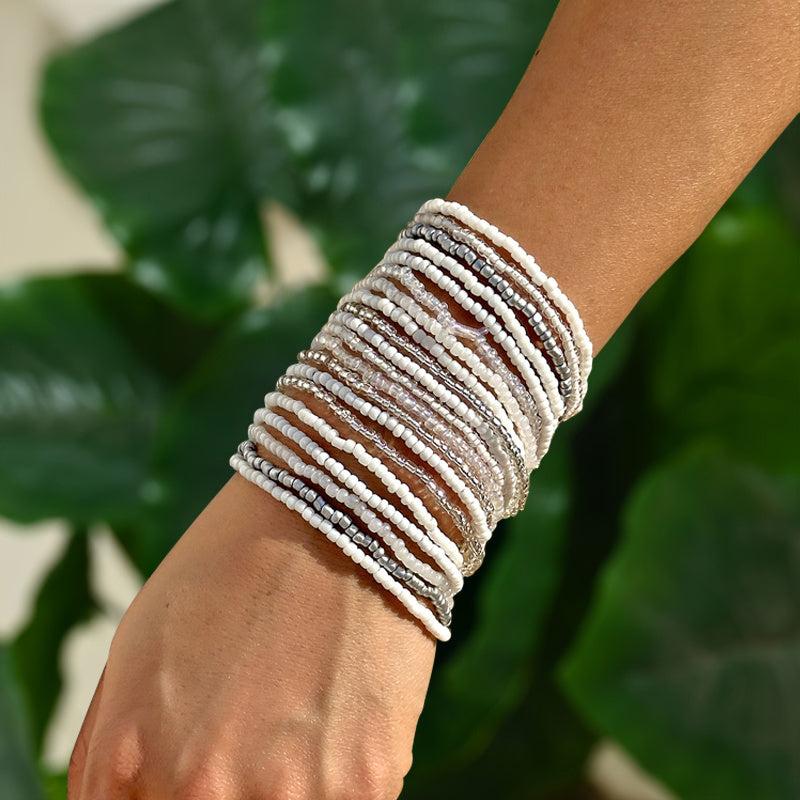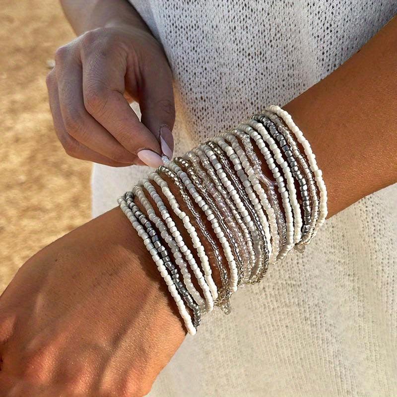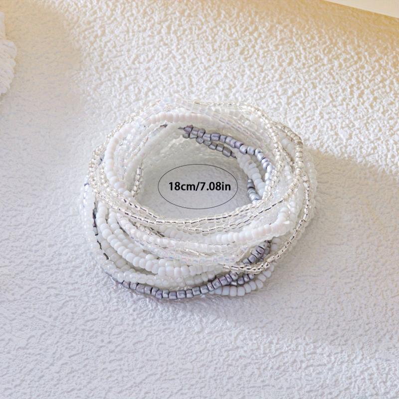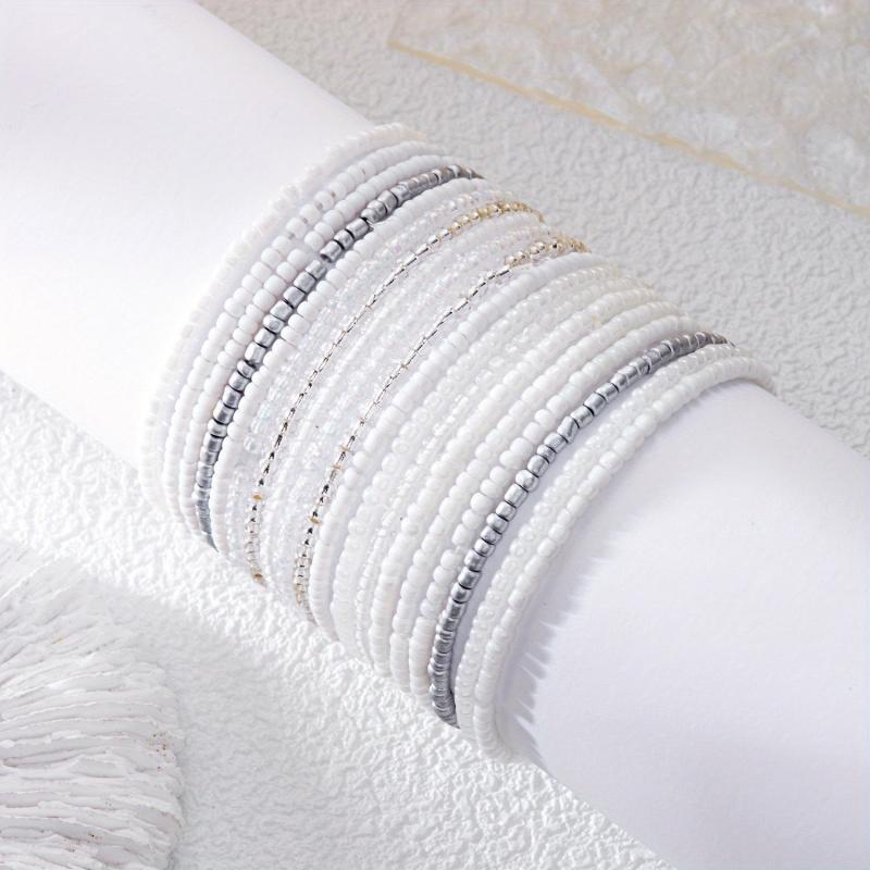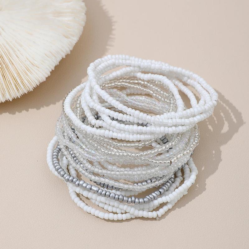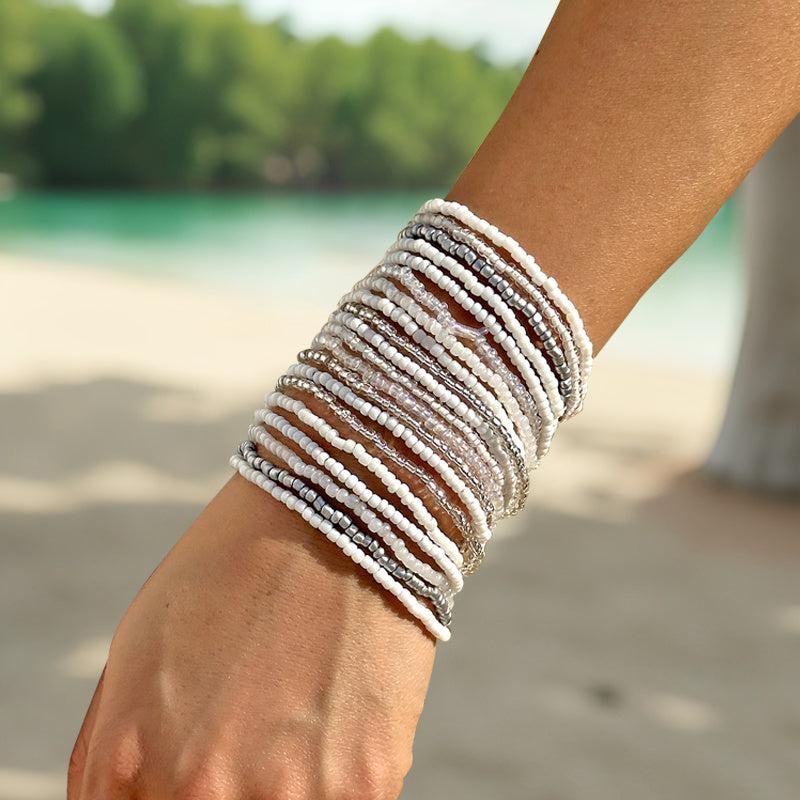 Elevate your summer look with this hand-strung beach vacation bead bracelet set. Made of glass material, these stacked rice bead bracelets are perfect for a bohemian style.