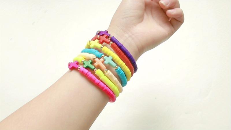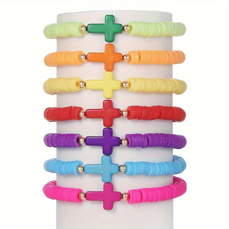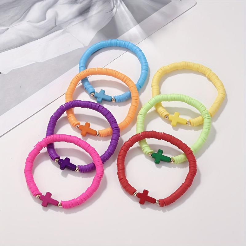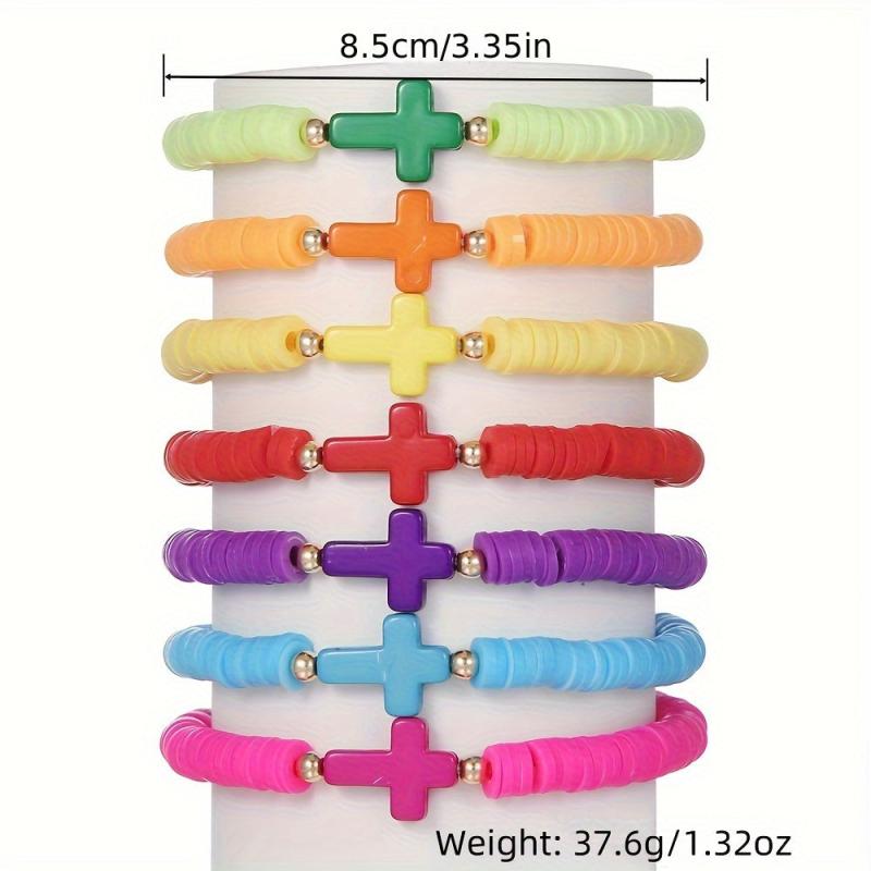 Add a pop of color to your casual attire with this 7pcs polymer clay beaded bracelet set. Featuring a cross charm, these bracelets are perfect for everyday wear or gifting.