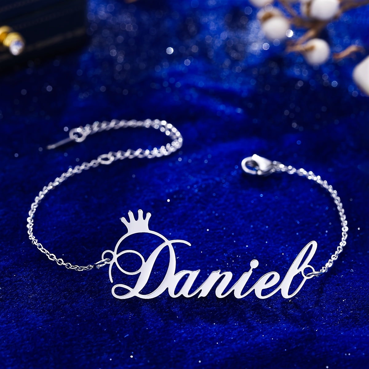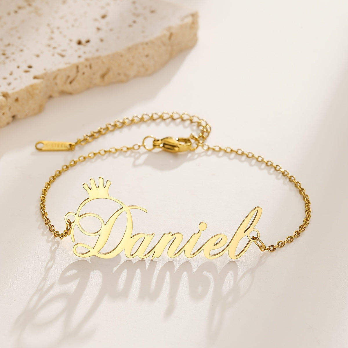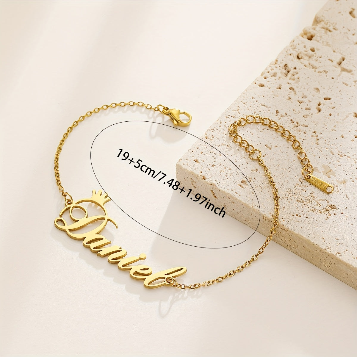 This stylish bracelet features a nameplate with a crown design, perfect for adding a personalized touch to your outfit. Customize it with your name or a special word for a unique accessory.