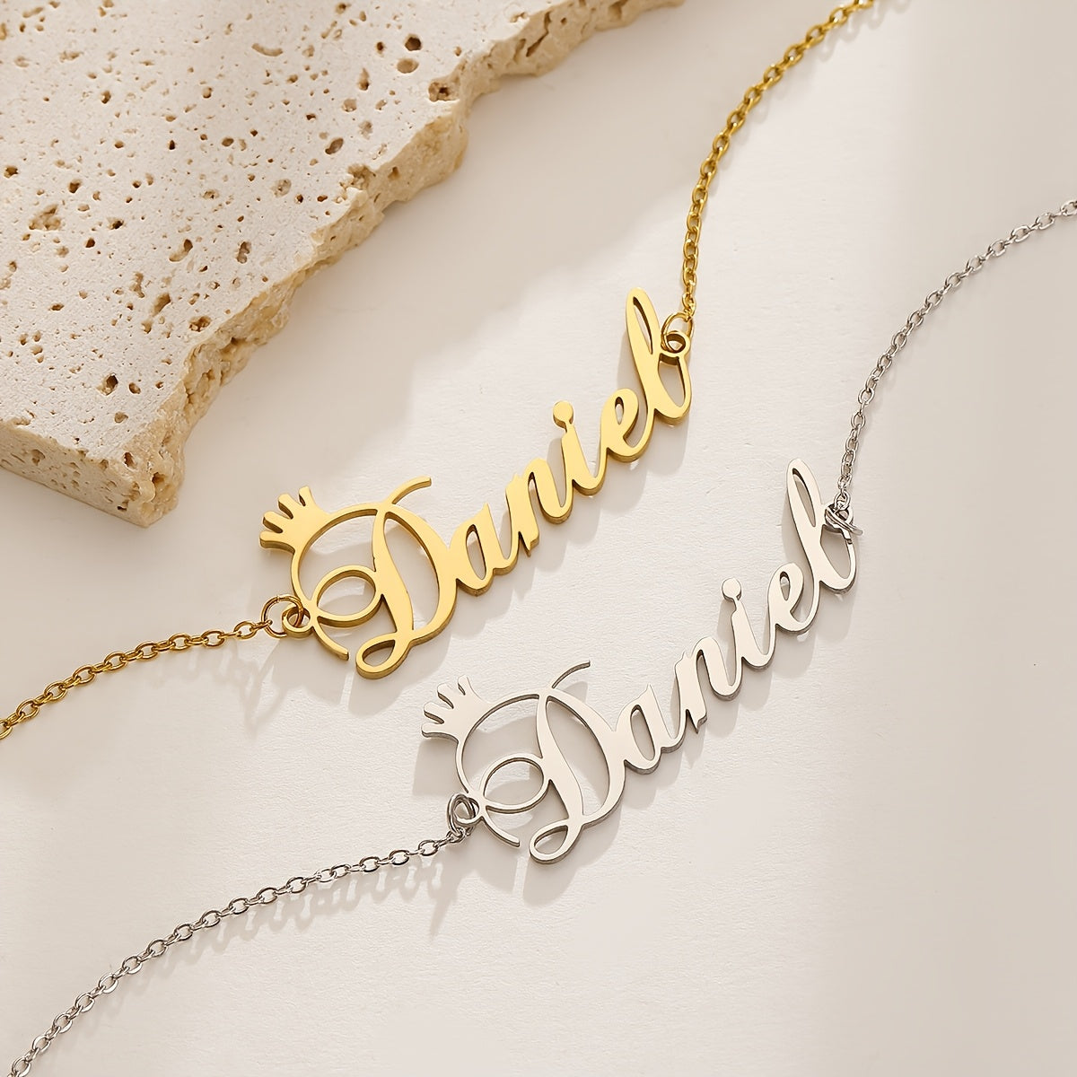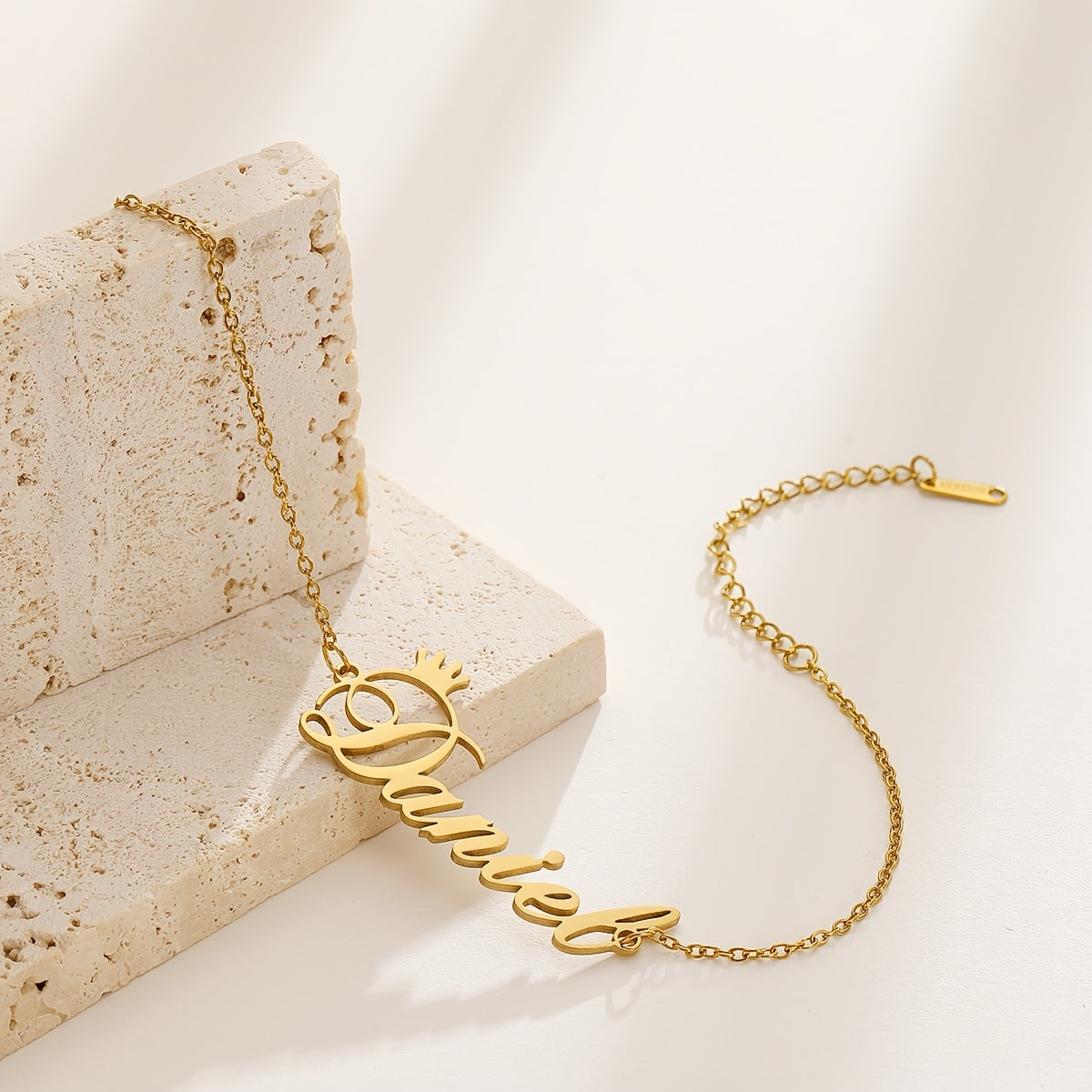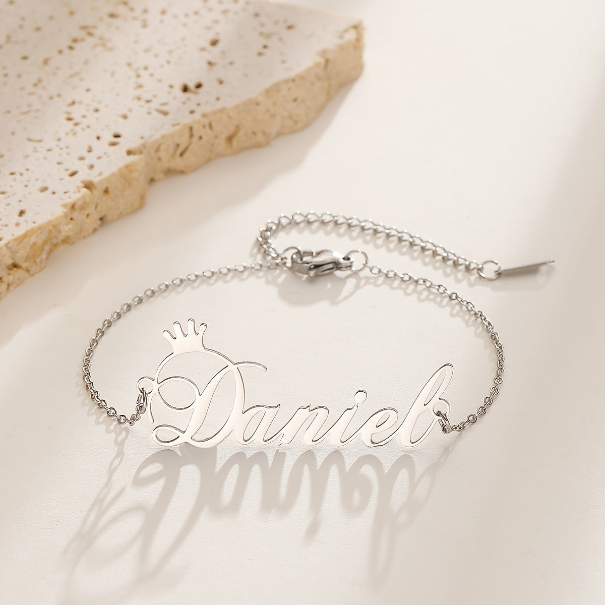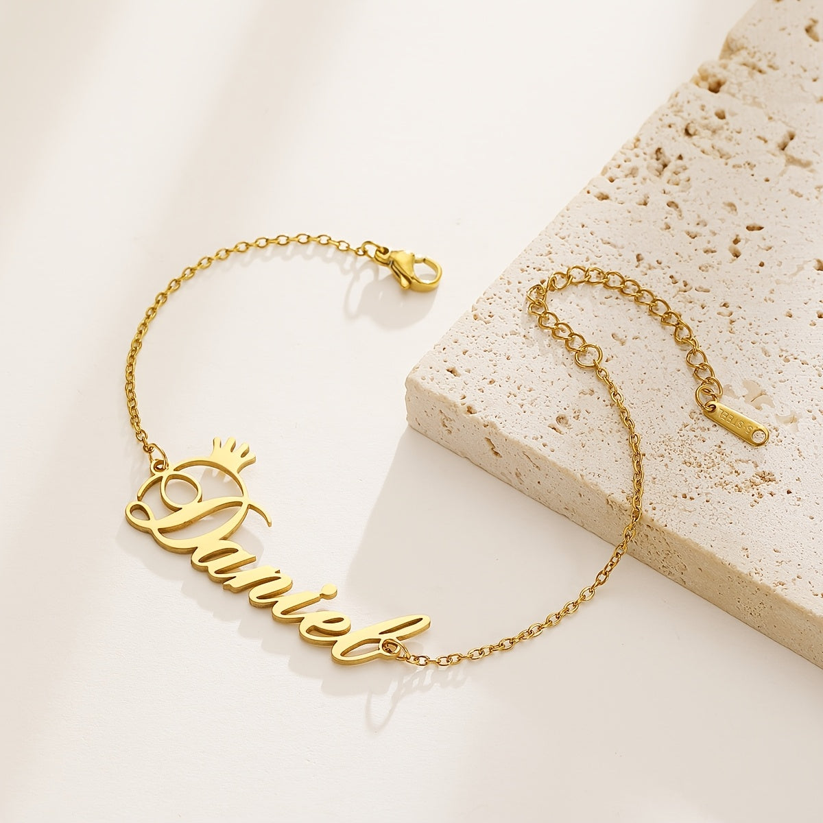This stylish bracelet features a nameplate with a crown design, perfect for adding a personalized touch to your outfit. Customize it with your name or a special word for a unique accessory.
