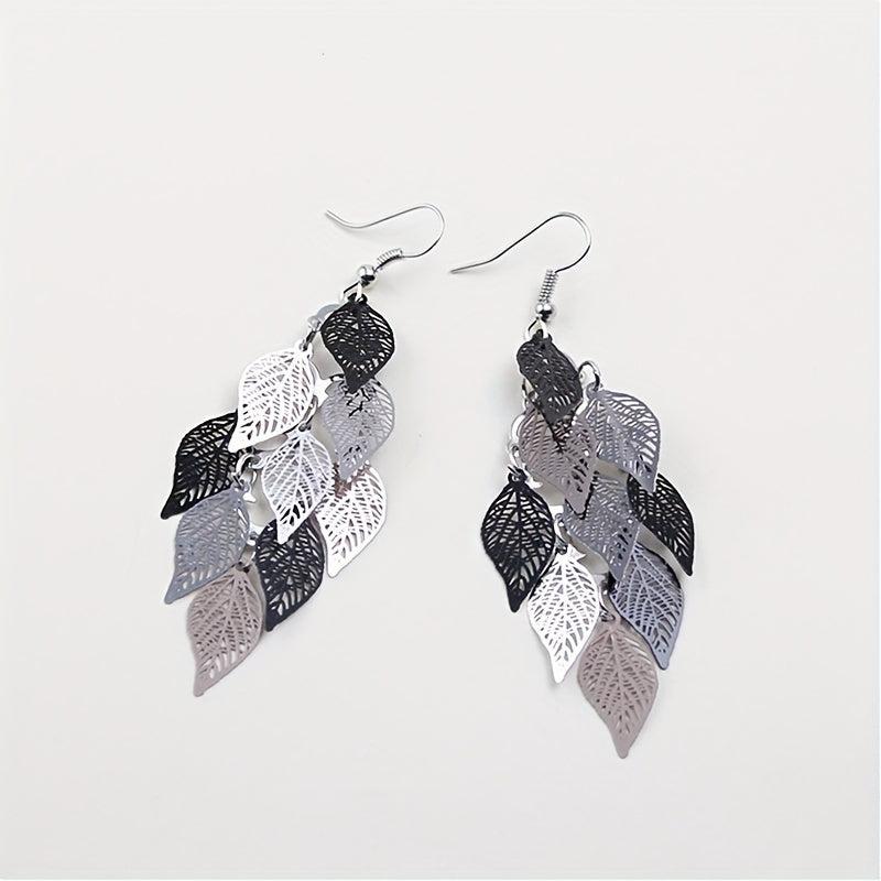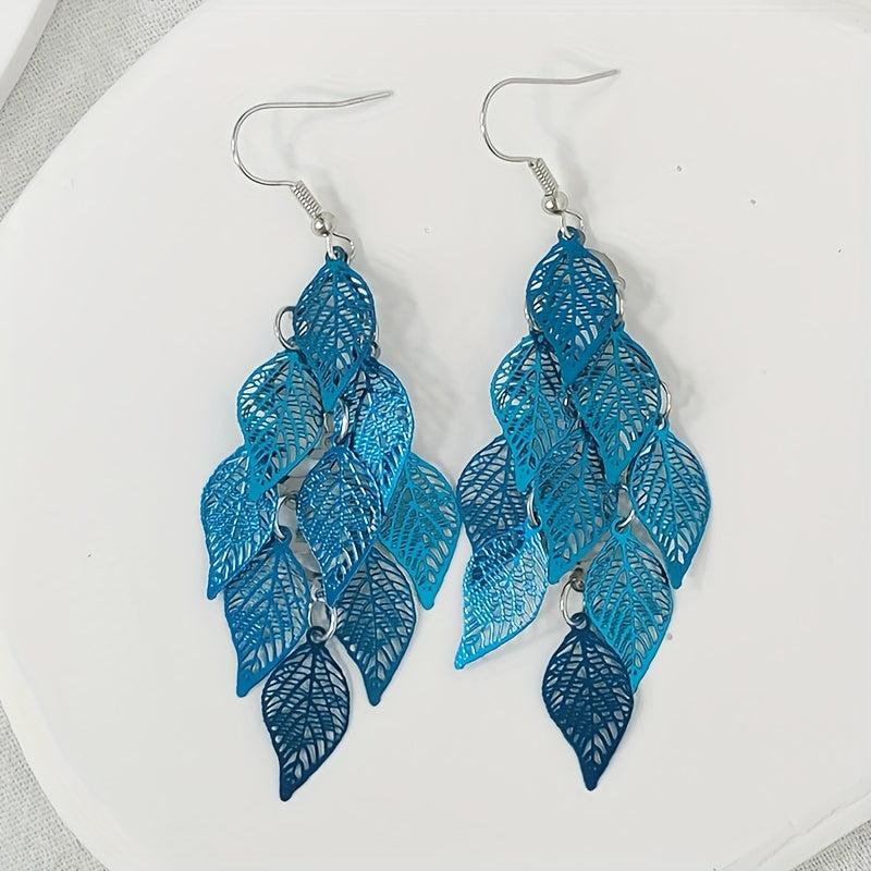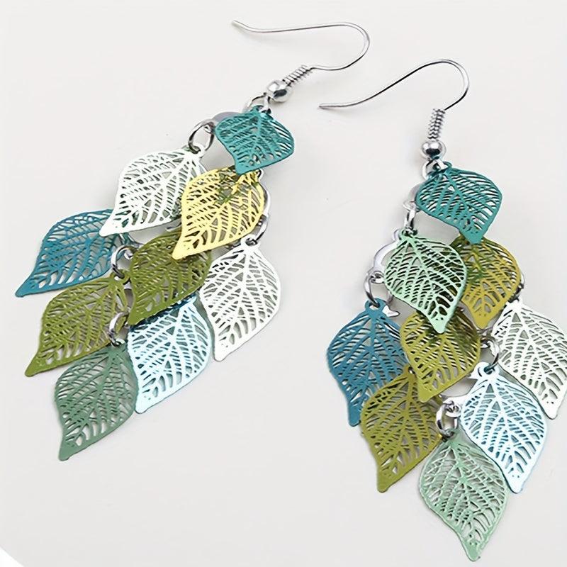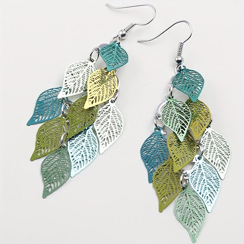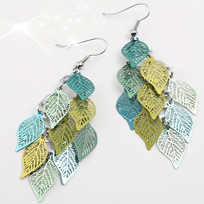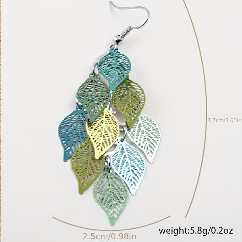 Add a touch of bohemian chic to your outfit with these colorful dangle earrings featuring an iron art hollow leaf design and alloy connection ring.