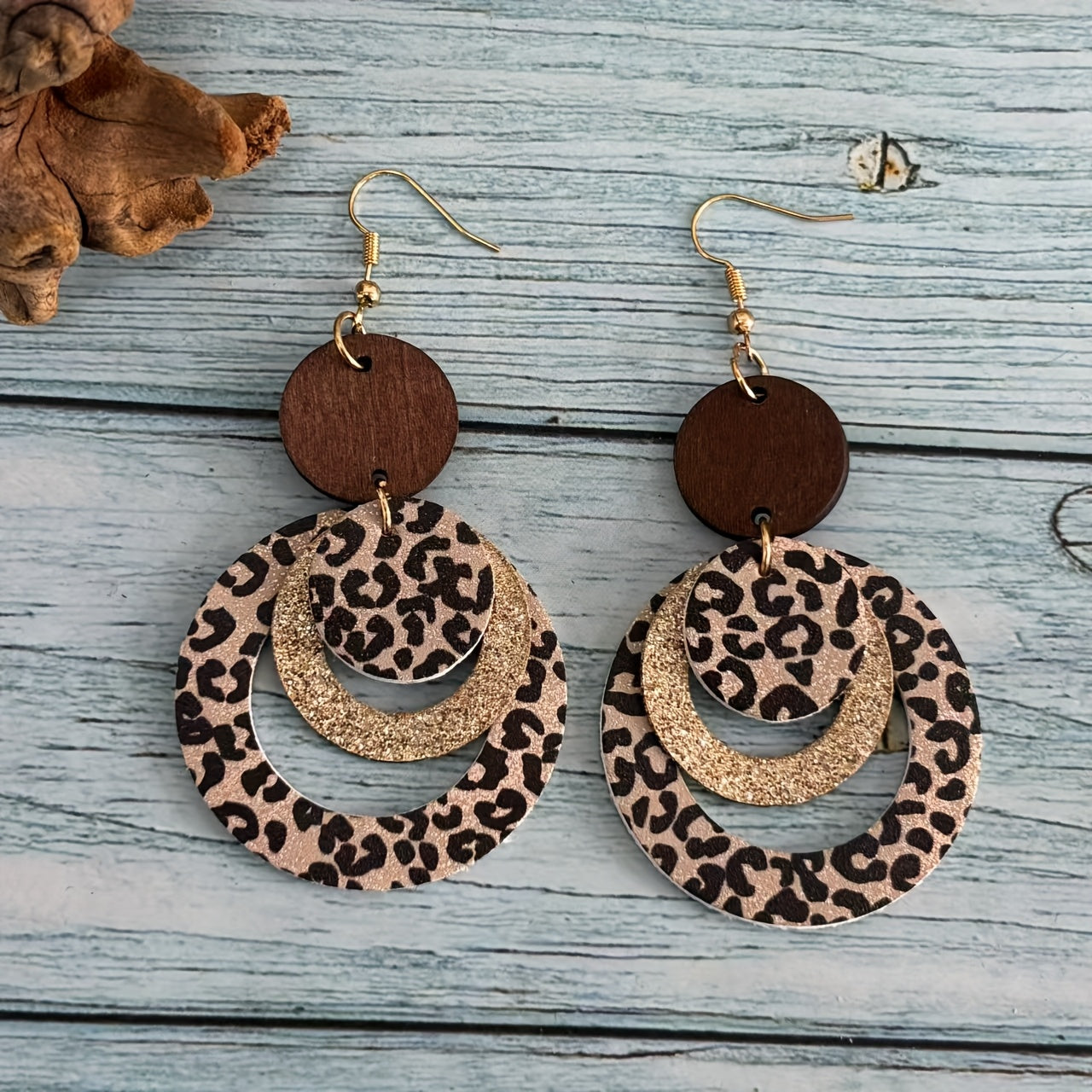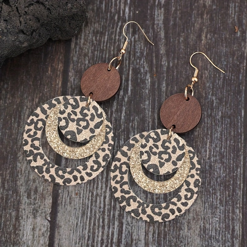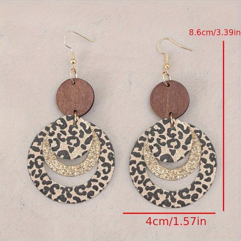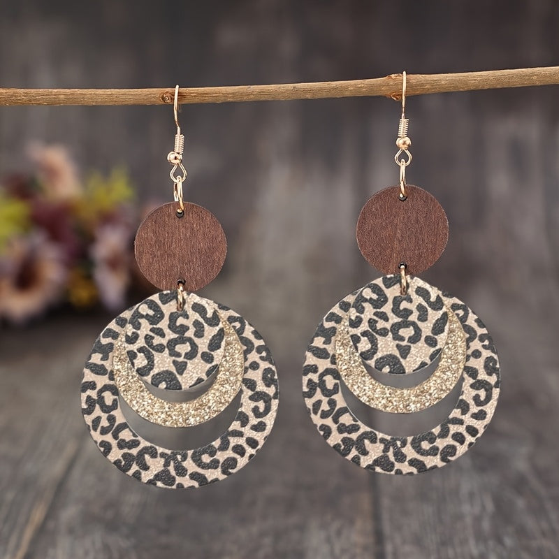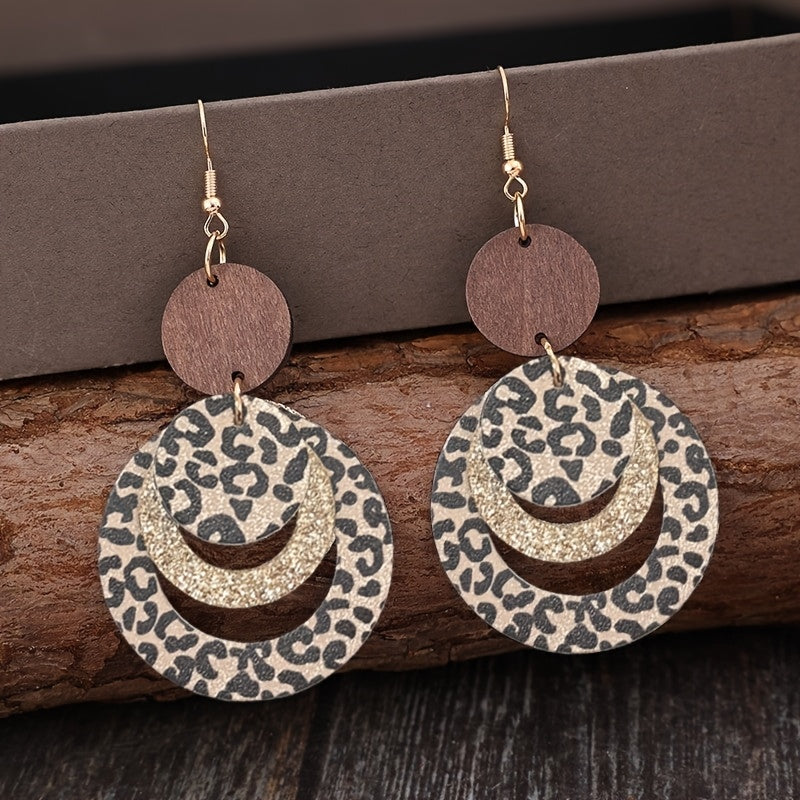 Add a touch of bohemian flair to your casual attire with these round wood earrings featuring a leopard print and glitter layer design accented with golden details.