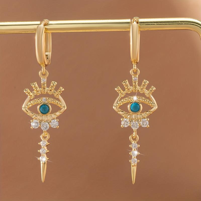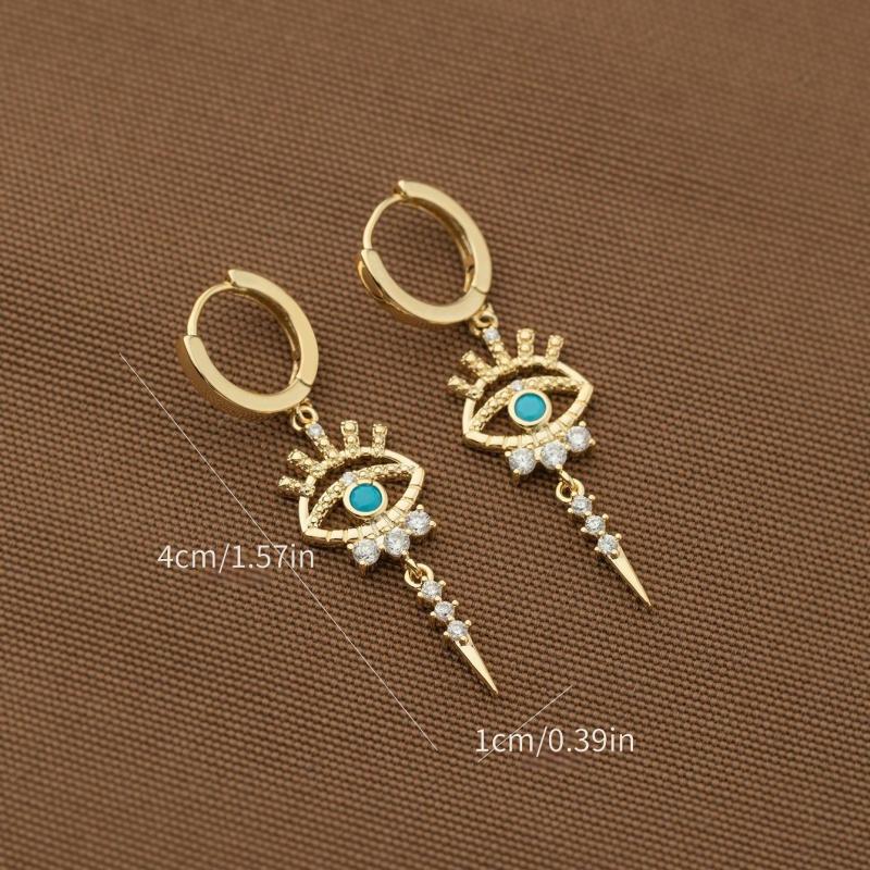 These earrings feature a unique design with copper inlaid synthetic evil eye pendants, making them a perfect gift for a special occasion like a date. The eye-catching design is sure to turn heads and add a touch of mystique to any outfit.