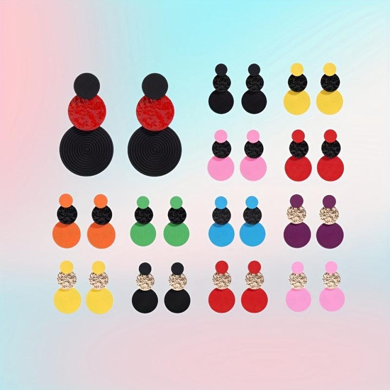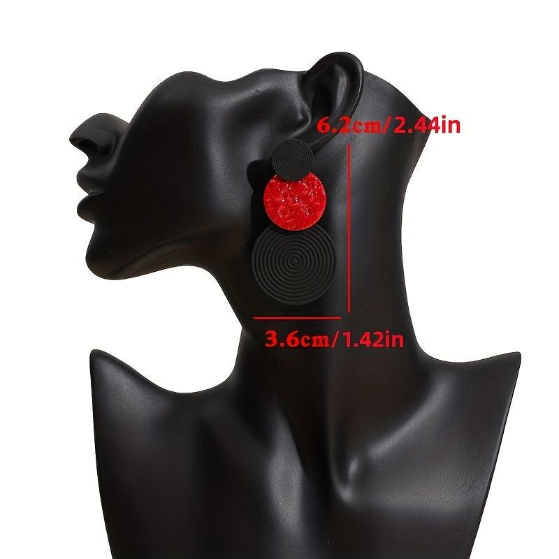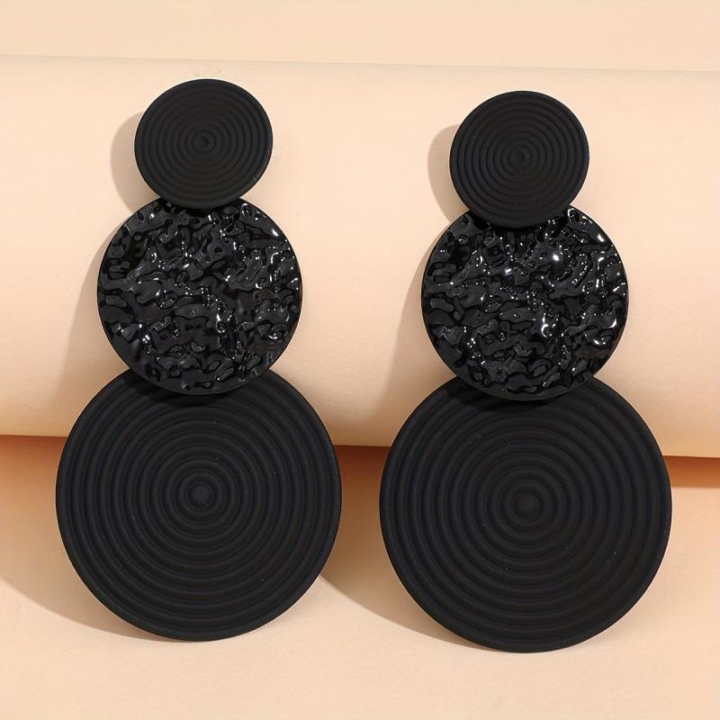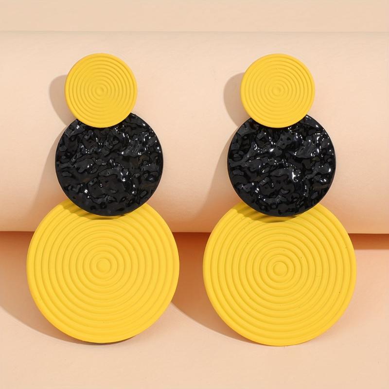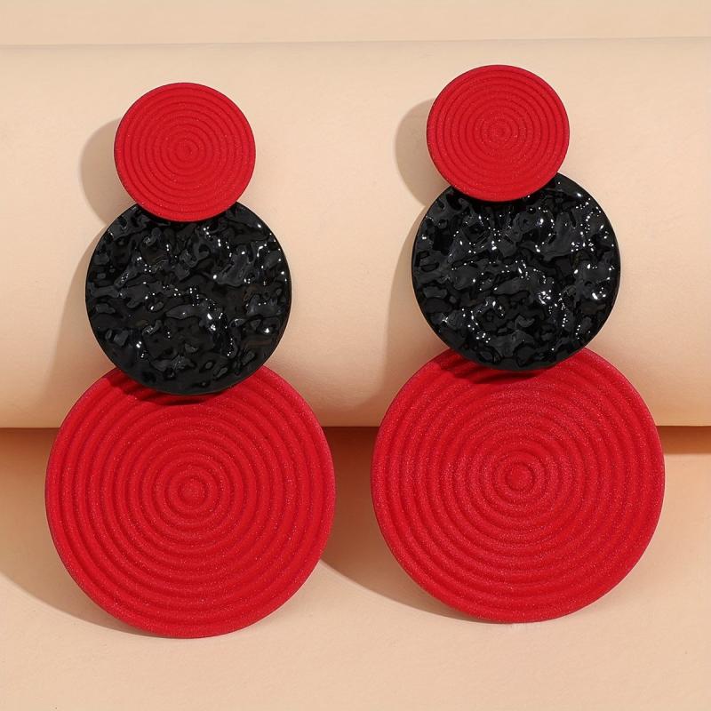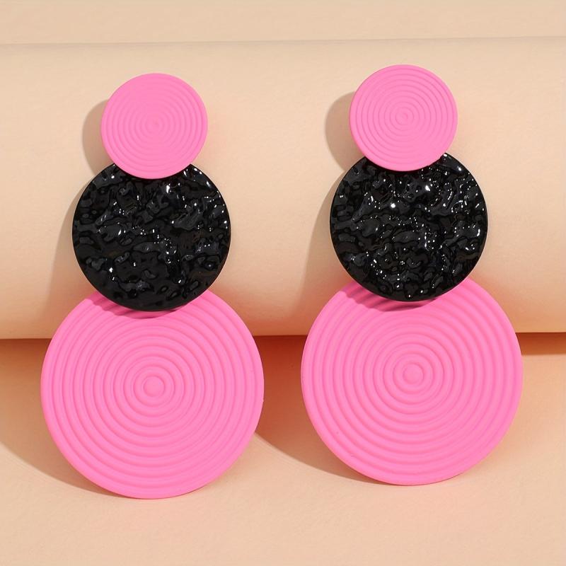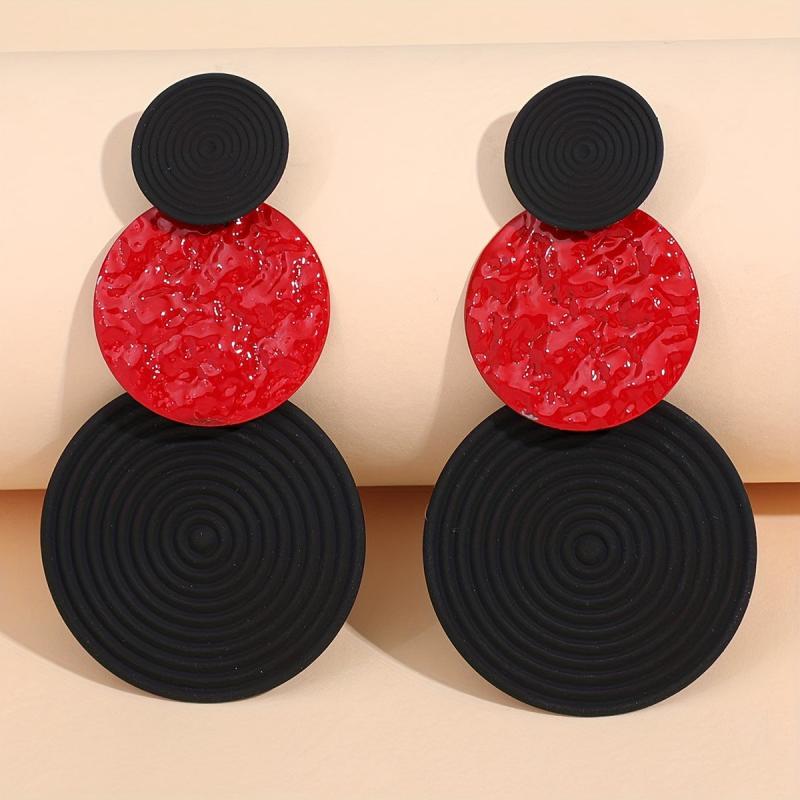Elevate your style with these creative dangle earrings featuring a contrasting geometric round design. Perfect for adding a unique touch to your look.