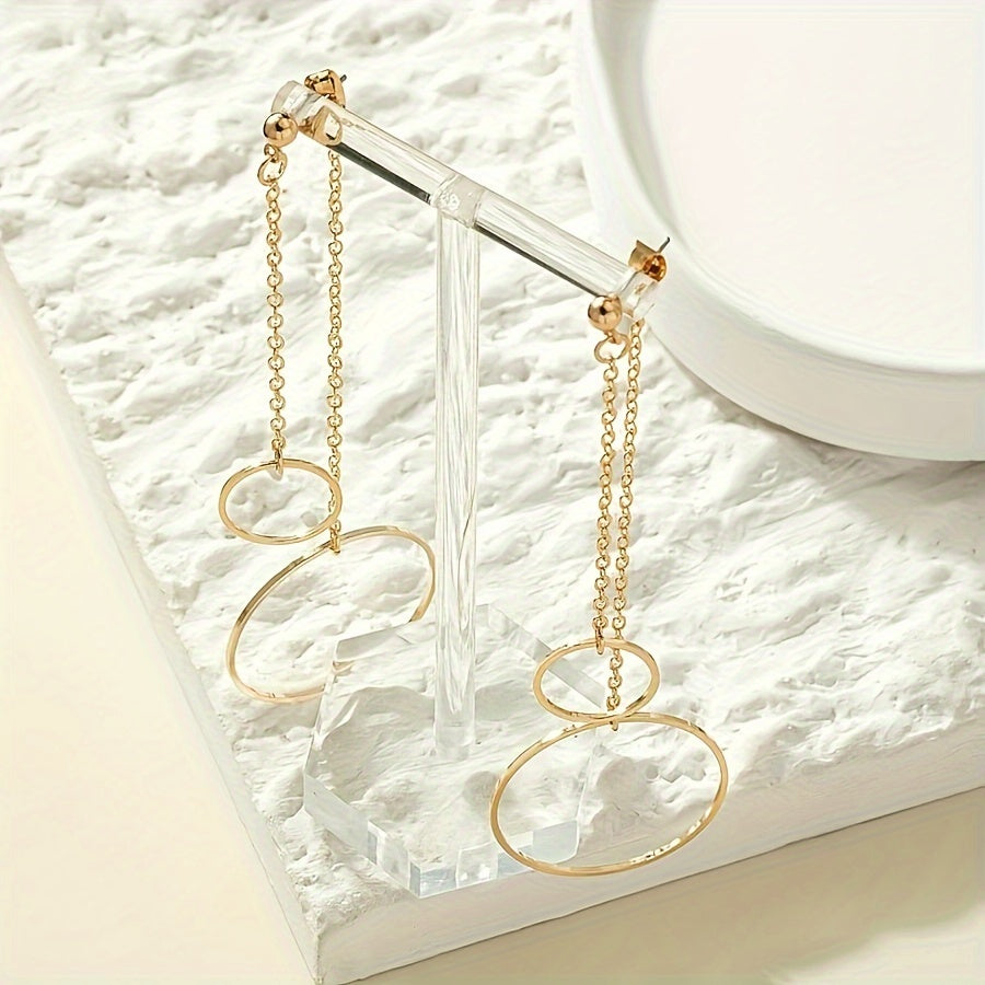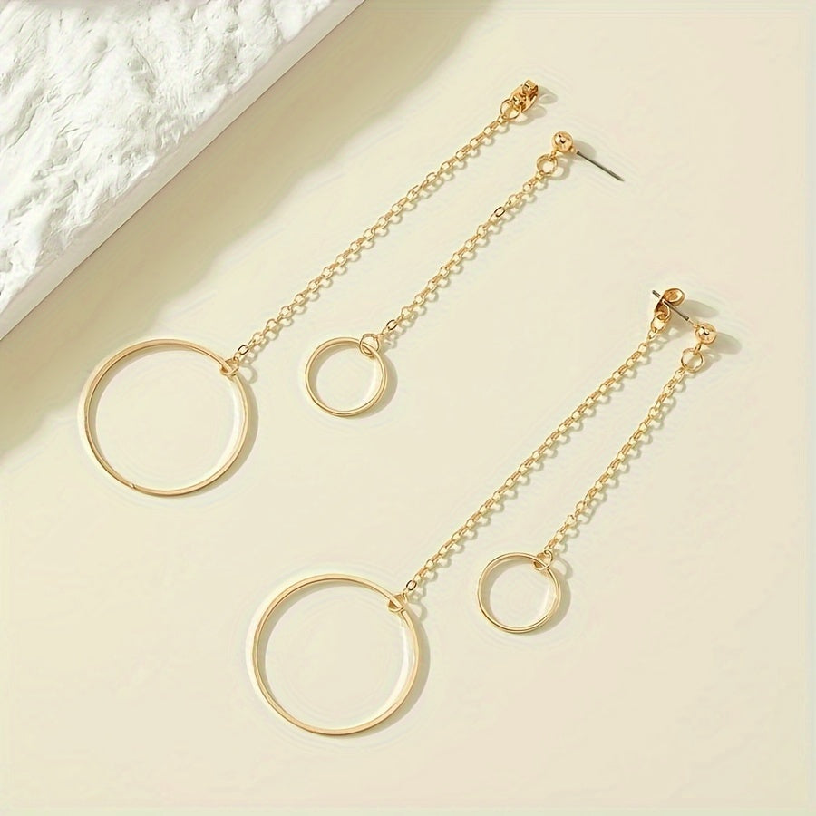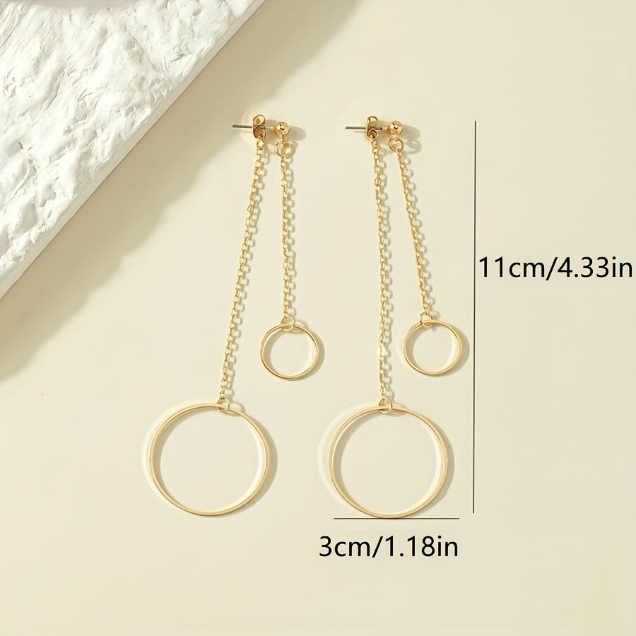 These minimalist long chain earrings feature a stylish geometric round pendant design that can be worn from the front or back. Made with durable iron material, these earrings are a versatile accessory for all seasons.