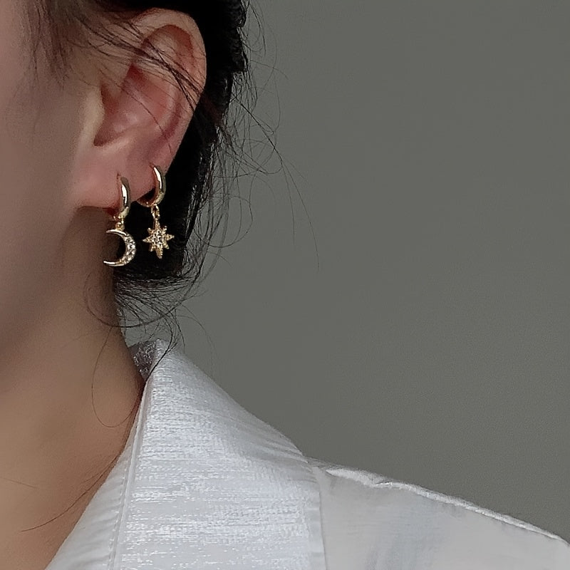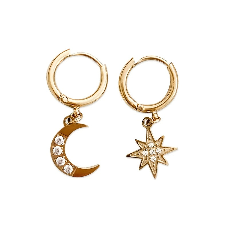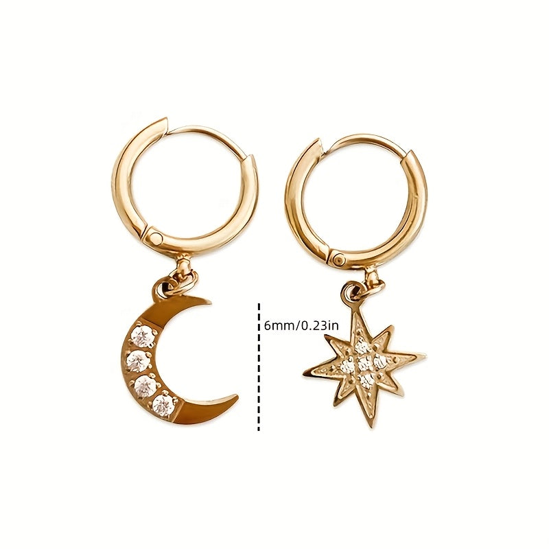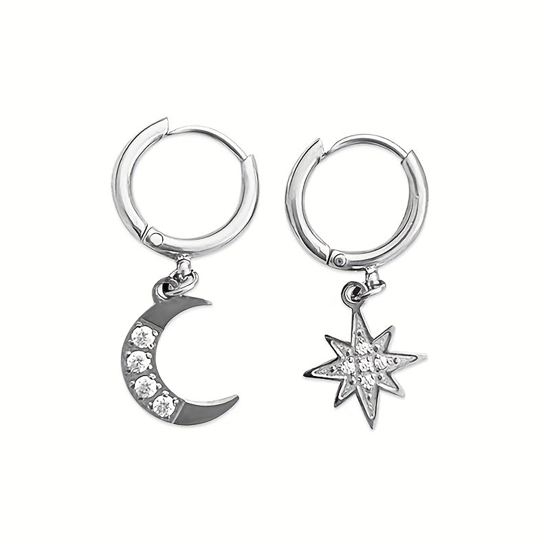 Add a touch of celestial charm to your outfit with these versatile stainless steel hoop earrings featuring a crescent moon and star design. Perfect for everyday wear and special occasions.