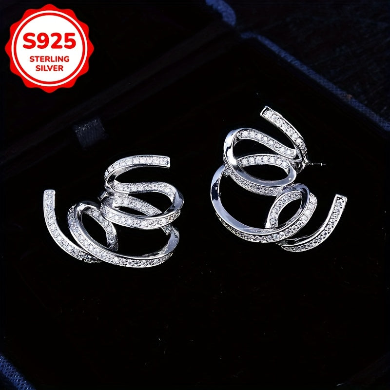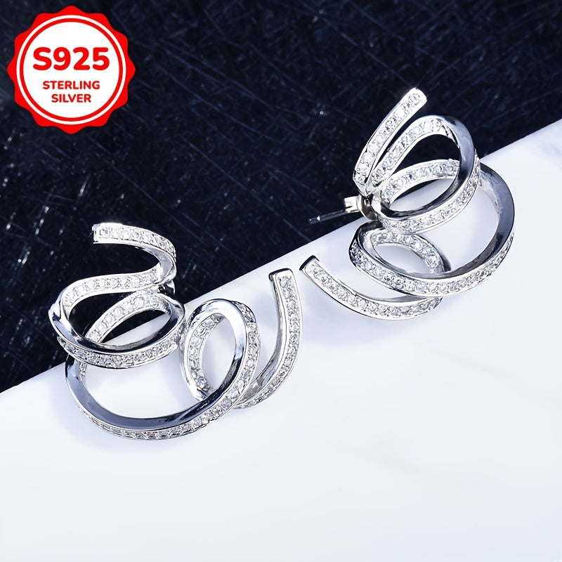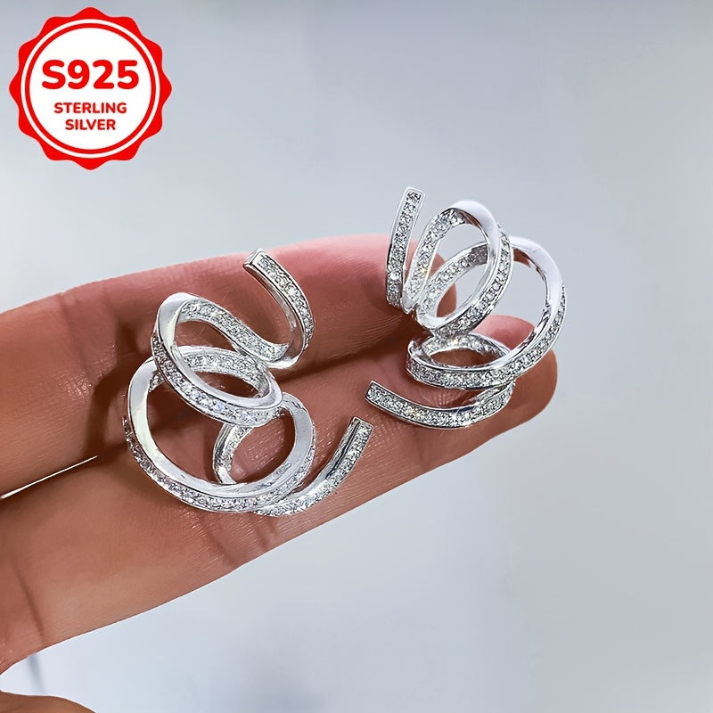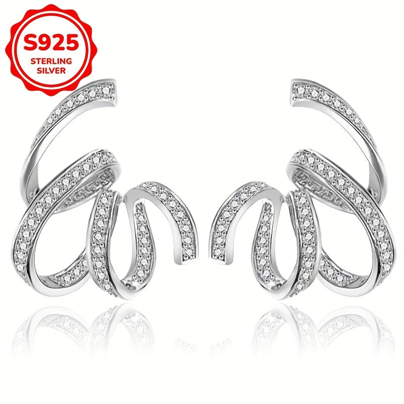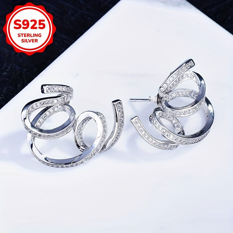 These stylish stud earrings feature an exaggerated design with unique lines wrapped in zirconia, perfect for daily wear or parties. Made of 925 silver, lightweight at 5g, ideal for Holi celebrations.
