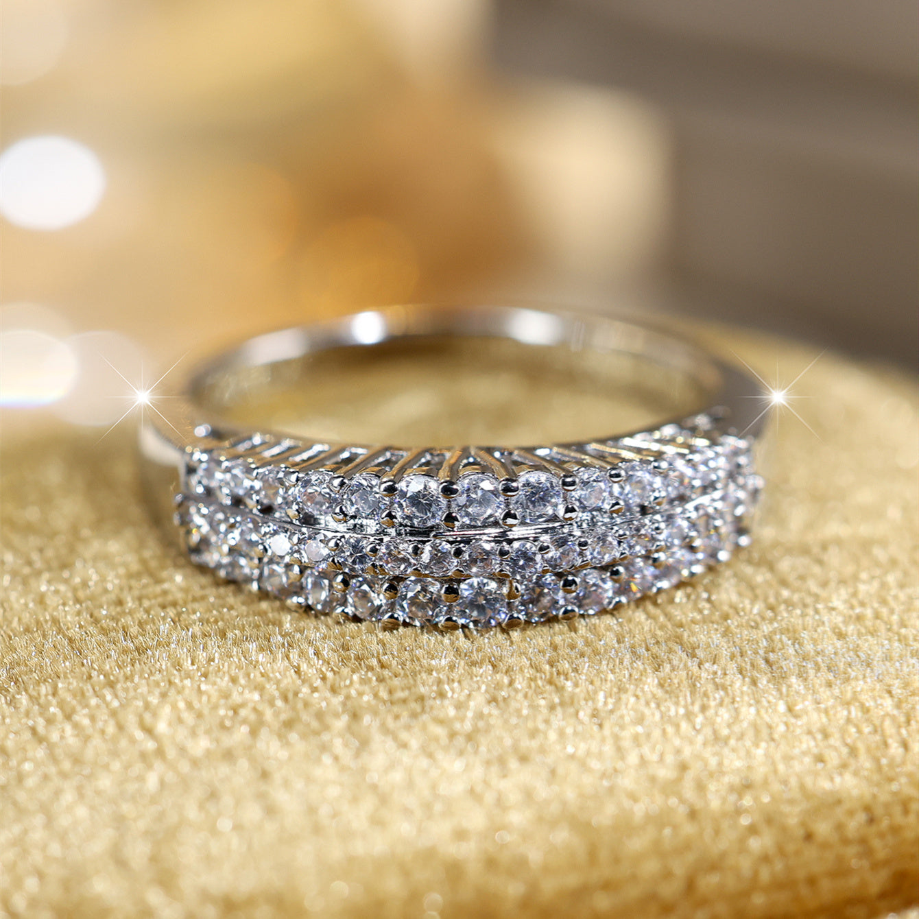 This stunning synthetic zirconia ring is perfect for brides on their special day. It features three rows of dazzling stones that add a touch of glamour to any outfit.