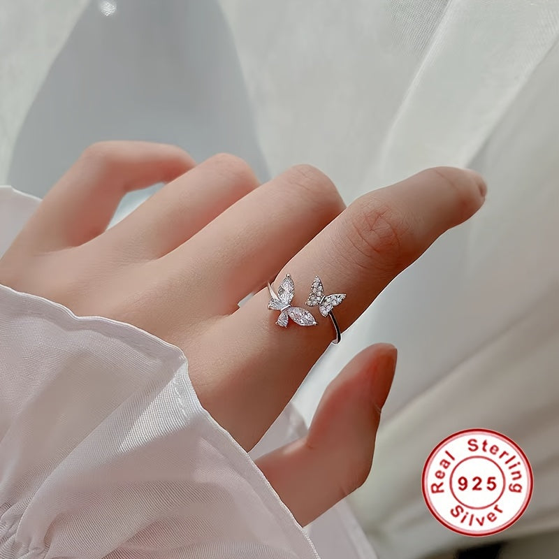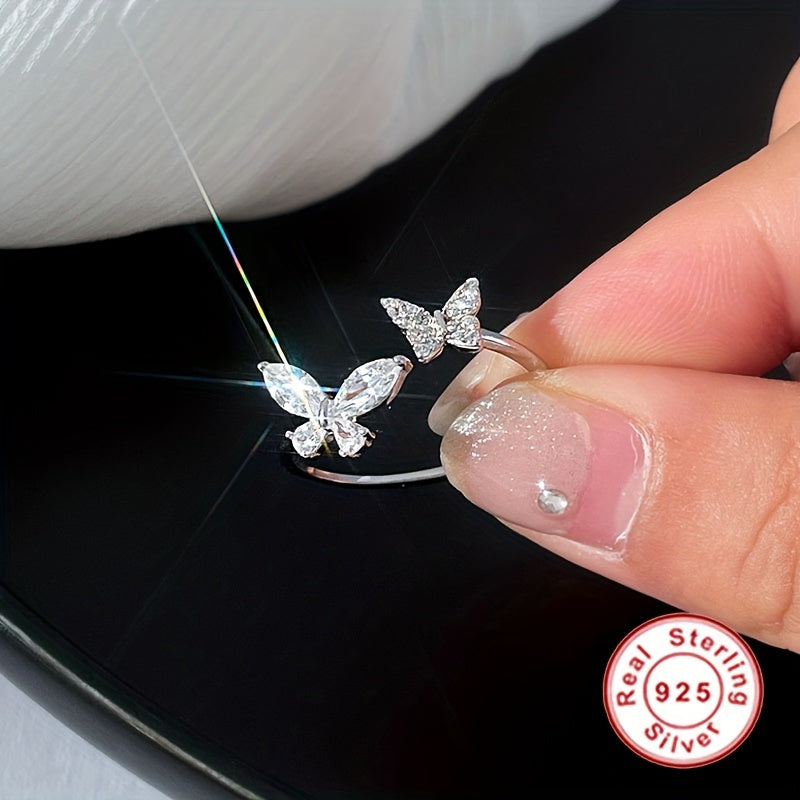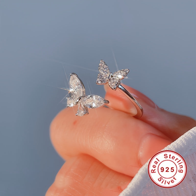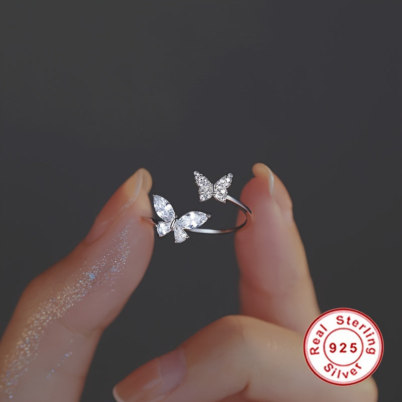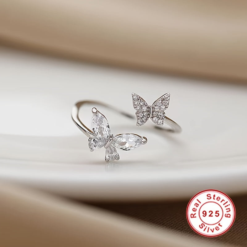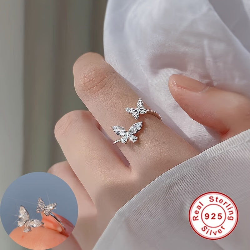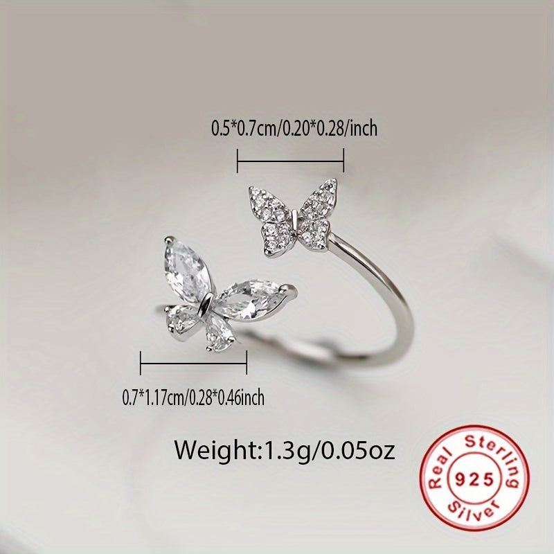 This 925 sterling silver butterfly ring features synthetic cubic zirconia on an adjustable open band. Versatile for daily wear and makes an ideal gift for Thanksgiving and anniversaries.