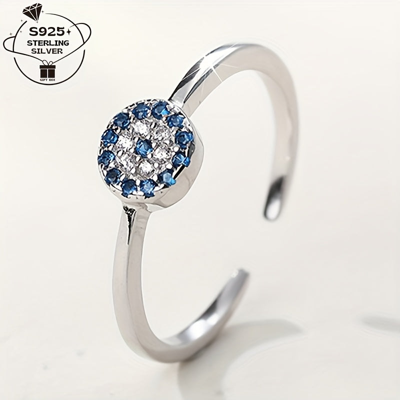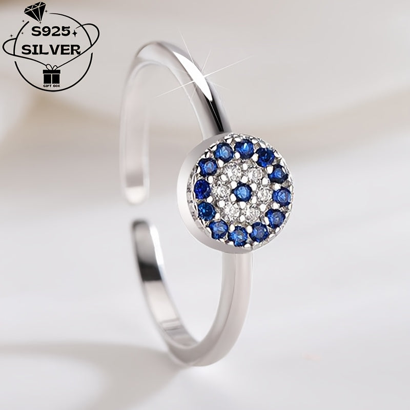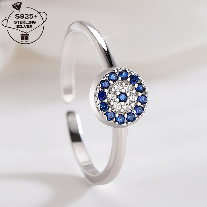 This stylish 925 Sterling Silver adjustable ring features an Evil Eye design with synthetic and zirconia stones. Symbolizing protection and strength, it is suitable for daily wear and is hypoallergenic.
