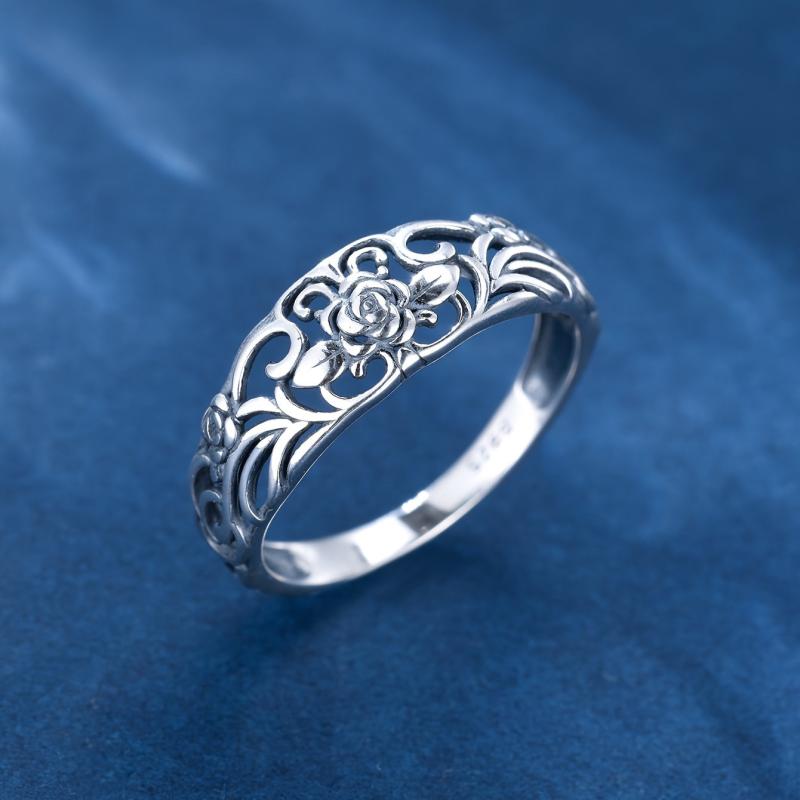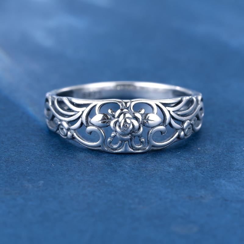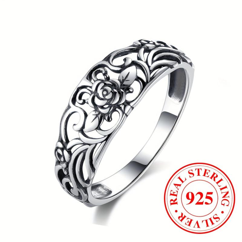 This delicate 925 sterling silver ring features a rose symbol, representing beauty and romance. Perfect for engagements and weddings.