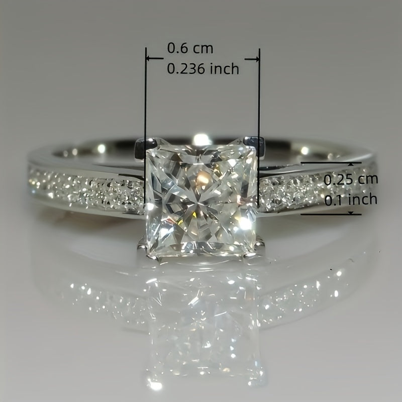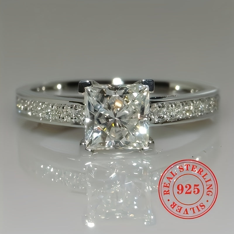 Elegant 925 sterling silver ring featuring a classic 4 prong setting with a princess square cut synthetic zirconia stone, perfect for proposals and weddings.