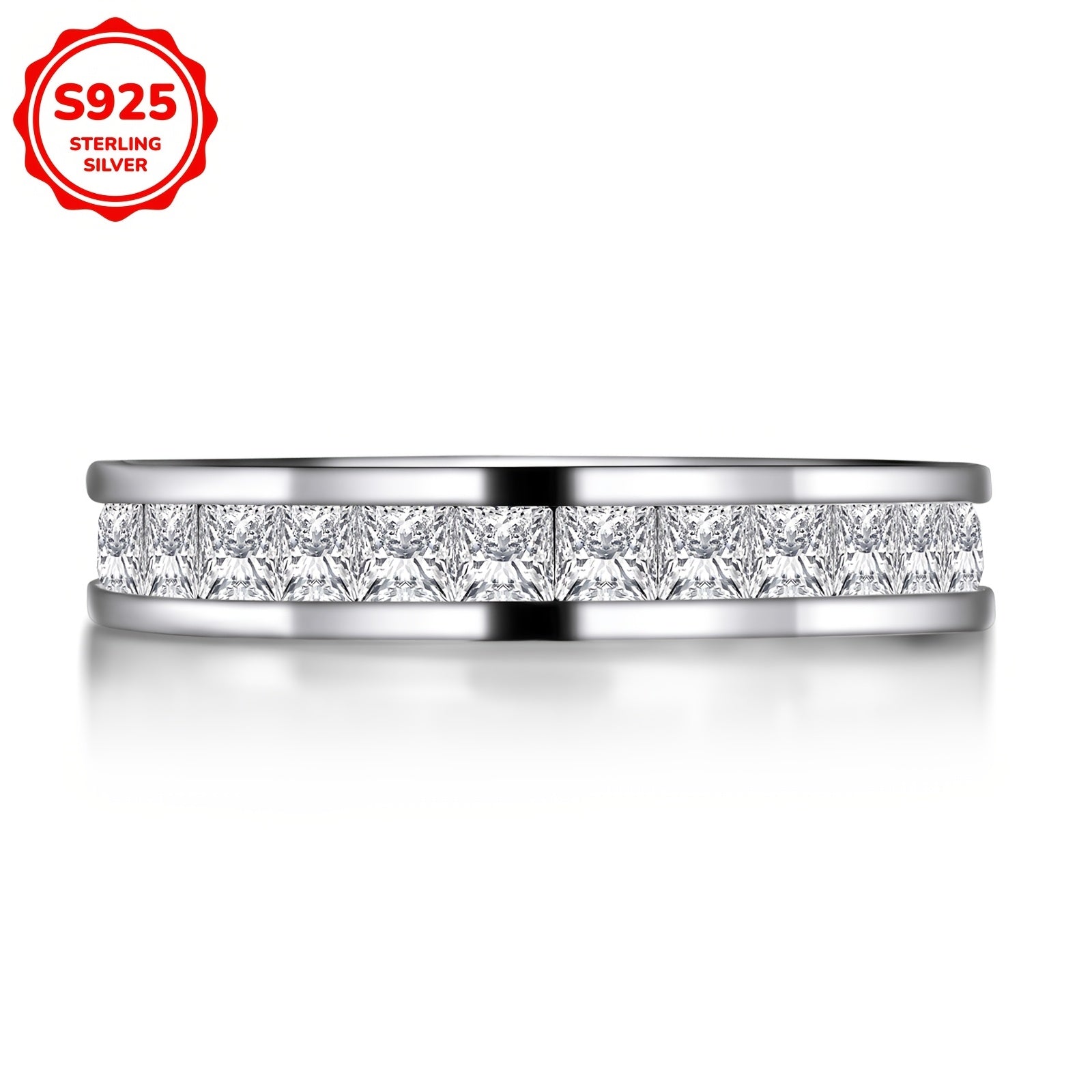 This stunning engagement ring features a princess-cut cubic zirconia stone set in 925 sterling silver. The full band design adds elegance and sophistication to any outfit.