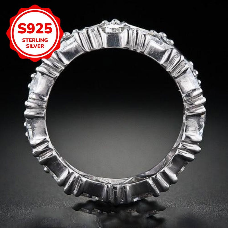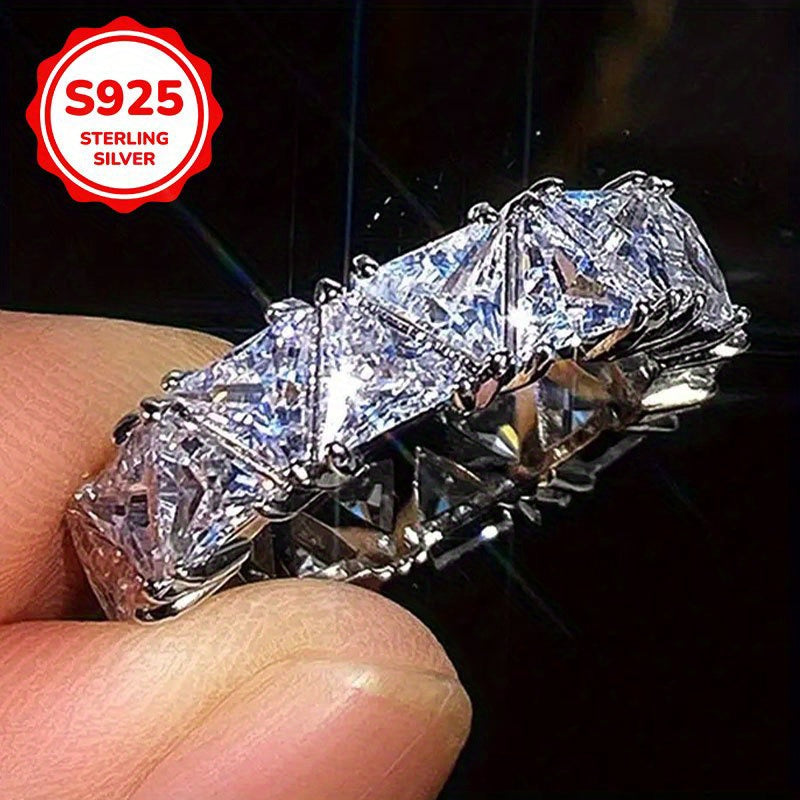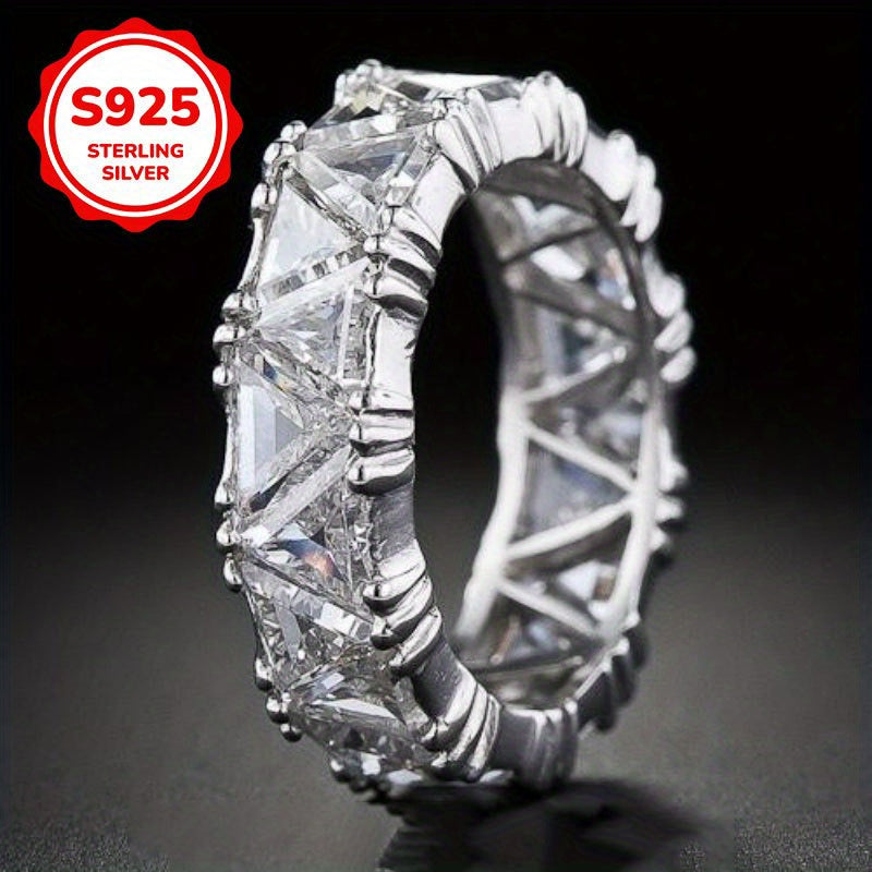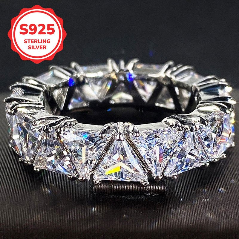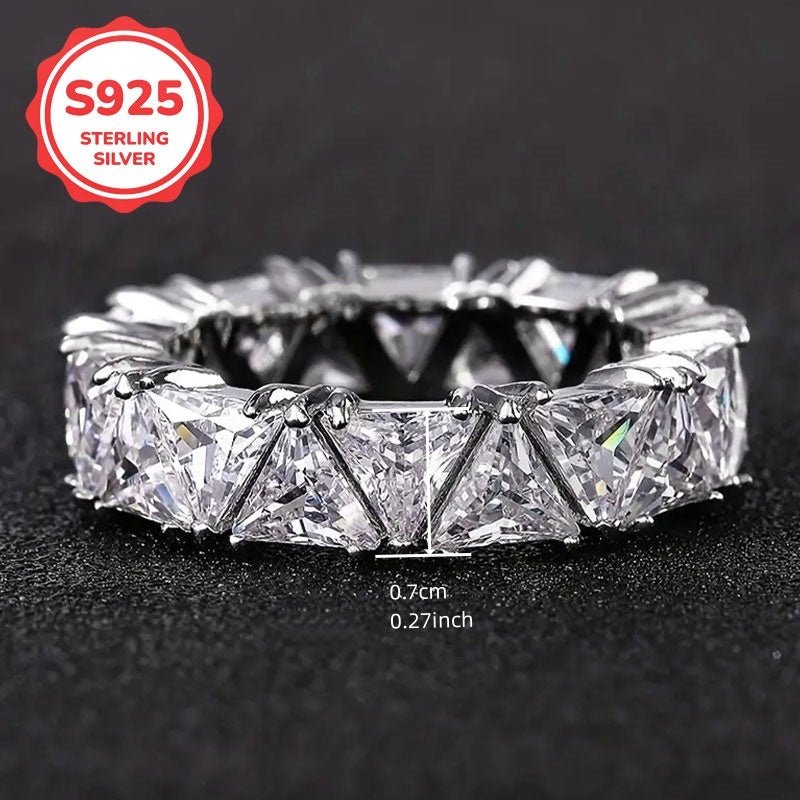 Beautiful eternity ring made of 925 sterling silver with a triangular zirconia stone. Rhodium plated for a long-lasting shine. Perfect for daily wear or as a wedding band. Features an April birthstone.
