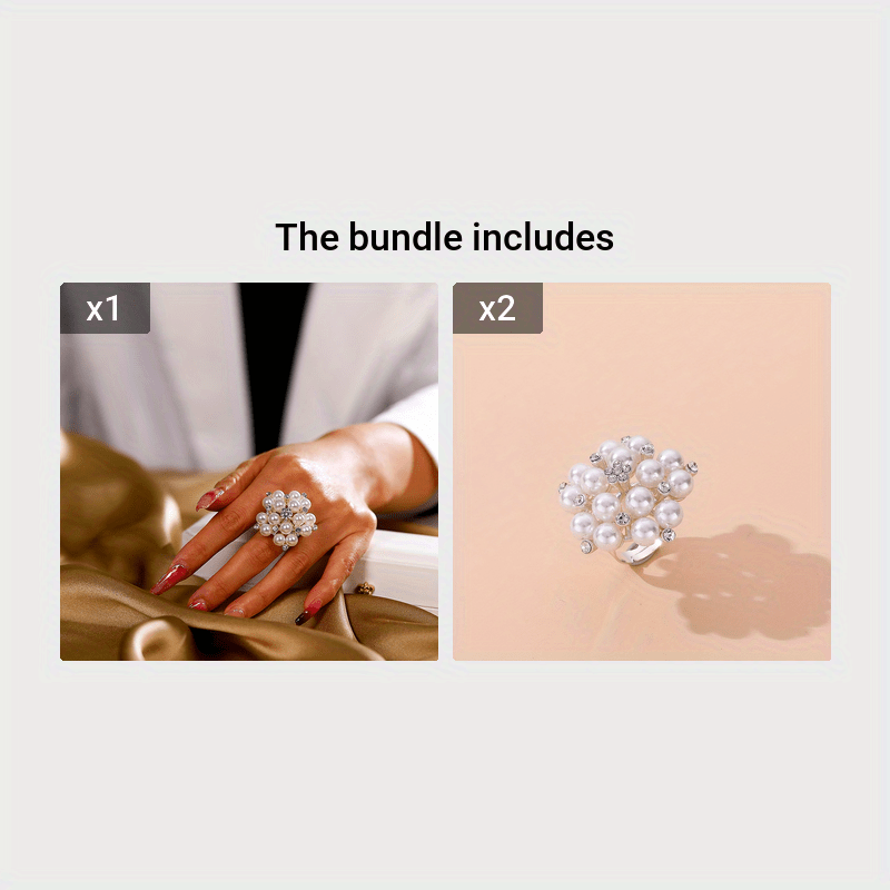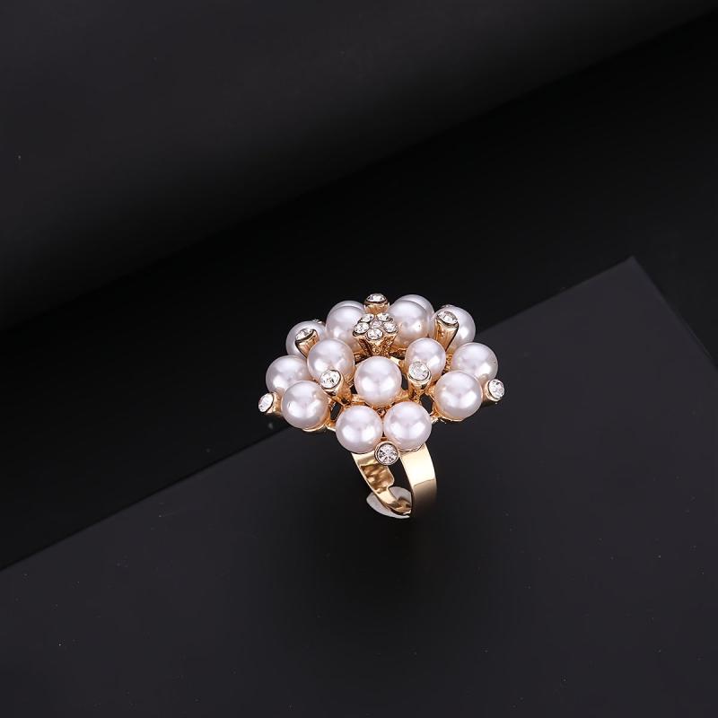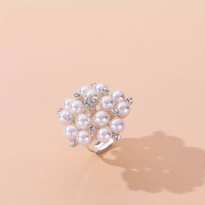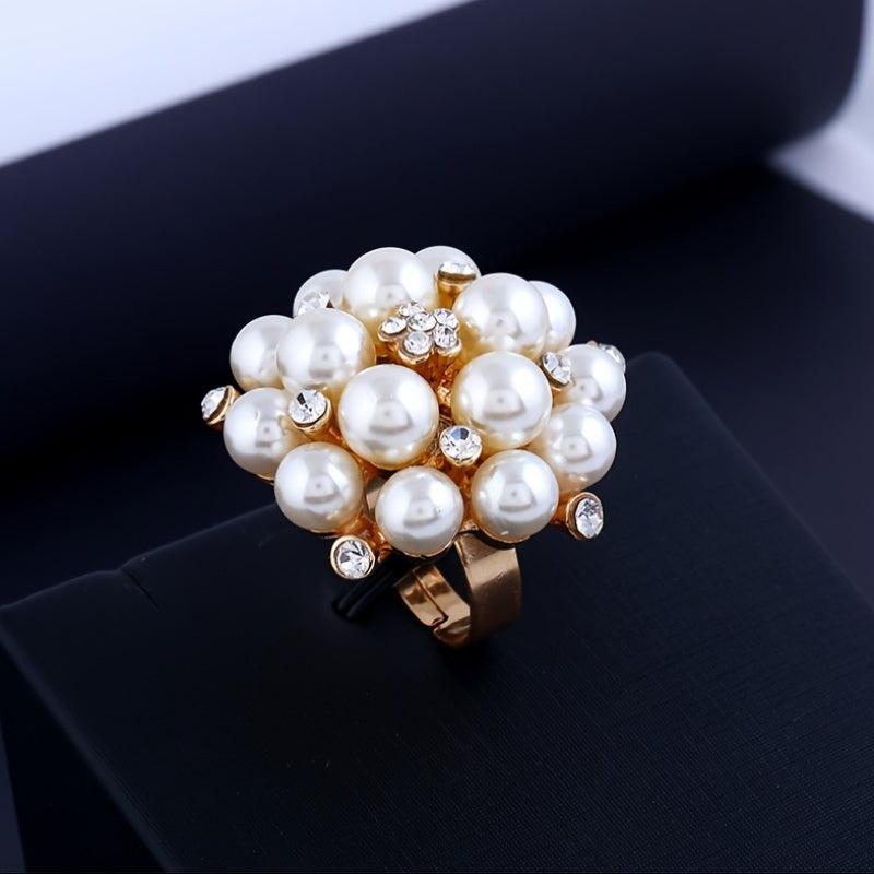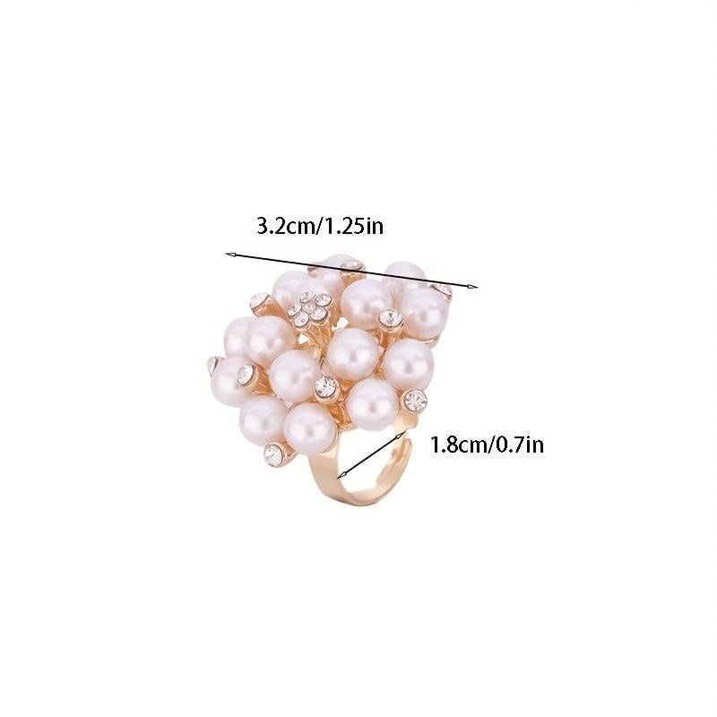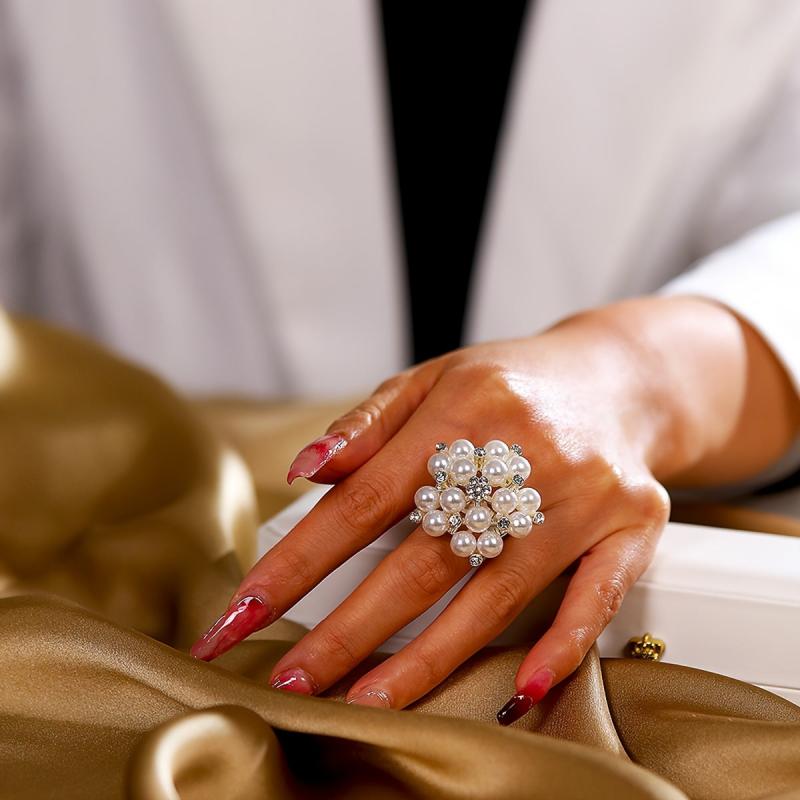 This ring is a perfect blend of elegance and style, featuring rhinestones and faux pearls. It can be adjusted to fit both slender and wider fingers, making it a versatile accessory for any occasion.