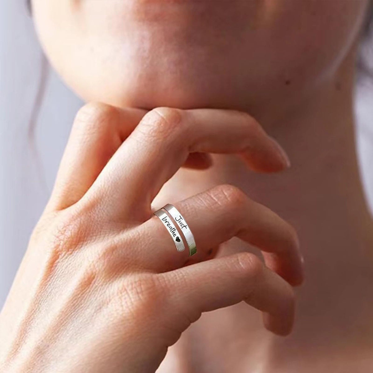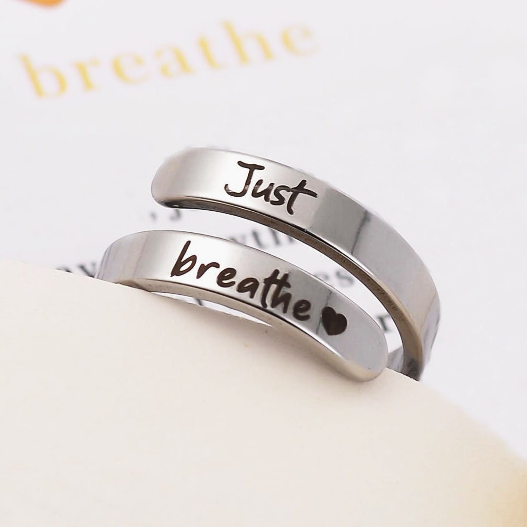 Elegant and versatile stainless steel cuff ring featuring a heart design with 'Just Breathe' engraving. Perfect for everyday wear and special occasions.