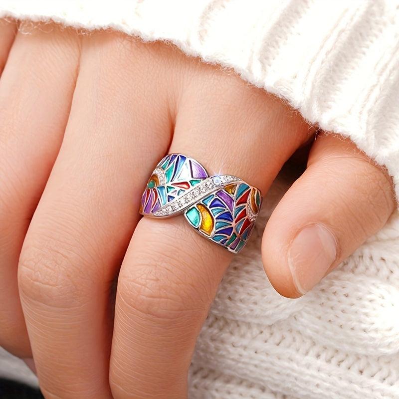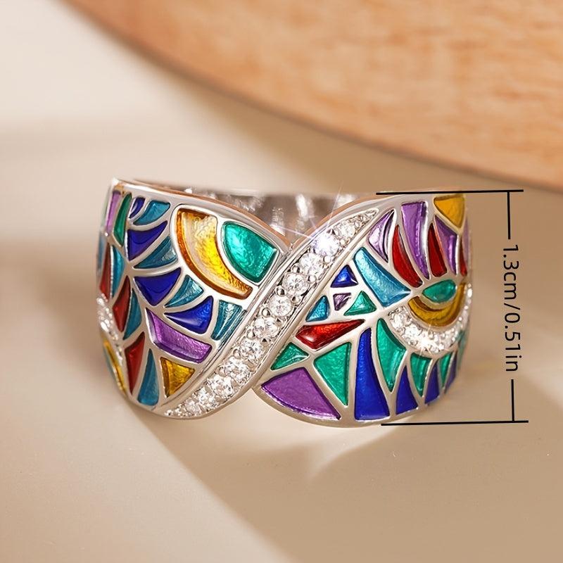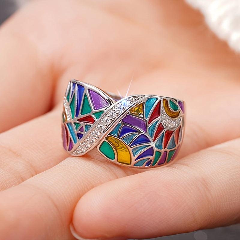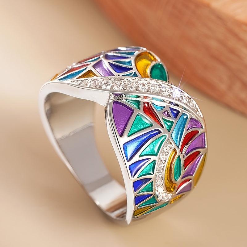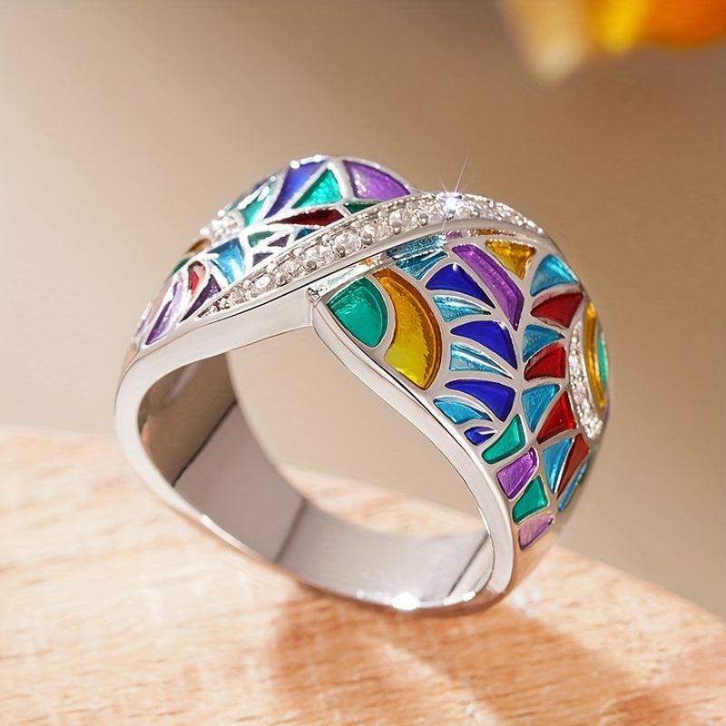 Add a touch of bohemian flair to your look with this unique ring adorned with colorful synthetic gemstones and cubic zirconia. Perfect for women who love vibrant accessories.